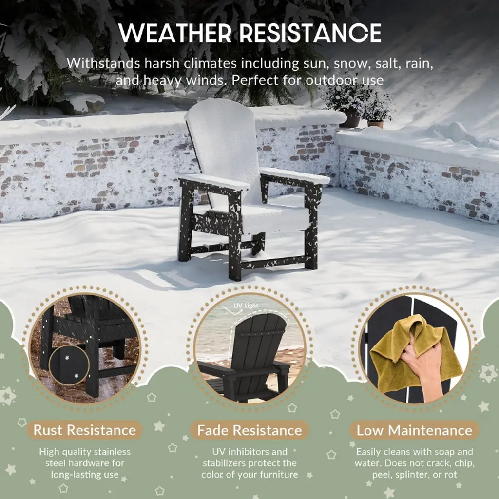 Add a little charm to your exsisting outdoor Adirondack chair with our kids plastic Adirondack chair and side table that will complete your family set. Our toddler Adirondack side table and chair are created from a durable HDPE that is safe for your little ones. Designed for safety and weather resistance with the smooth edges that ensure that your little ones don't get any scrapes or scratches and the all-weather resistant material is perfect thanks with it UV and Fade resistant that will keep that charming color season long. Place all your litte ones drink atop of the 12"inch wide side table. Create that picture perfect family setting by matching our child Adirondack chair with a regular adirondack chair.While we strive to accurately represent product colors, please be aware that actual colors may vary slightly due to individual screen settings and lighting conditions. FeaturesSet Includes: One (1) Kids Adirondack Chairs and One (1) Kids Side TableConstructed from Durable HDPE Material that is Safe for your Little Ones and Designed to be Stable and SturdyWeather Resistant to Protect Against the Harsh Outdoor ElementsFade and UV Resistant to Protect Against the SunCurved Backrest with a Reinforced Backrest Beam for Added Safety and 15" Inch Wide Seat for Plenty of Seating Space for your Little OnesDurable and Strong Material that is Resistant to Cracks and SplintersSimple to Clean with Luke Warm Water, Soap, and a Soft Bristle Brush to Clean up your Little Ones Creative DrawingsDetails:Product Type: Adirondack ChairsWhat's Included: (1) Adirondack Chair; (1) Side TableAdirondack ChairDimensions: 21" W x 23.5" D x 31" HWeight: 26.5 lbs.Seat Width: 15"Seat Depth: 13.5"Seat Height: 12.5"Weight Capacity: 300 lbs.Table Top Width: 12"Table Top Depth: 12"Table Top Thickness: 0.75"Side TableDimensions: 12" W x 12" D x 15.75" HWeight: 8 lbs.Table Top Width: 12"Table Top Depth: 12"Table Top Thickness: 0.75"