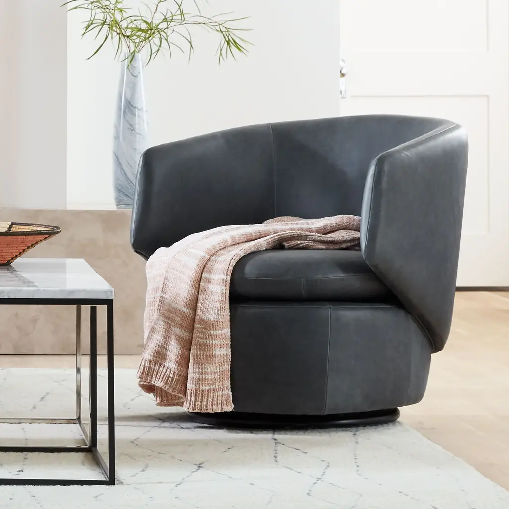 We love the wraparound comfort of our modern Crescent Swivel Chair. A contemporary update to the classic drum chair, it's great for TV viewing and easy conversation. Its durable, contract-grade frame comes covered in top-grain leather.
