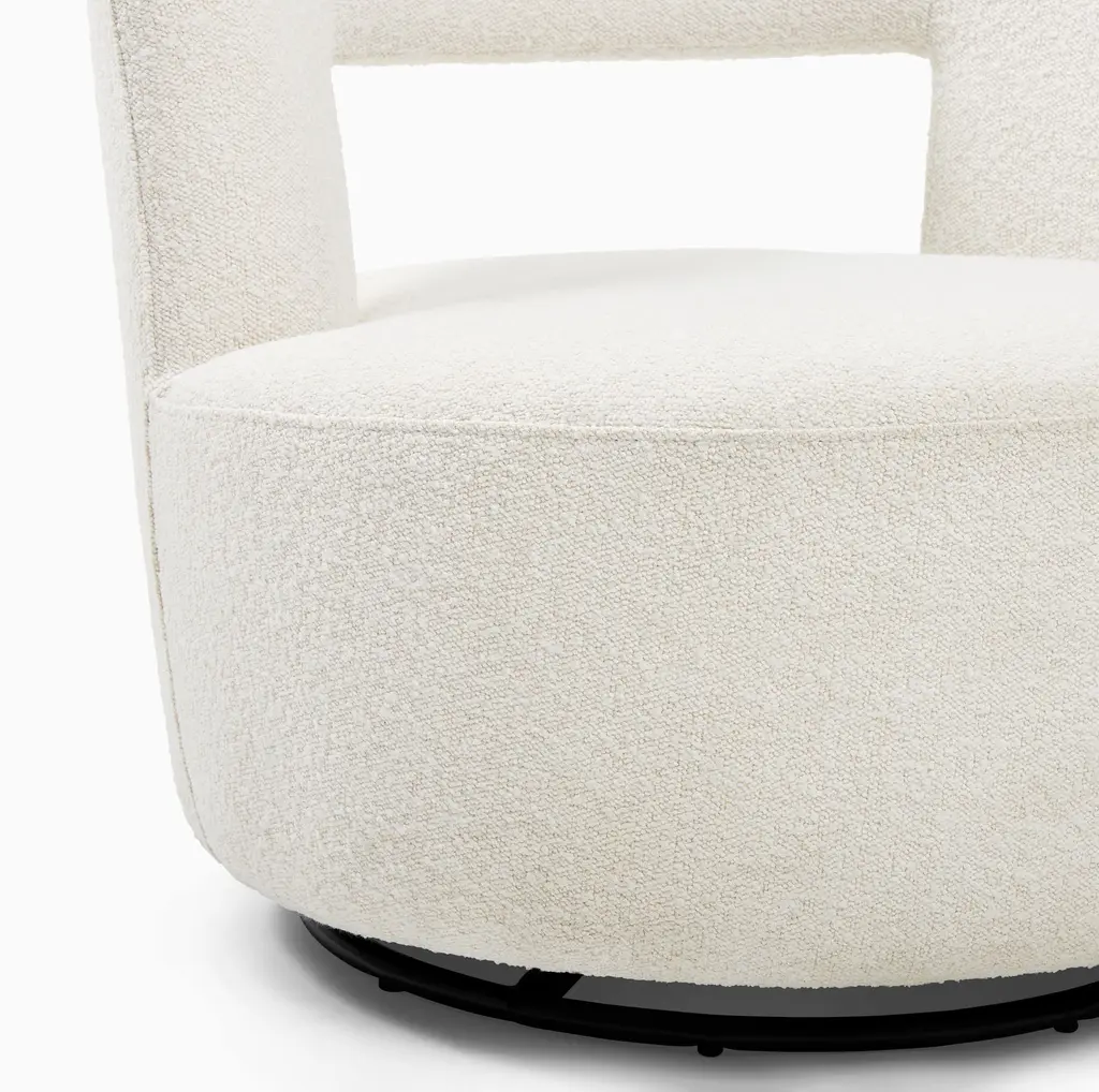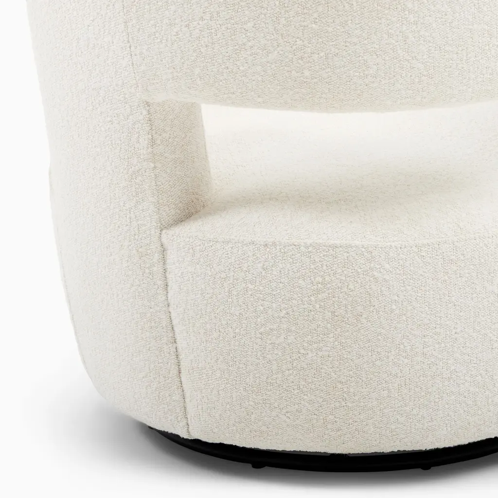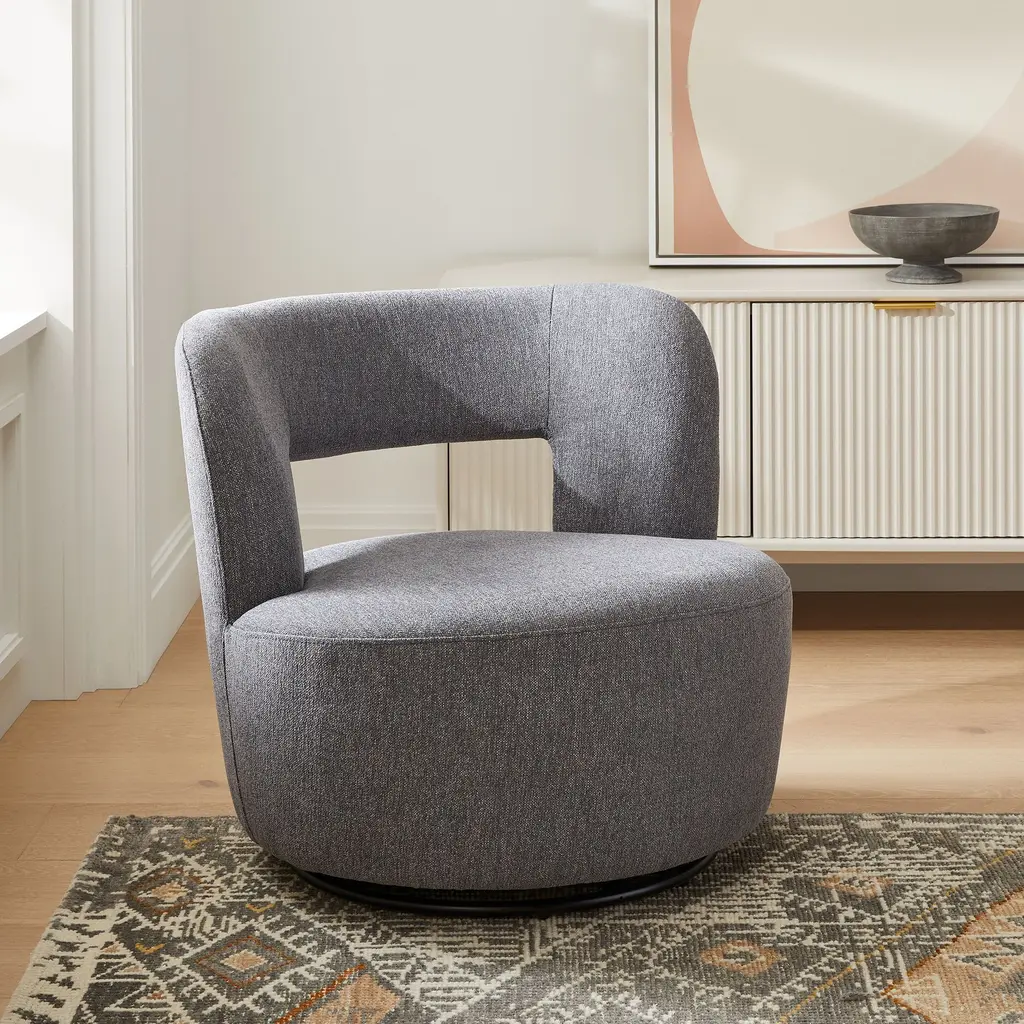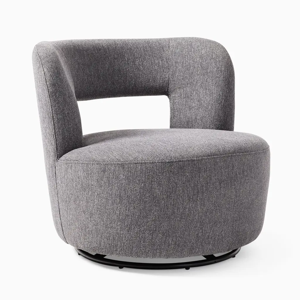 Mod silhouette is easy to relax in. Cutout back adds an ultra cool design detail. Swivel base ensures smooth turning. Covered in your choice of upholstery.