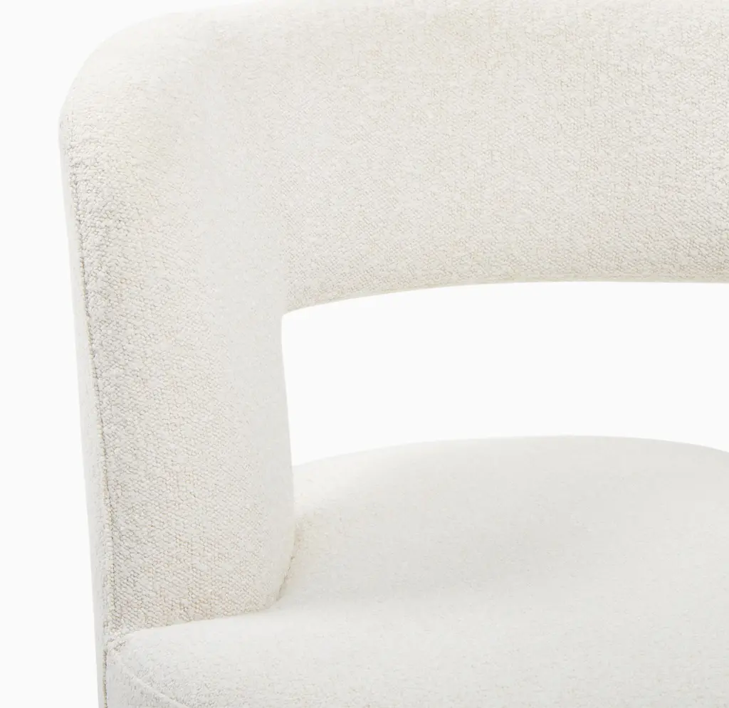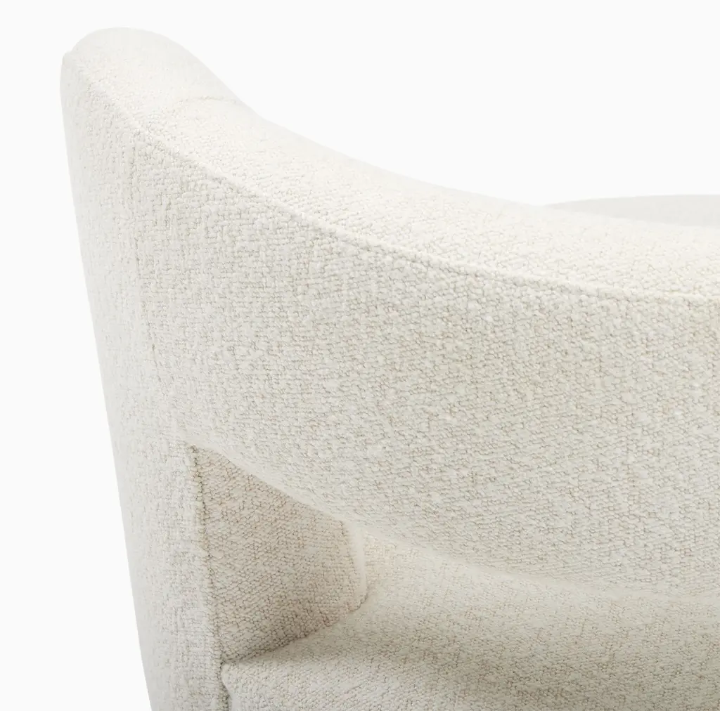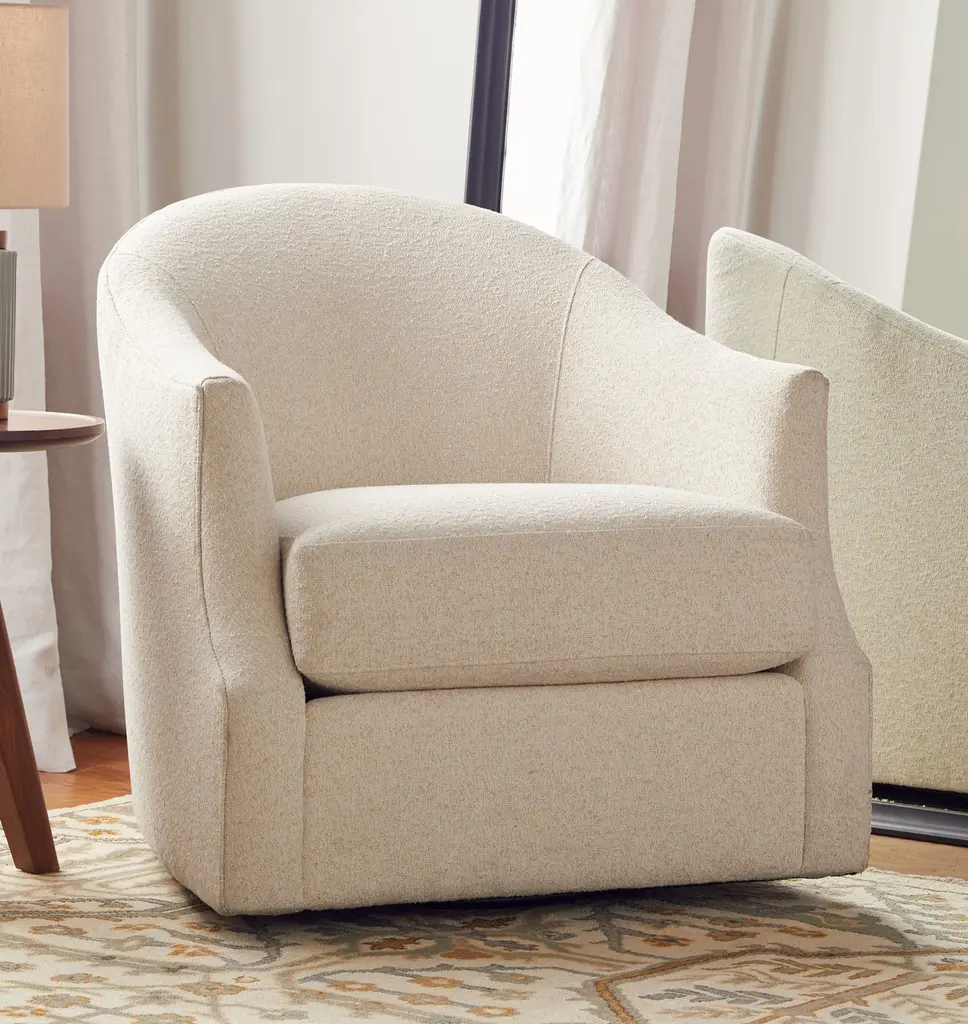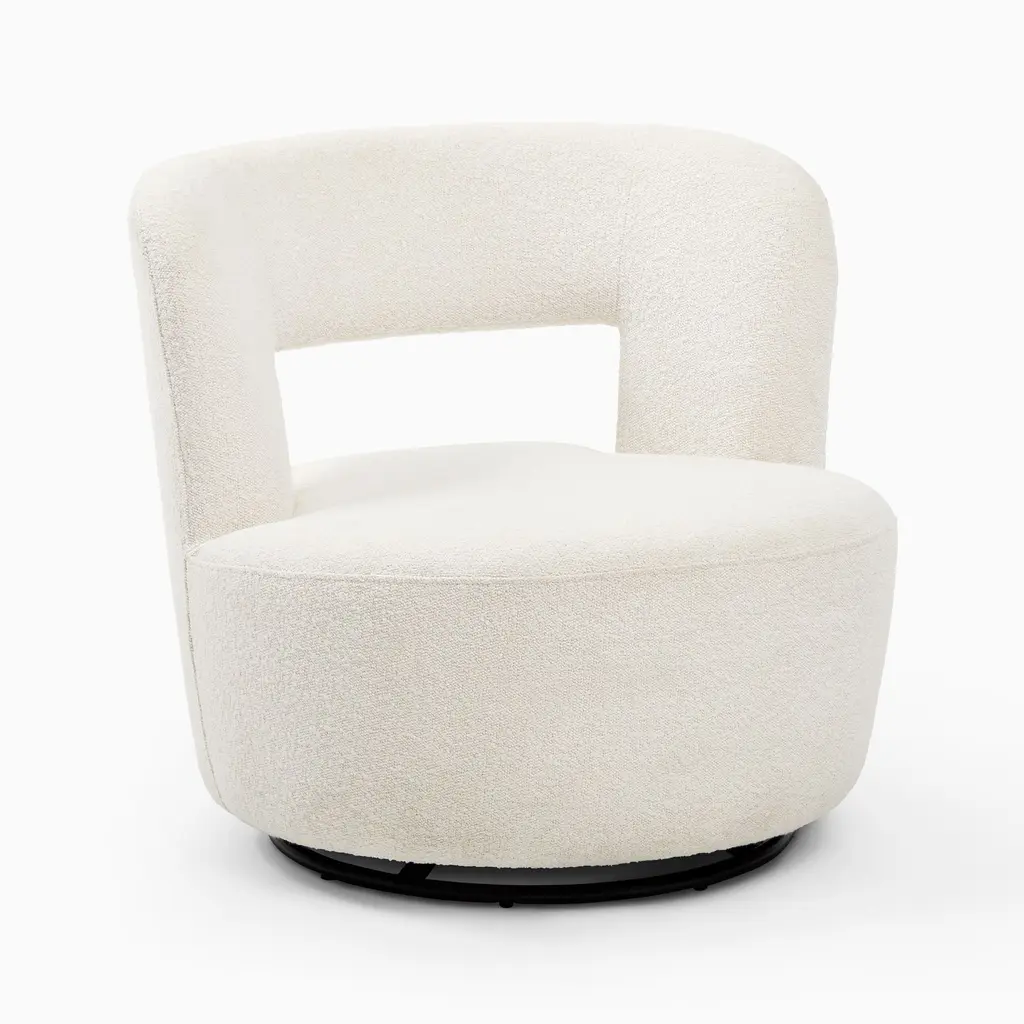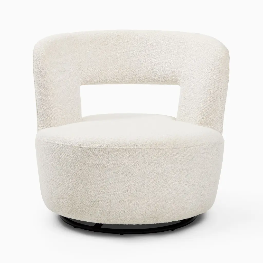 Mod silhouette is easy to relax in. Cutout back adds an ultra cool design detail. Swivel base ensures smooth turning. Covered in your choice of upholstery.