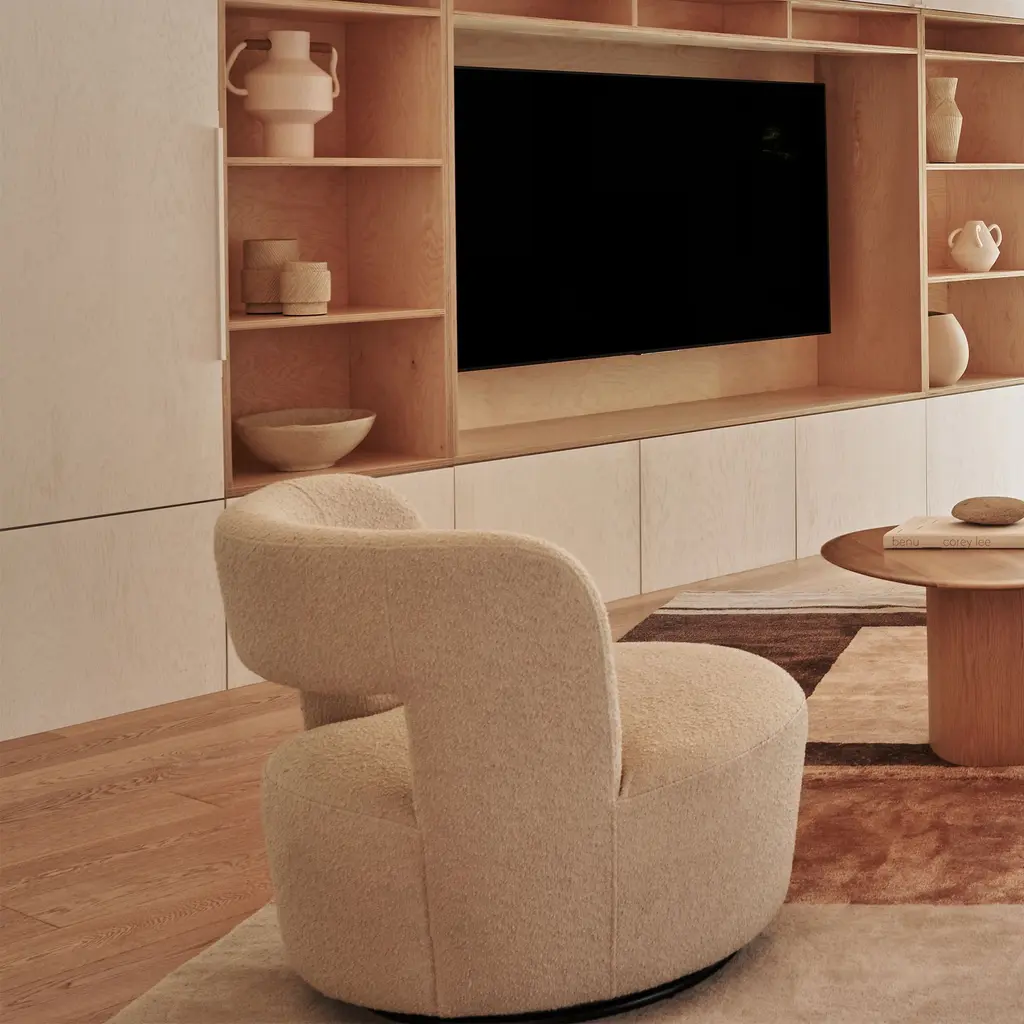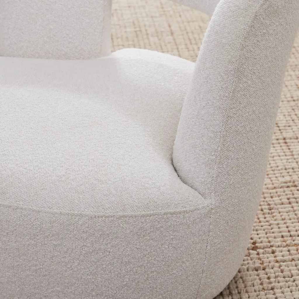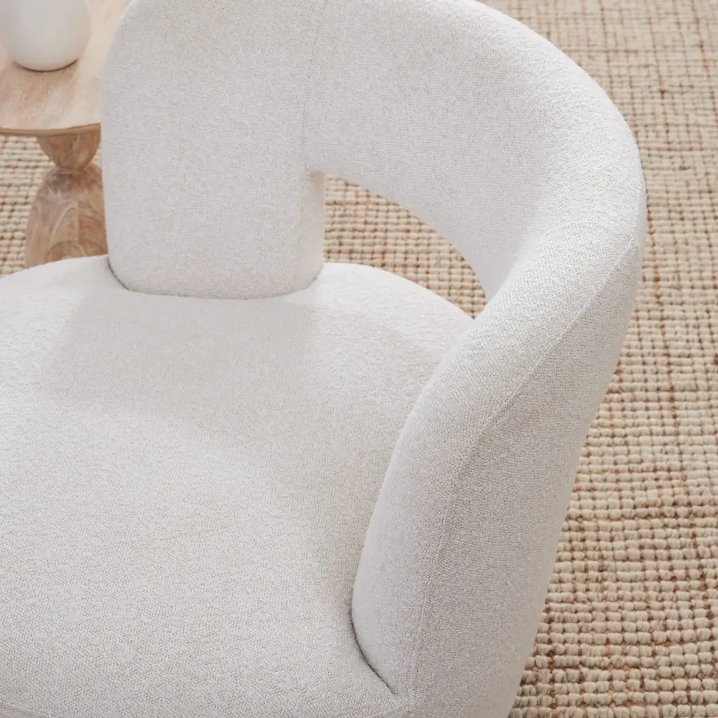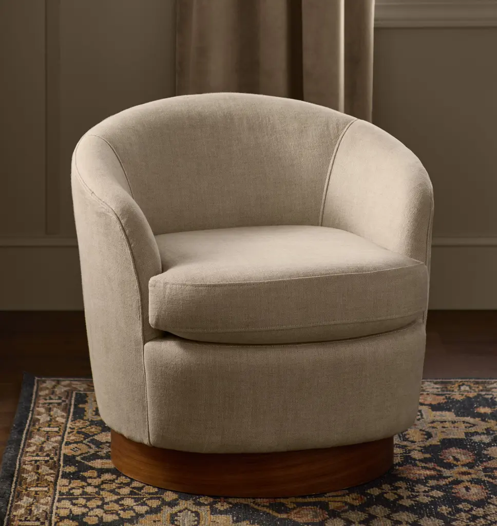 Mod silhouette is easy to relax in. Cutout back adds an ultra cool design detail. Swivel base ensures smooth turning. Covered in your choice of upholstery.