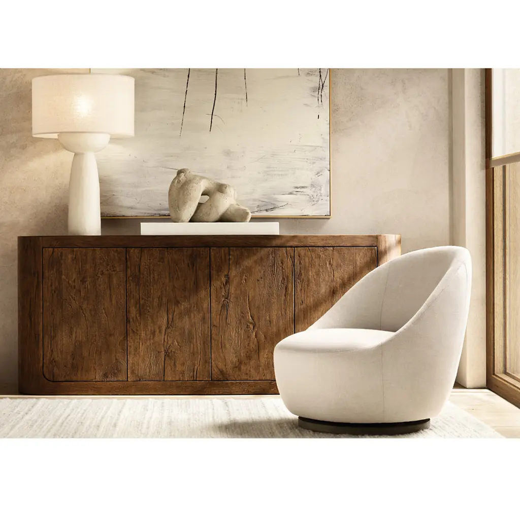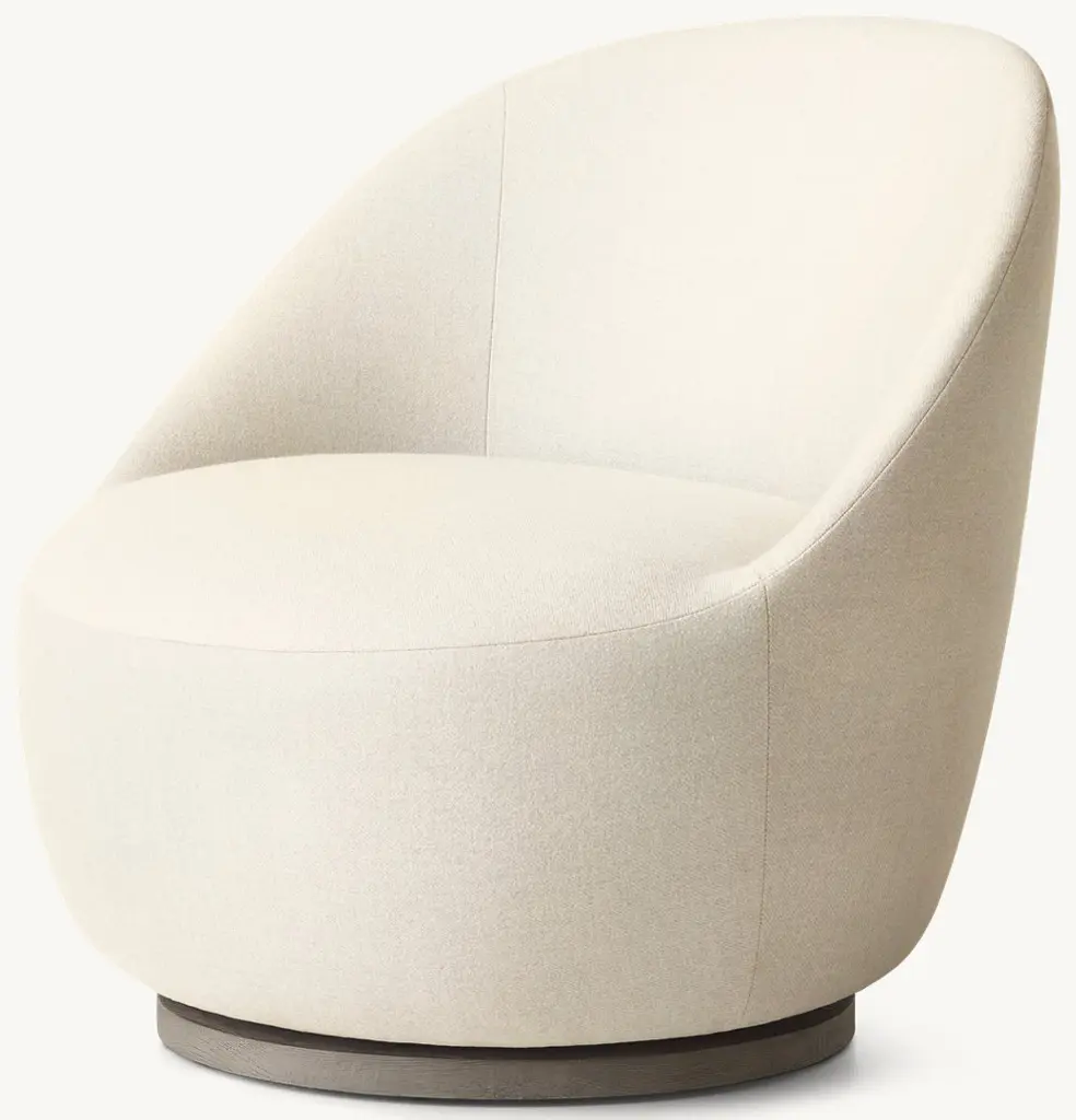 Defined by its uninterrupted curves, the chair is a contemporary minimalist statement. Continuous upholstery wraps the sinuous, Parisian-inspired form, whose spoon back melts into the contours of its convex seat. The tapered base is anchored by a circular wood plinth that conceals a 360-degree swivel.