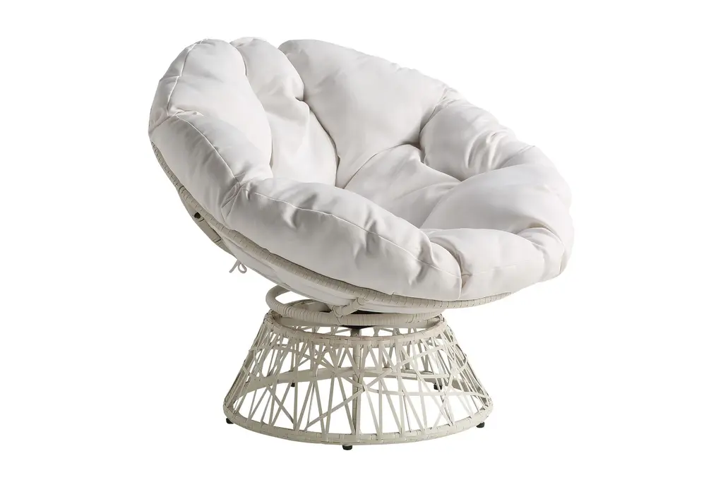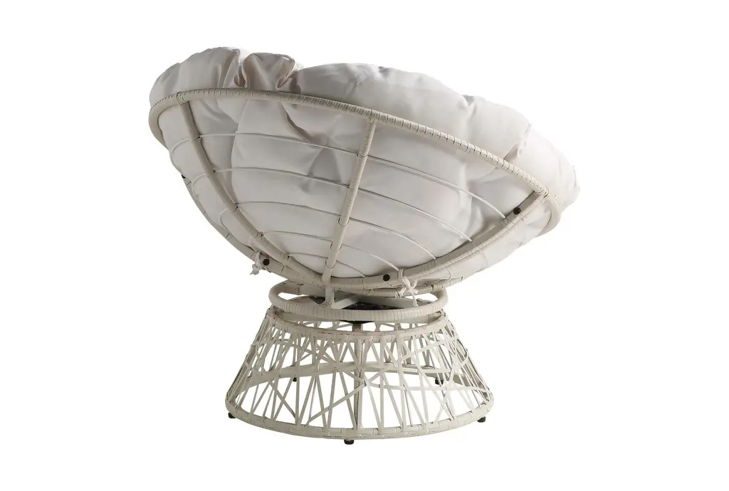 Experience ultimate comfort and style with the Soleil White Fabric Swivel Papasan Chair with White Wicker Frame. This casual, boho-inspired chair features a soft, thick padded, button-tufted polyester cushion that ensures a cozy seating experience. The 360° swivel function and built-in fabric straps to hold the cushion in place make it a versatile and practical addition to any room. This design is the perfect bedroom chair, reading chair, club chair or accent chair for living room.