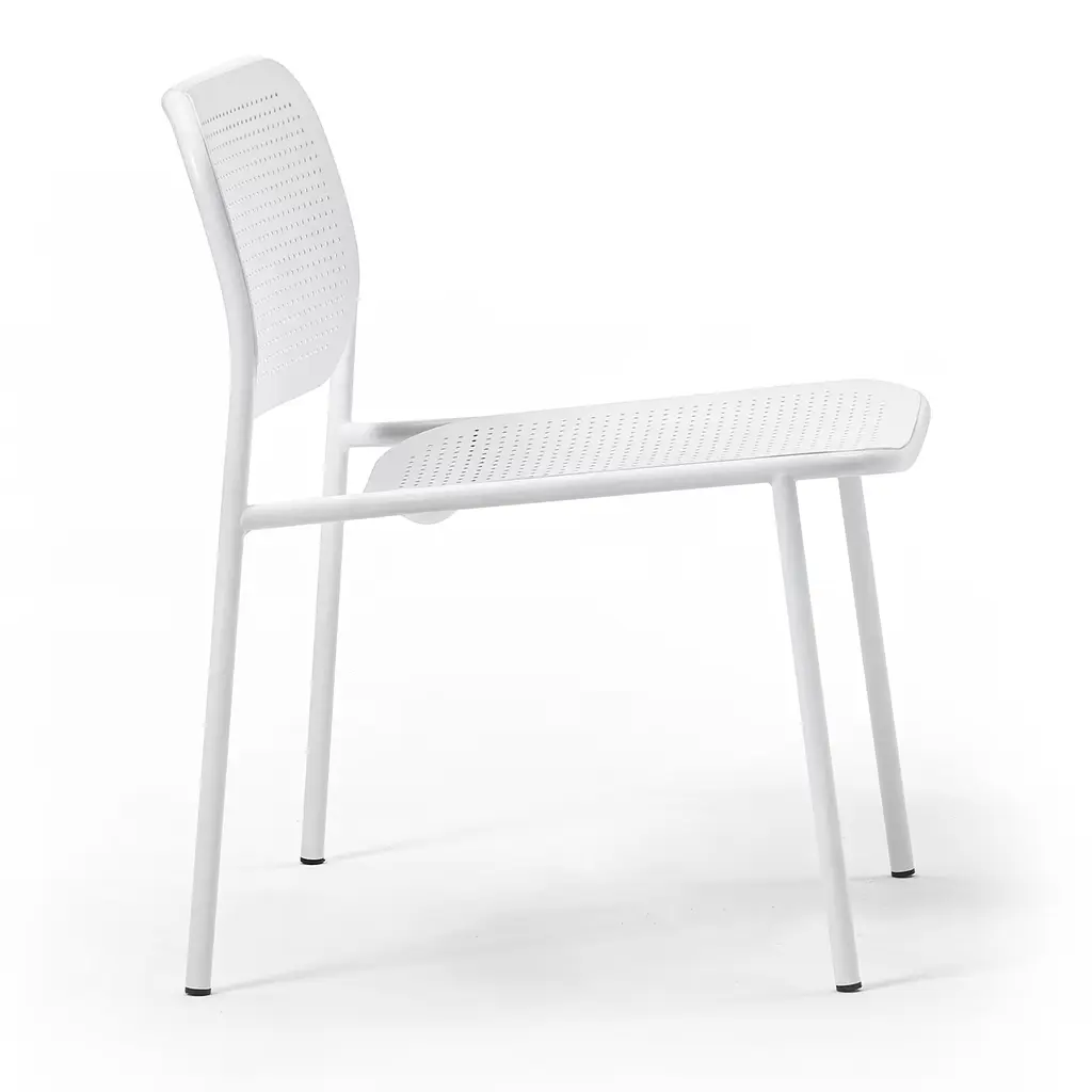 Brightness and minimalism define this chair from the Metis Collection. A pierced design characterizes the seat and backrest metal sheets, sharing with the same pure-white lacquer with the rest of the cylindrical metal frame. A spot-on addition to professional contexts of modern inspiration, it is apt for indoor and outdoor use, alike. Please ask the Concierge for the pricing of the optional cushion.