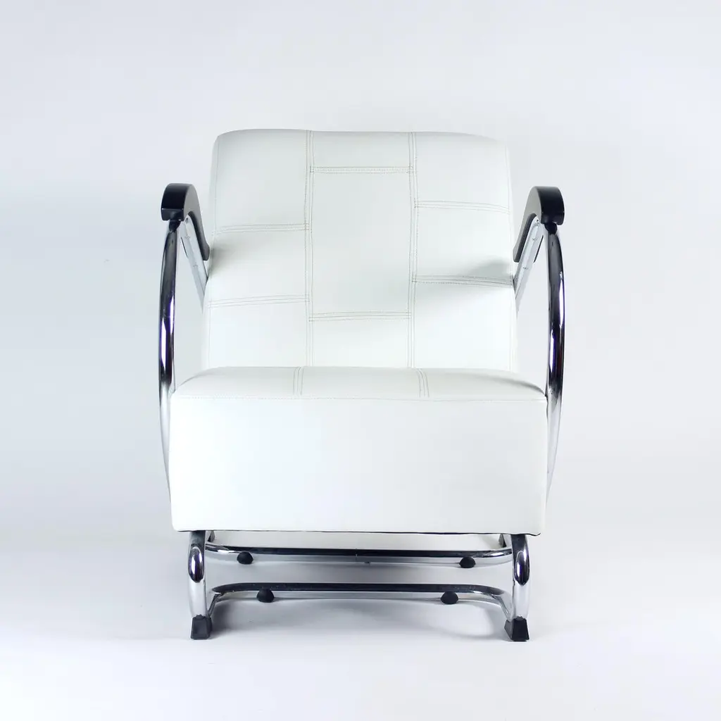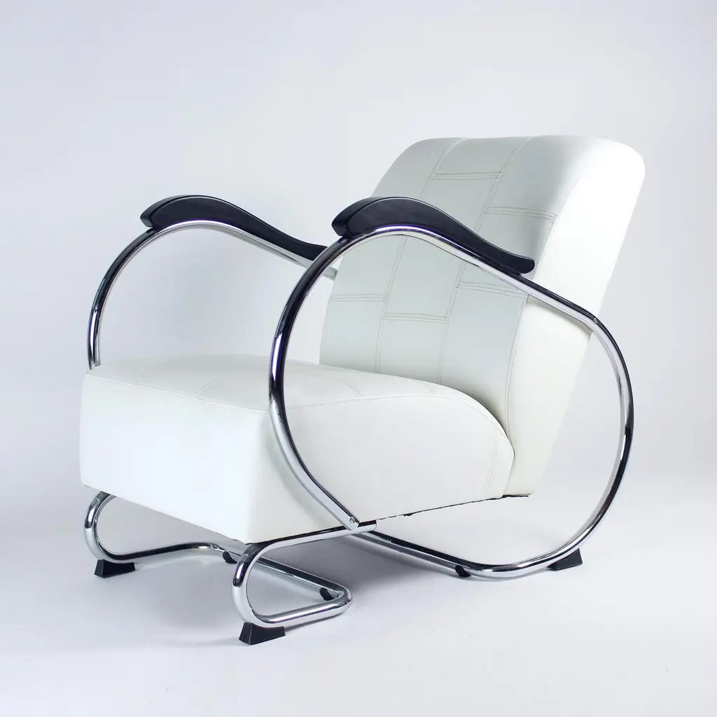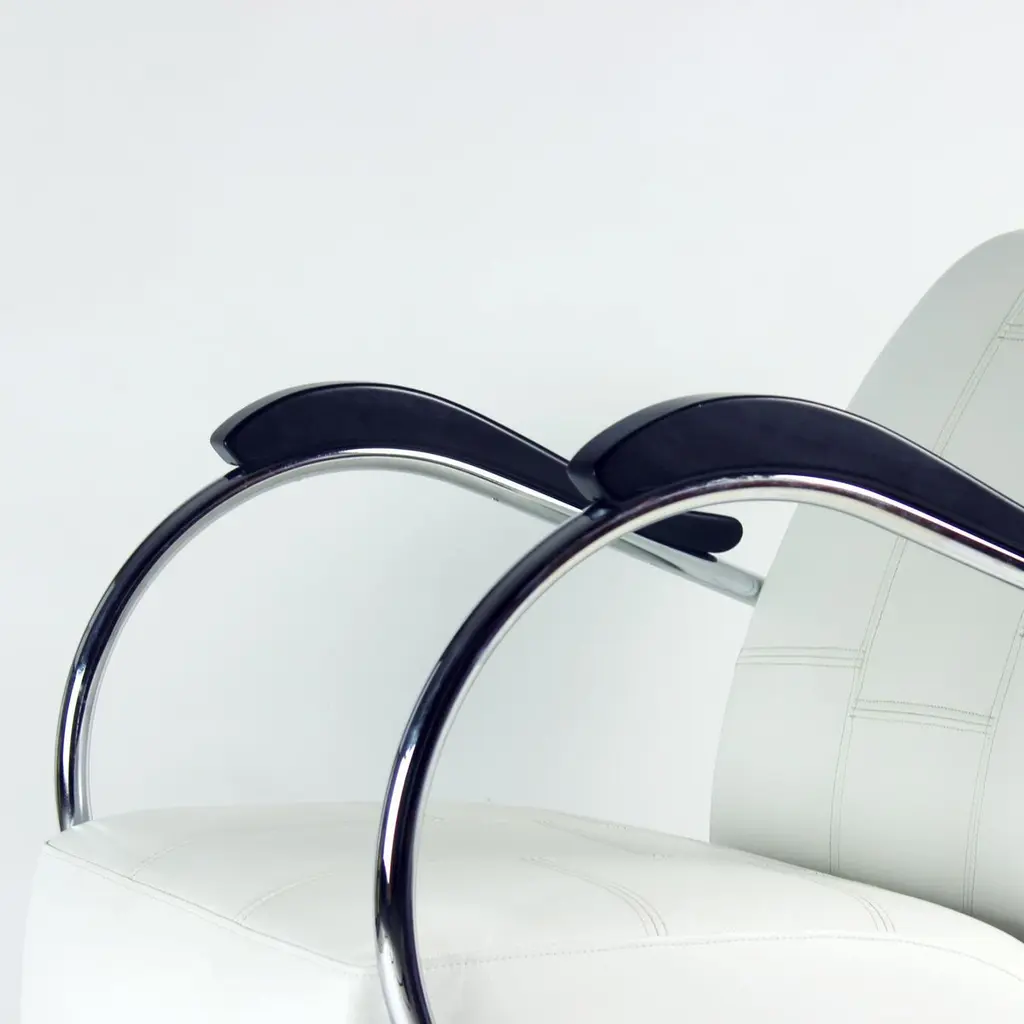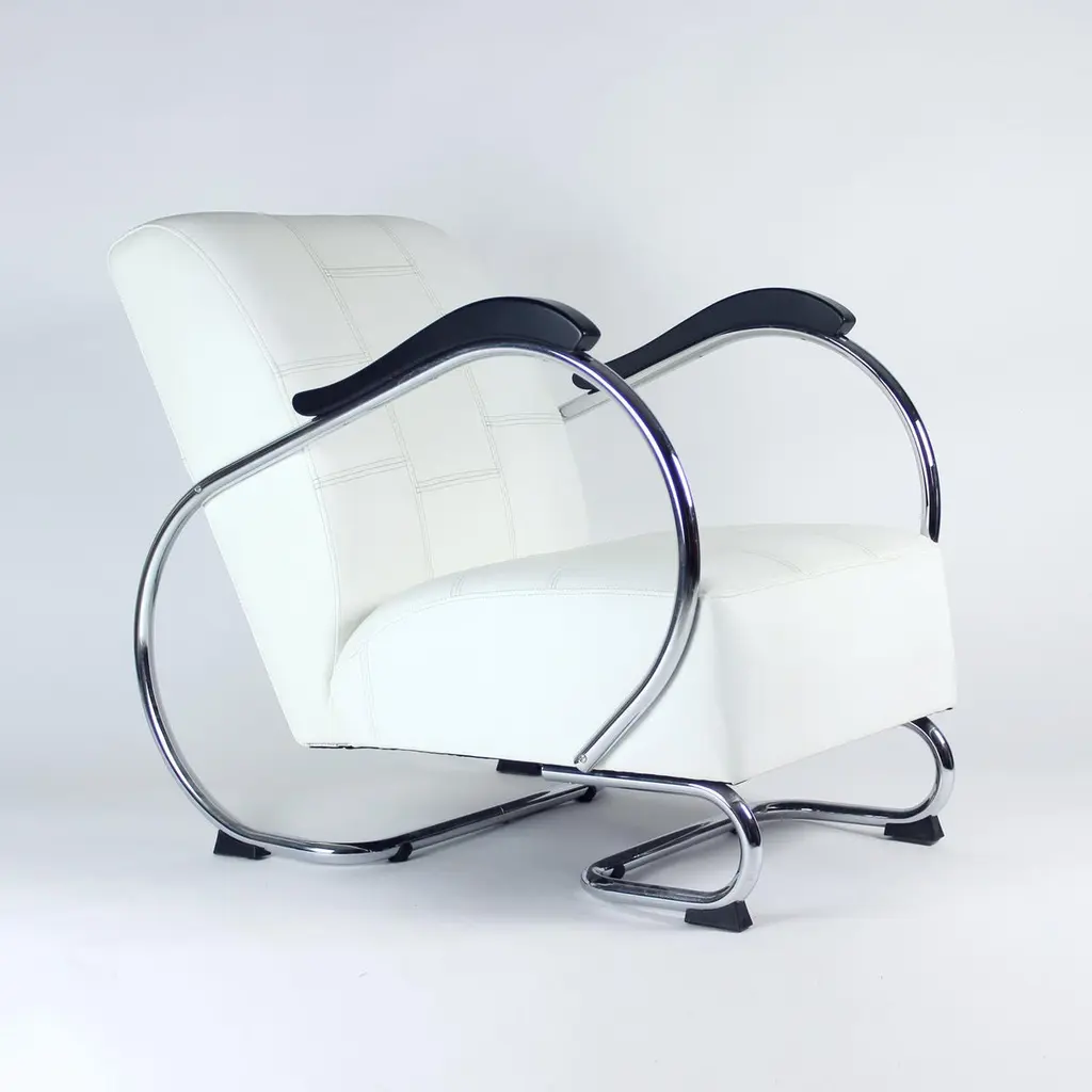Unique lounge chair after a complete restoration. The armchair was produced in 1930s, designed by Hynek Gottwad. The armchar offers a greatly comfortable seating. The design is one of a kind. The construction from bent chrome pipes has been professionally cleaned and restored into a new chrome finish. The handrests are mad eof oak wood in new black finish. The upholstery is made of pure white leather in an interesting style of patchwork finish. Beautiful, Italian leather. Very comfortable chair with a unique design.We have another 10 of these chairs available for new upholstery. Please let us know, if you would be interested in more pieces.