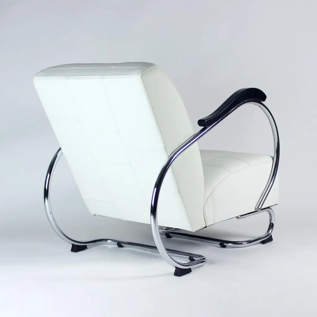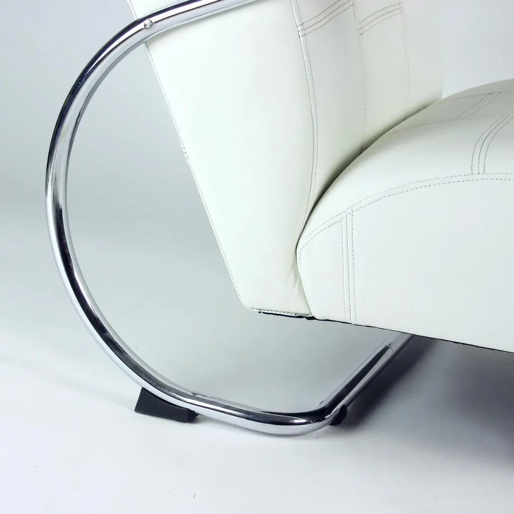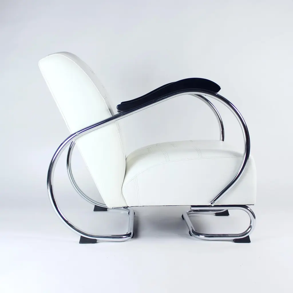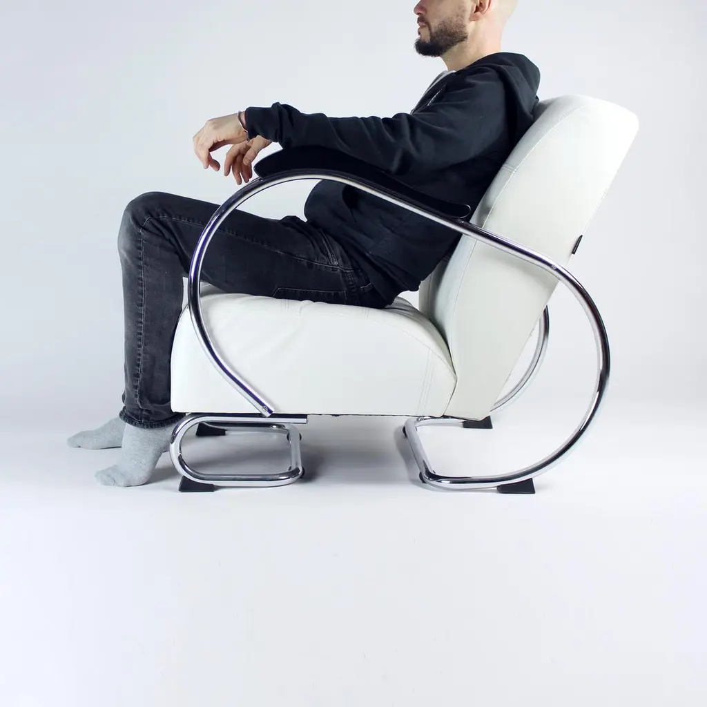 Unique lounge chair after a complete restoration. The armchair was produced in 1930s, designed by Hynek Gottwad. The armchar offers a greatly comfortable seating. The design is one of a kind. The construction from bent chrome pipes has been professionally cleaned and restored into a new chrome finish. The handrests are mad eof oak wood in new black finish. The upholstery is made of pure white leather in an interesting style of patchwork finish. Beautiful, Italian leather. Very comfortable chair with a unique design.We have another 10 of these chairs available for new upholstery. Please let us know, if you would be interested in more pieces.