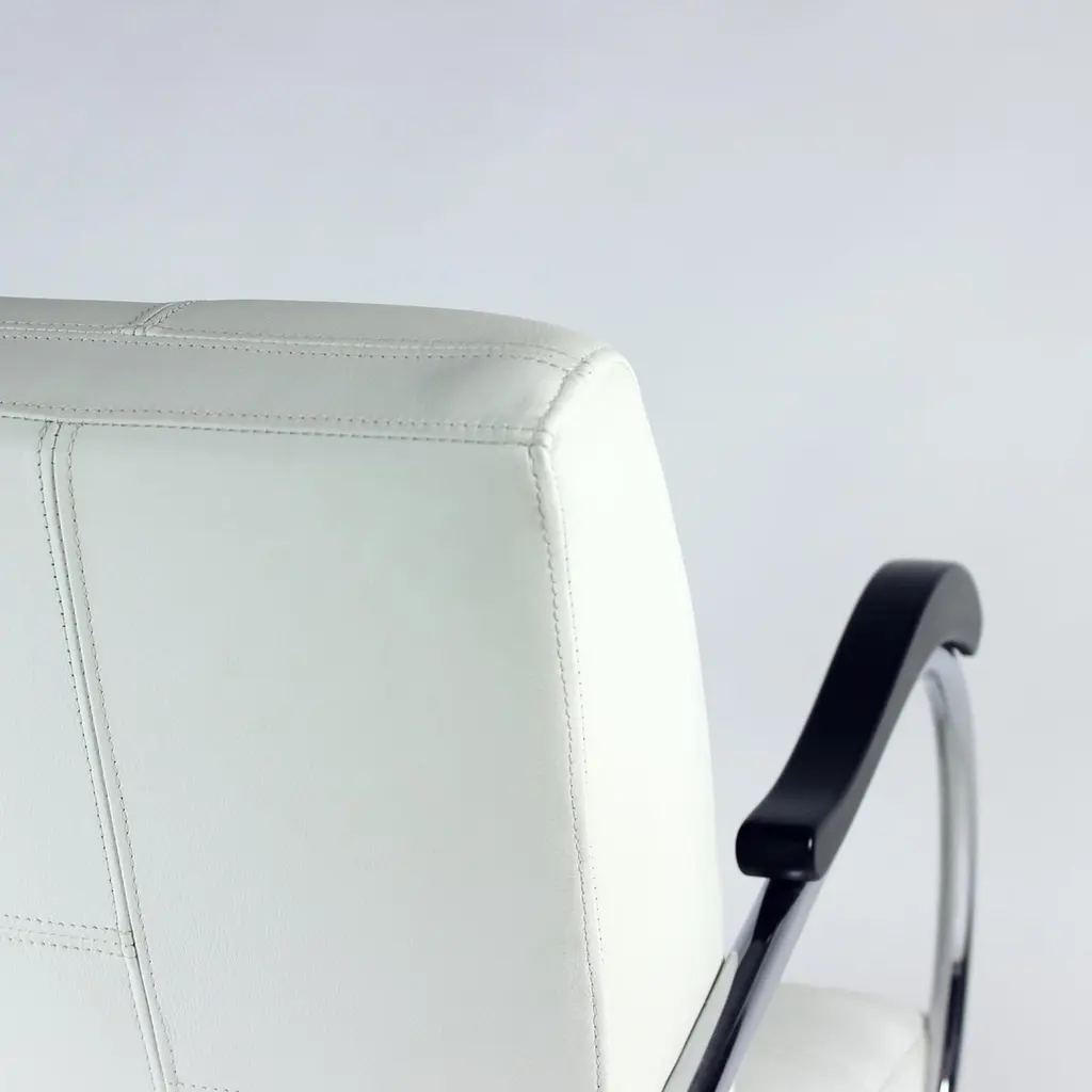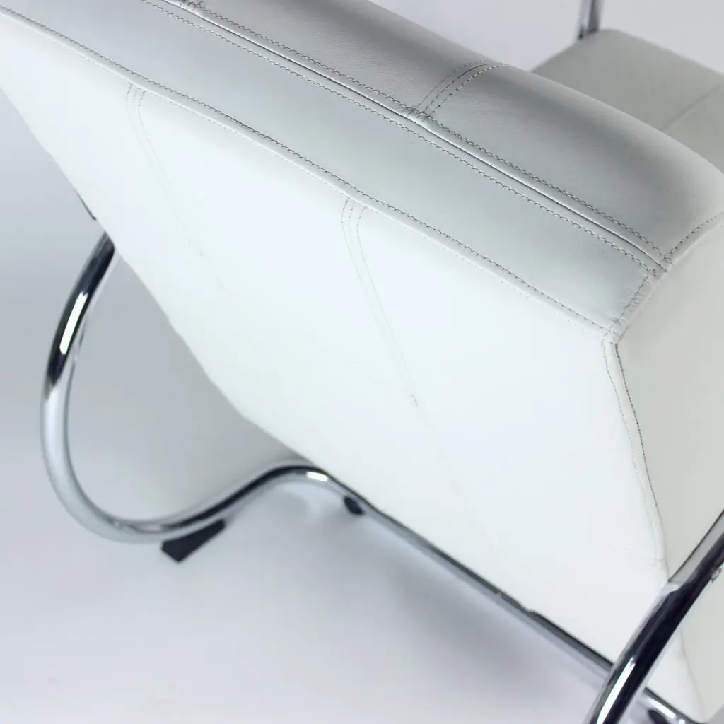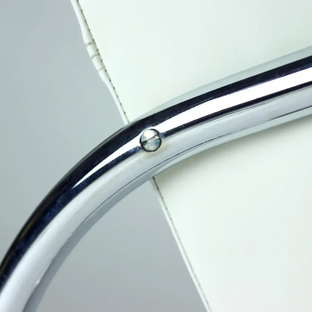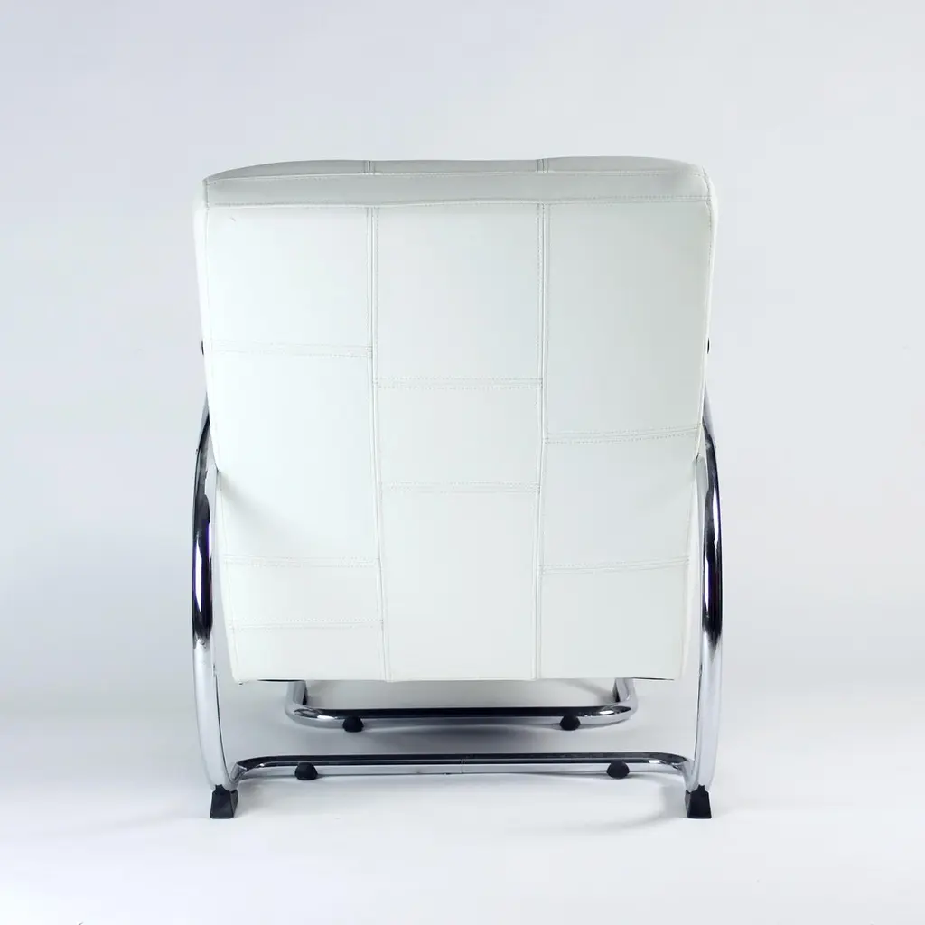 Unique lounge chair after a complete restoration. The armchair was produced in 1930s, designed by Hynek Gottwad. The armchar offers a greatly comfortable seating. The design is one of a kind. The construction from bent chrome pipes has been professionally cleaned and restored into a new chrome finish. The handrests are mad eof oak wood in new black finish. The upholstery is made of pure white leather in an interesting style of patchwork finish. Beautiful, Italian leather. Very comfortable chair with a unique design.We have another 10 of these chairs available for new upholstery. Please let us know, if you would be interested in more pieces.