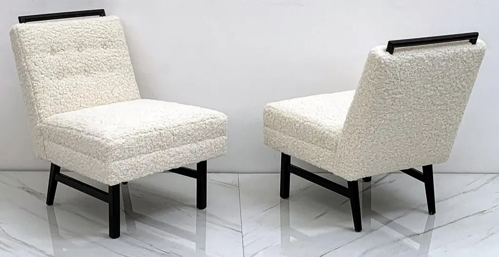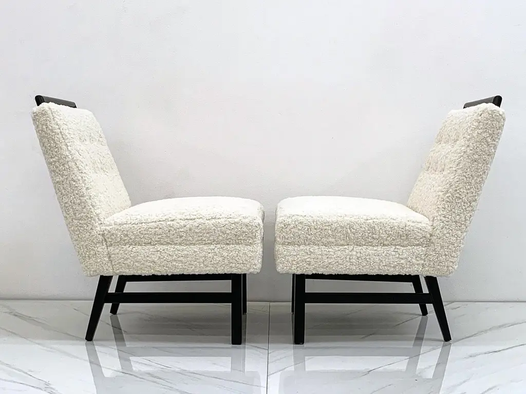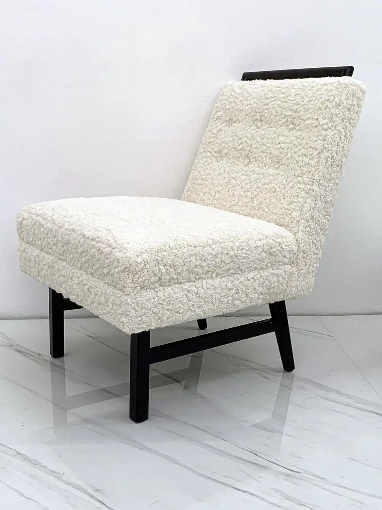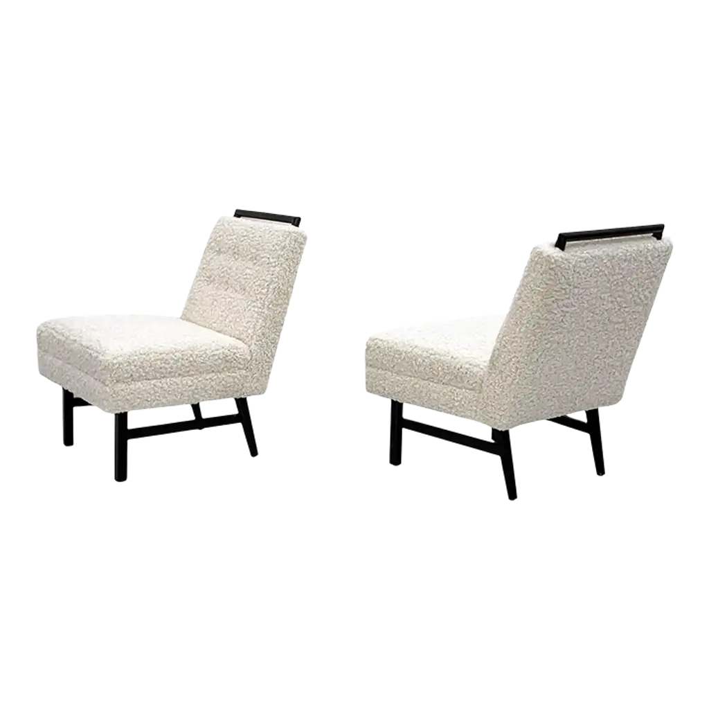 These chairs are simply stunning. These vintage slipper lounge chairs were designed in the 1950s in these style of Harvey Probber. These lounges have been ebonized and upholstered in a heavy off-white / bone bouclé that is incredibly soft to the touch. These are chairs you'll want to sit in and lounge for hours-- equally as comfortable as they are beautiful.Priced per chairThe shape of these chairs is recognizably Mid-Century Modern; timeless angular body that effortlessly blends into any contemporary, modern, traditional or even Hollywood Regency environment. The chairs can be styled up, or styled down and would look equally as fashionable in a Tommy Bahama beach house style environment as they would in a Danish modern home.We currently have them styled in the gallery alongside a Karl Springer coffee table and a Vladimir Kagan serpentine sofa and not only do they hold their own, they make a subtle, elegant statement without completely stealing the show. Absolutely gorgeous chairs that would look great, stand alone, or as a set perhaps both fireside with some occasional tables and design magazines.