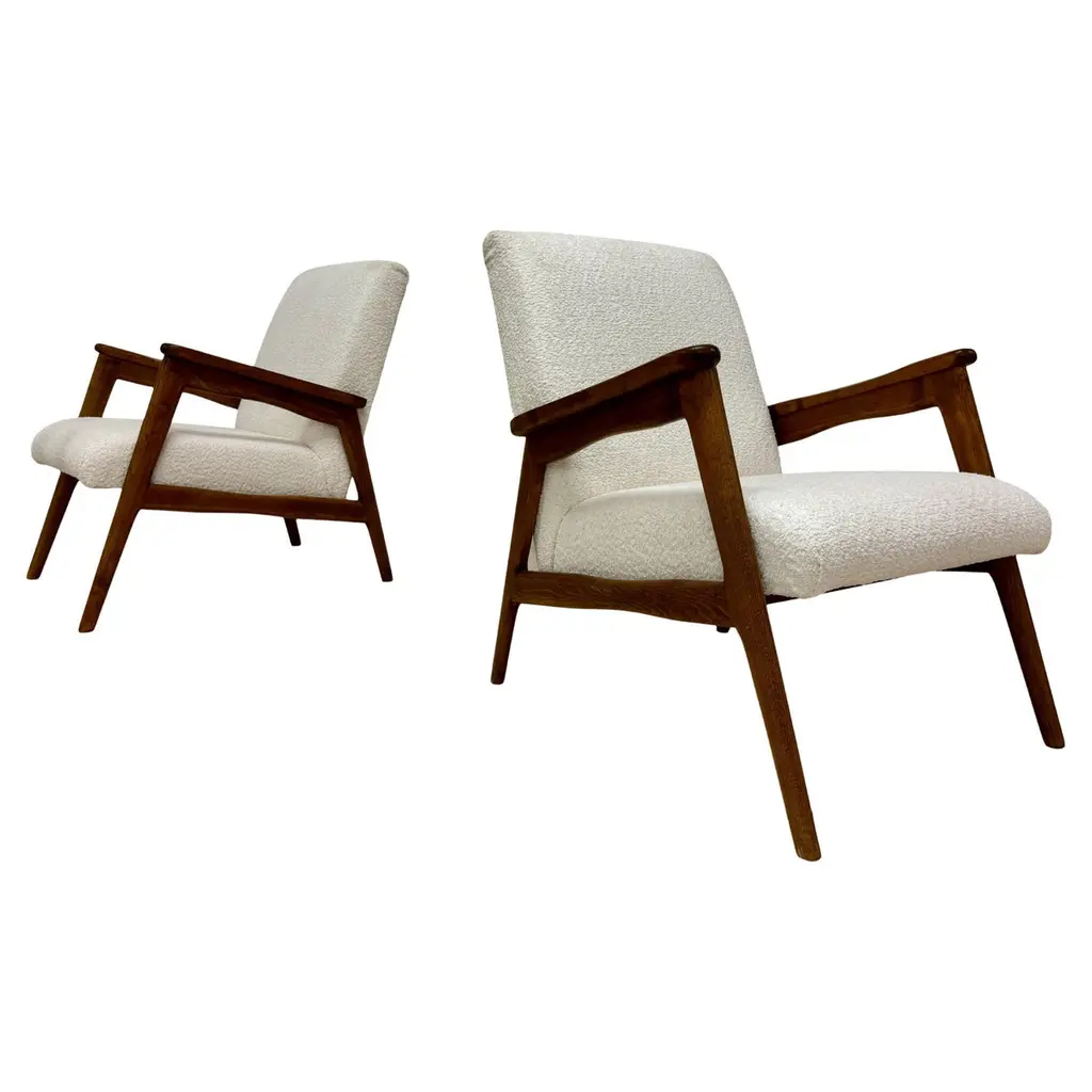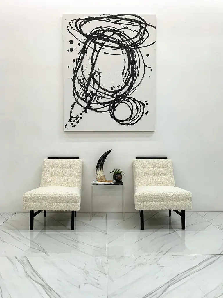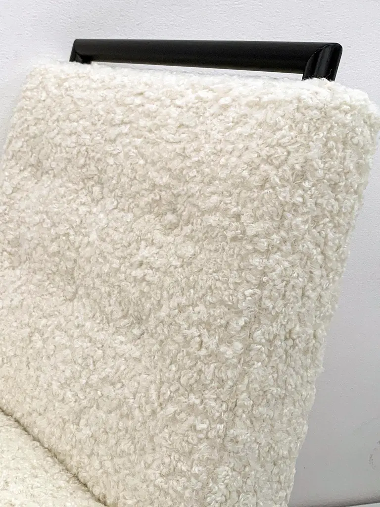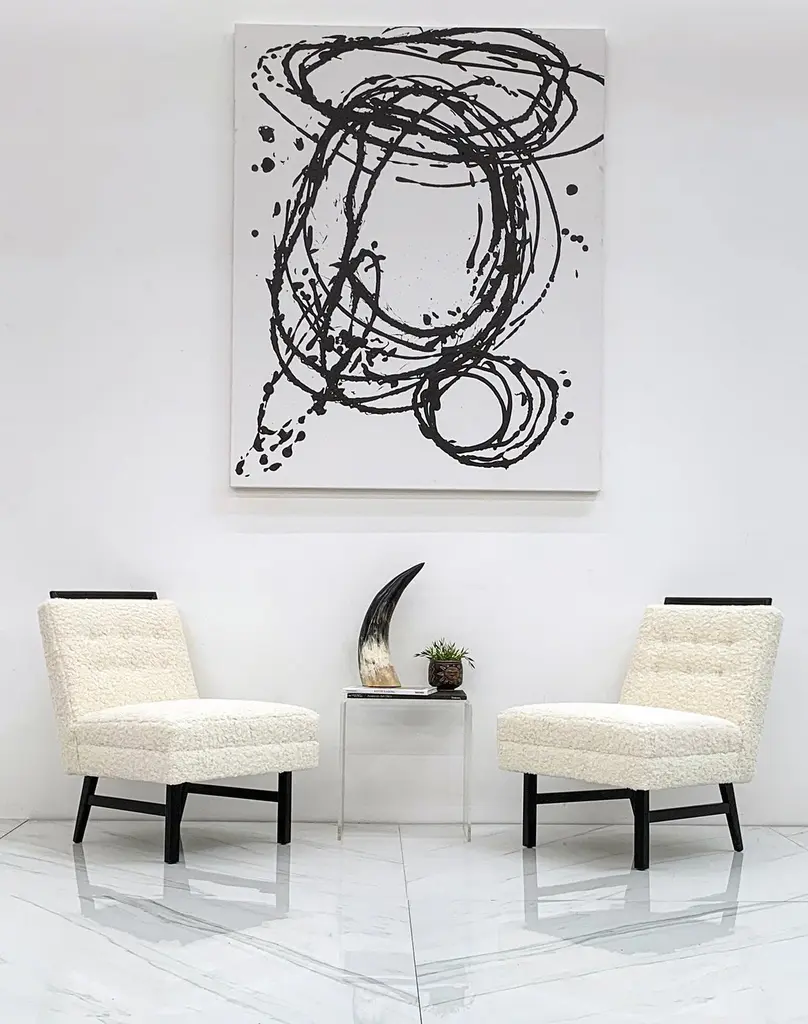 These chairs are simply stunning. These vintage slipper lounge chairs were designed in the 1950s in these style of Harvey Probber. These lounges have been ebonized and upholstered in a heavy off-white / bone bouclé that is incredibly soft to the touch. These are chairs you'll want to sit in and lounge for hours-- equally as comfortable as they are beautiful.Priced per chairThe shape of these chairs is recognizably Mid-Century Modern; timeless angular body that effortlessly blends into any contemporary, modern, traditional or even Hollywood Regency environment. The chairs can be styled up, or styled down and would look equally as fashionable in a Tommy Bahama beach house style environment as they would in a Danish modern home.We currently have them styled in the gallery alongside a Karl Springer coffee table and a Vladimir Kagan serpentine sofa and not only do they hold their own, they make a subtle, elegant statement without completely stealing the show. Absolutely gorgeous chairs that would look great, stand alone, or as a set perhaps both fireside with some occasional tables and design magazines.