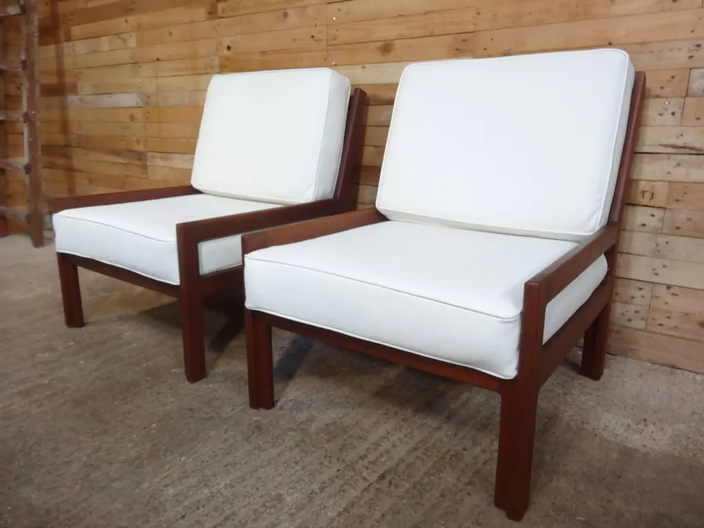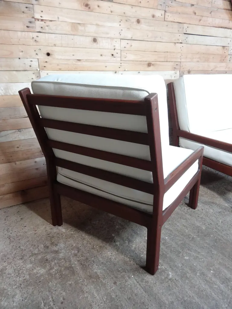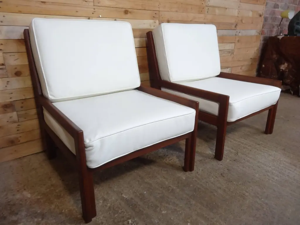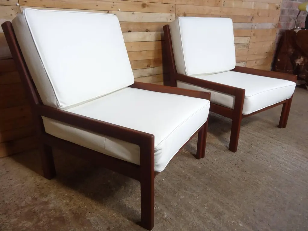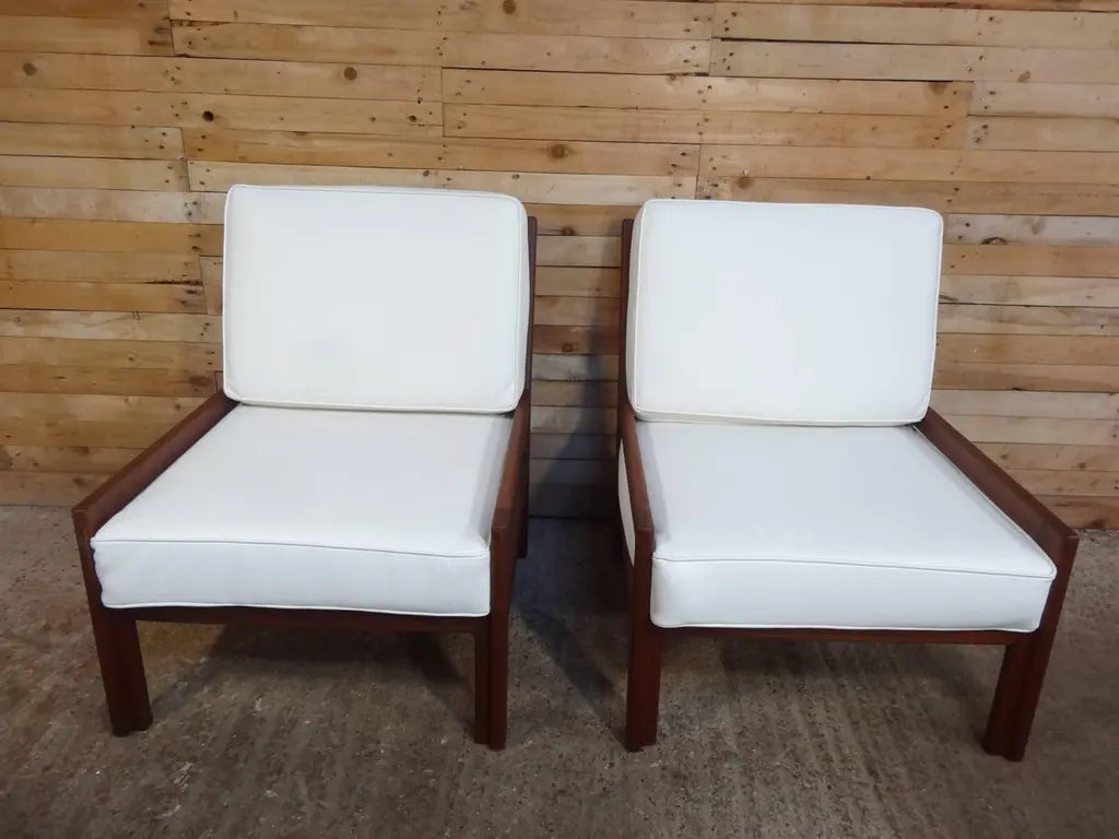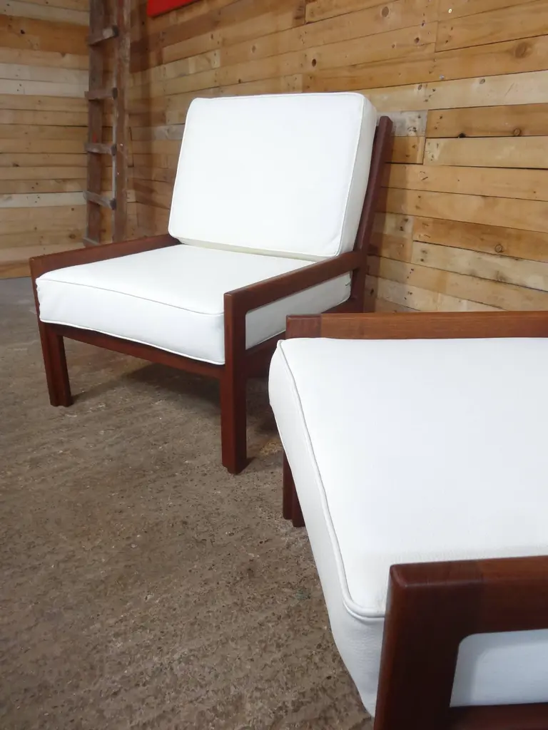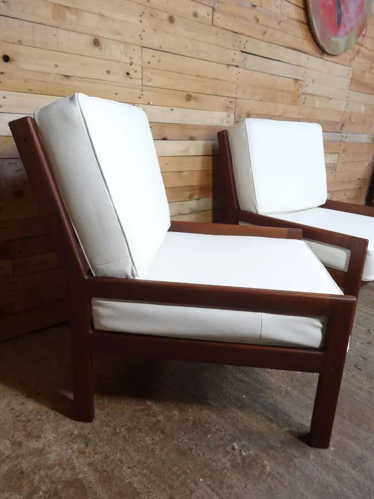 1960 Set Of Retro White Leather Minimalistic Teak Lounge Chairs