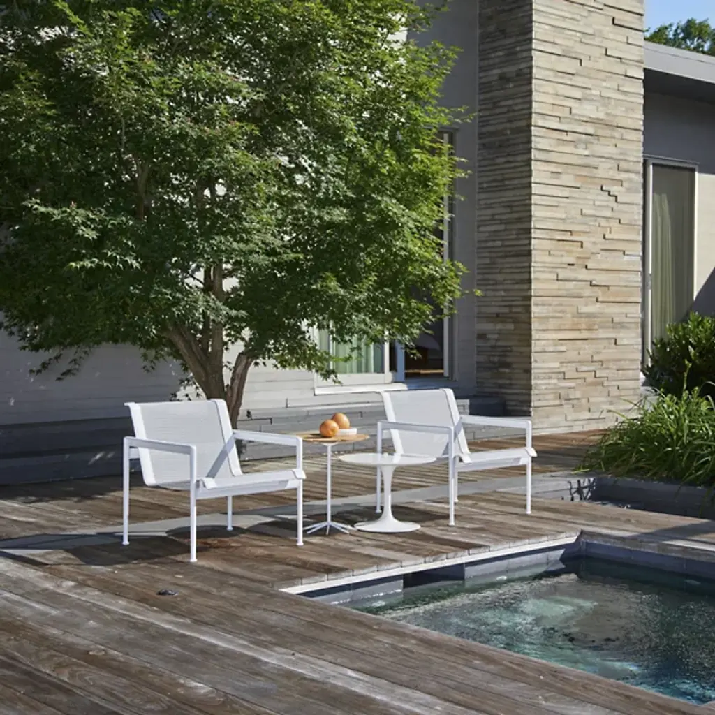 Confident that the patio could be every bit as trendy as any indoor space, Florence Knoll brought a request in 1962 to designer Richard Schultz: to design a line of furniture that could withstand the elements without compromising on style. Schultz responded with the 1966 Collection, including this angular Lounge Chair with Arms by Knoll, sporting sharp 90-degree angles, creating the ideal combo of aesthetic form and practical function.