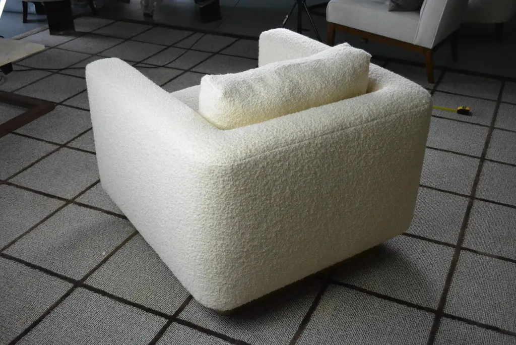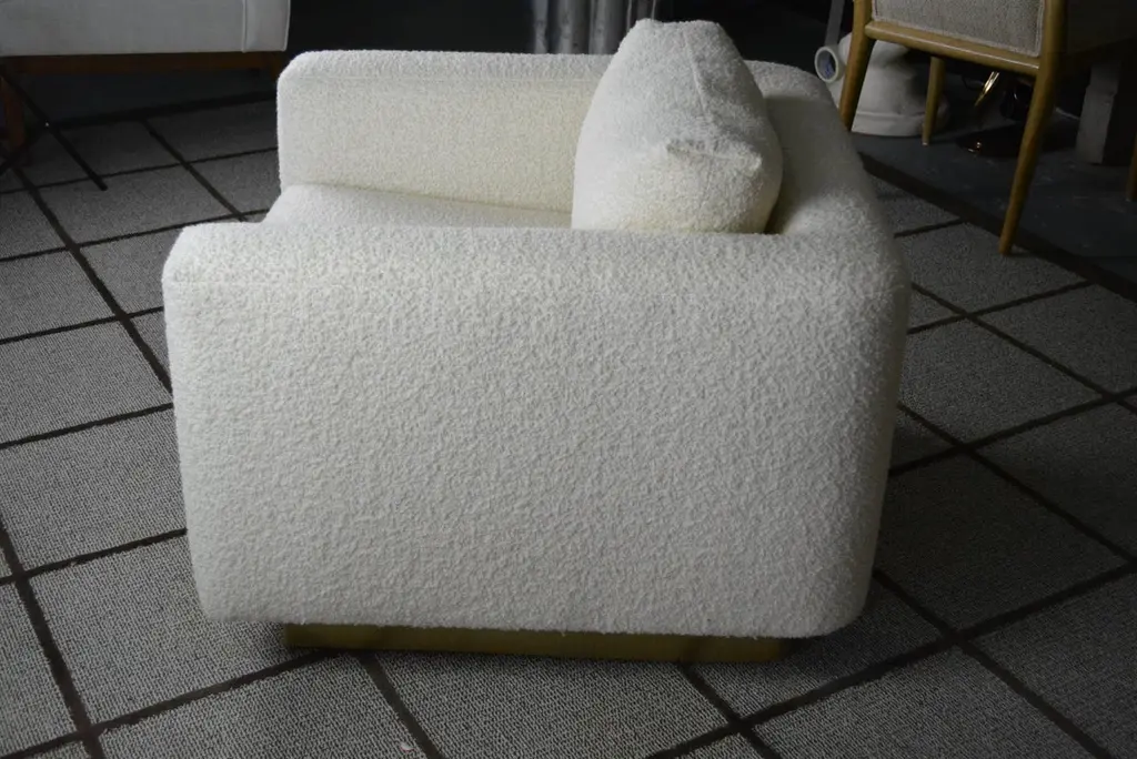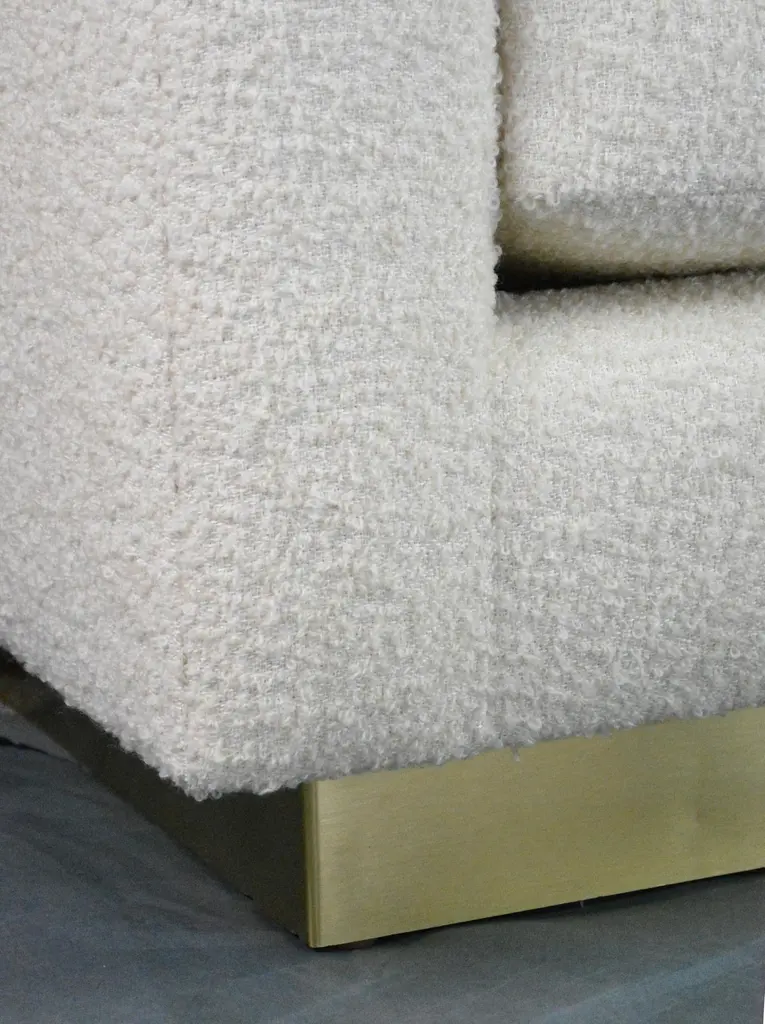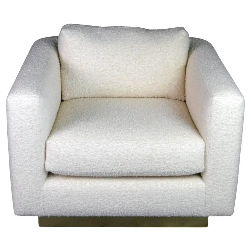 1980s club chairs in new ivory wool bouclé. Chic "floating cube" design on a recessed satin brass base with a nice seam detail at the rear. Attributed to Steve Chase but unmarked.