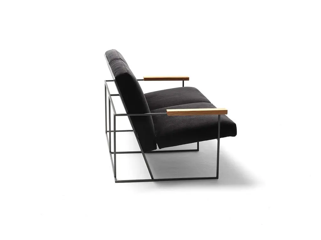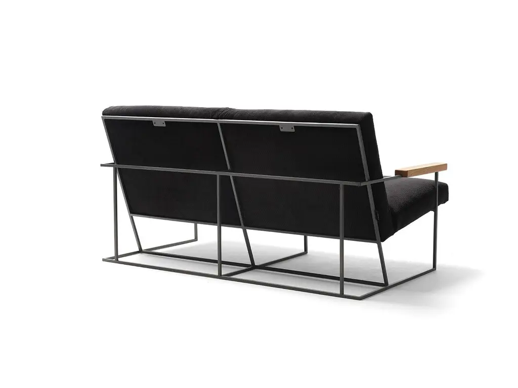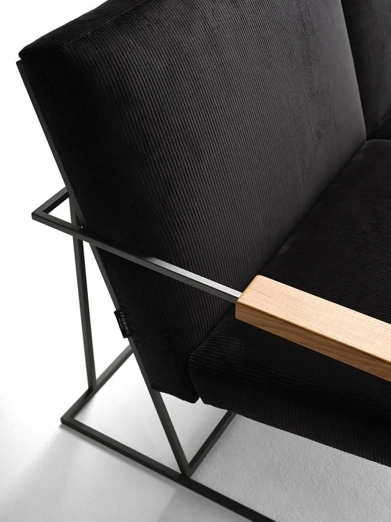 The distinctive linear geometry and the visual lightness of the Gotham 2-seater come from its metal frame, a clean aerial structure that holds the seat and backrest cushions. These in contrast are generous and voluminous thus creating a visual juxtaposition between the supporting base and the upholstered elements, between structural need and seating comfort. Here we showcase it with covers made of black cotton corduroy: the three-dimensional texture of the fabric matches the linear geometry of the armchair’s metal structure. Our Gotham pouf is its perfect partner. Cadet grey painted steel structure (other colors are available upon request) with solid oak armrests. Polyurethane cushions. Covers in cotton velvet, cotton corduroy or casentino wool. Leather and customer own material also available upon request.