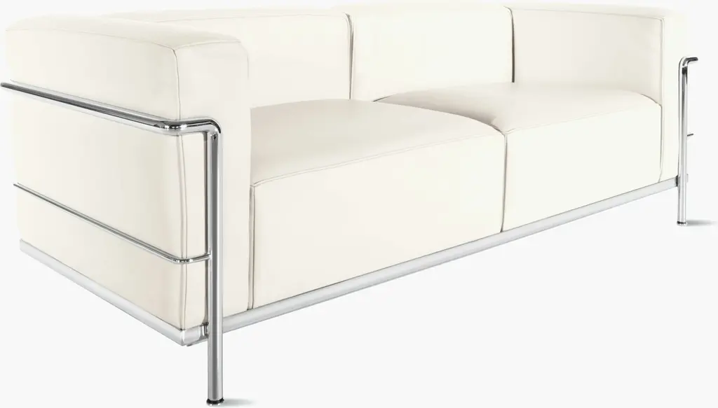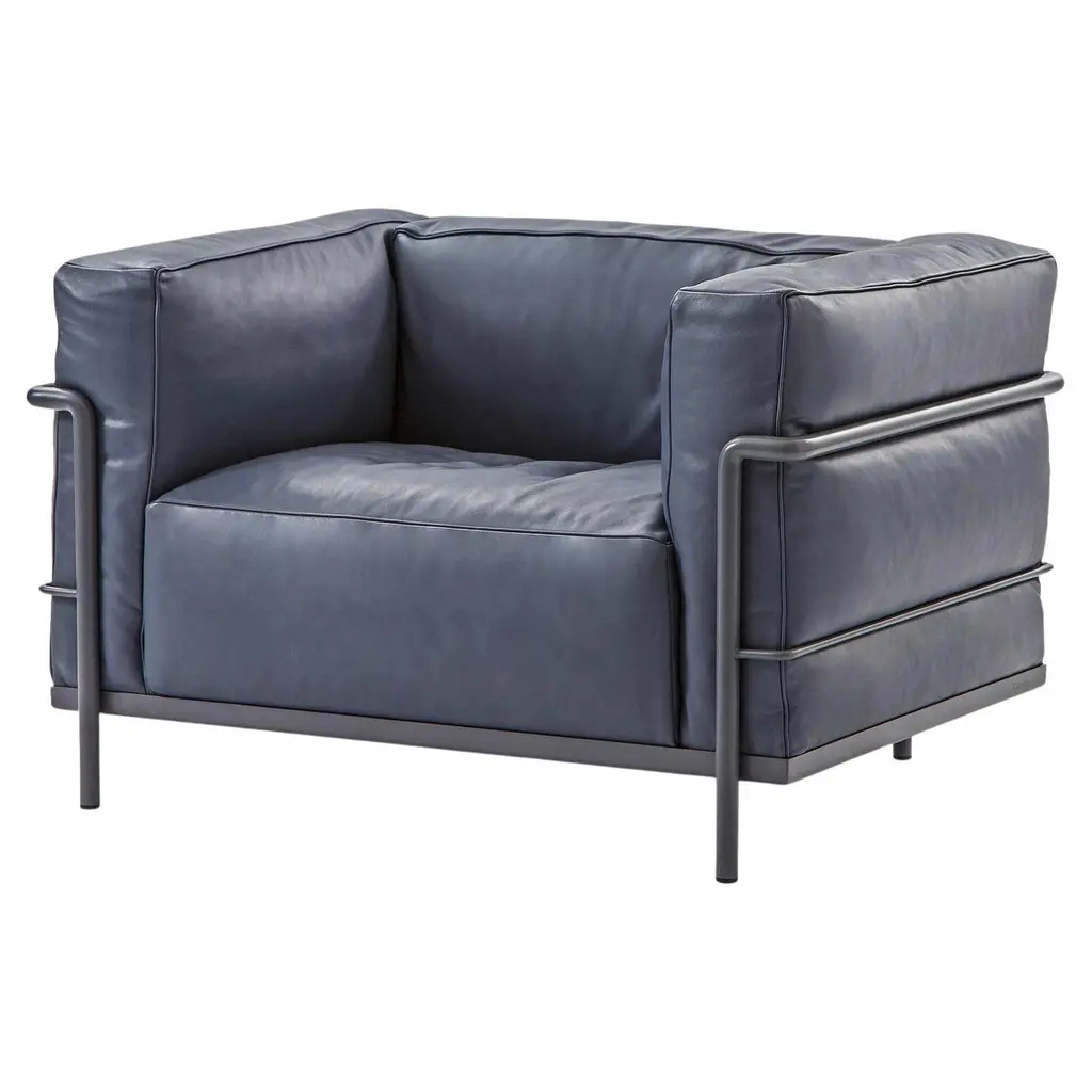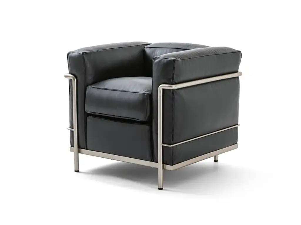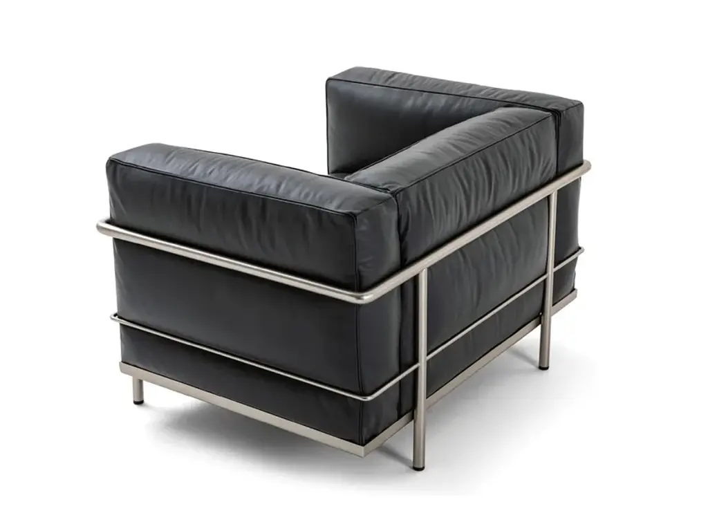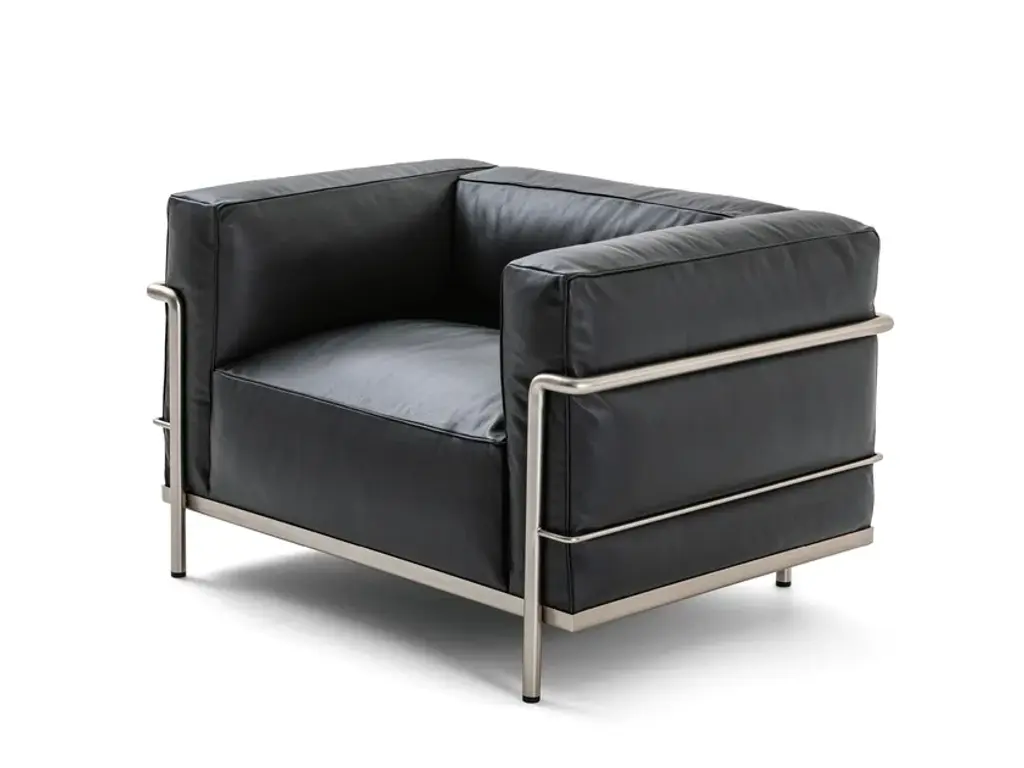 In the various models of Fauteuil Grand Confort, grand modèle, the concept of modernity is expressed through the separation between the metal support frame and the upholstered elements. The loose cushions are set inside a painted or chrome-plated tubular steel cage that forms the primary support for the piece in all its variations ‒ from the armchair with armrest on one or both sides, to the two- and three-seat sofas. Over the years, Cassina has worked very closely with Charlotte Perriand, her daughter Pernette and the Fondation Le Corbusier to introduce new versions and finishes that, while reinterpreting the original design, remain entirely faithful to its authenticity. These models are also available in version with a conscious soul. Thanks to the work carried out by Cassina LAB (the project born from the collaboration with POLI.design at the Milan Polytechnic), the cushions are made with padding in blown polyester fibre.Durable version, frame:Frame in tubular steel: Polished chrome, or painted finish in the colours shown on the price list.Cushion padding: Blown 100% recycled polyester fibre.Upholstery: Fabric or leather.Seat frame: In steel angle bar with elastic webbing, chrome-plated or painted in the colours shown on the price list.Feet: In plastic with black finish.Cassina designs complete, comfortable and inviting living spaces where the most innovative products of contemporary design coexist alongside icons by the great masters of the Modern Movement.