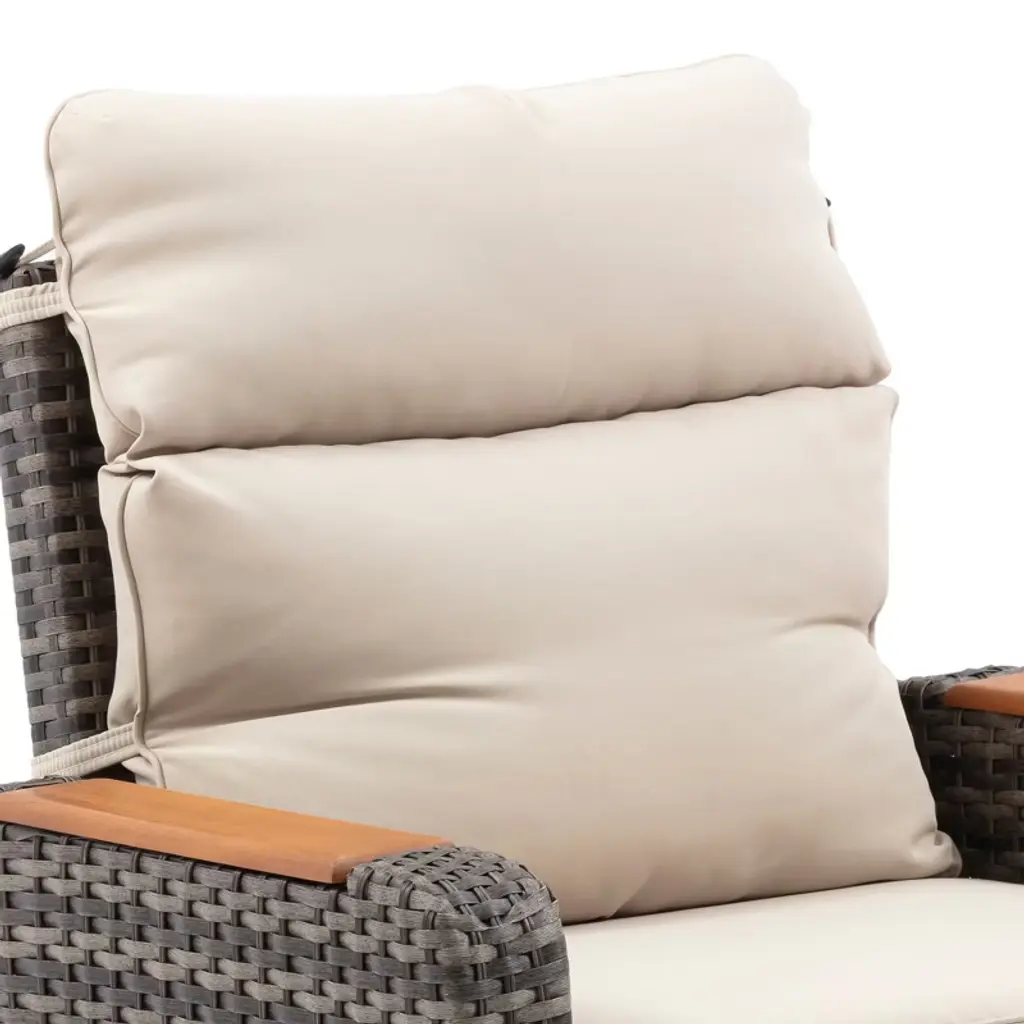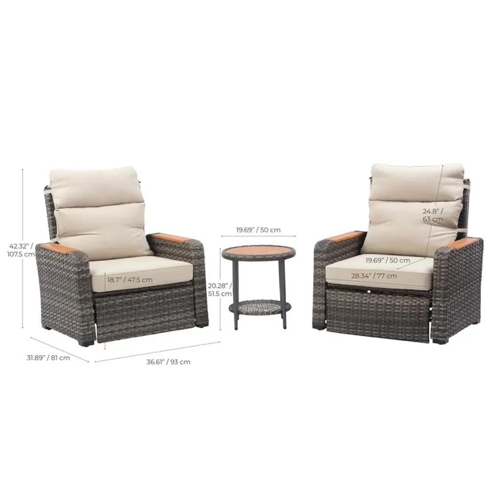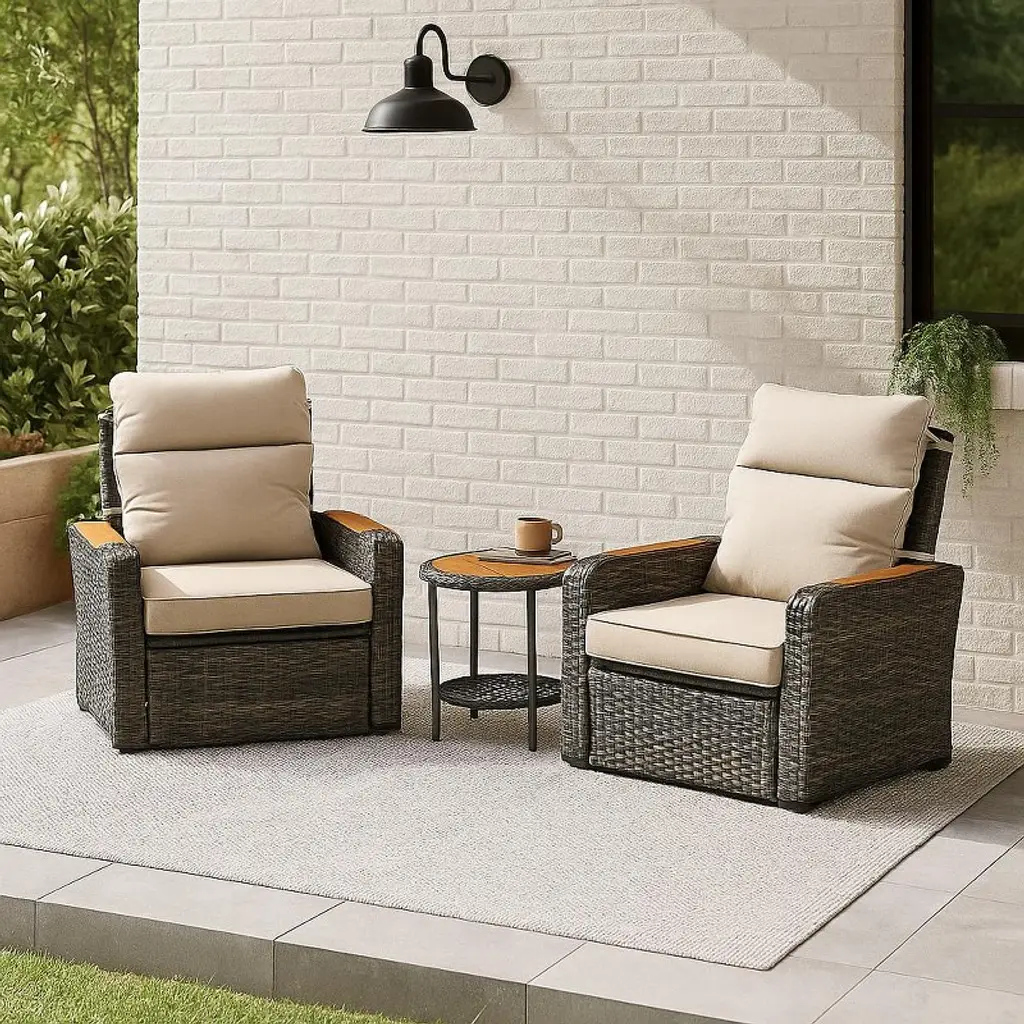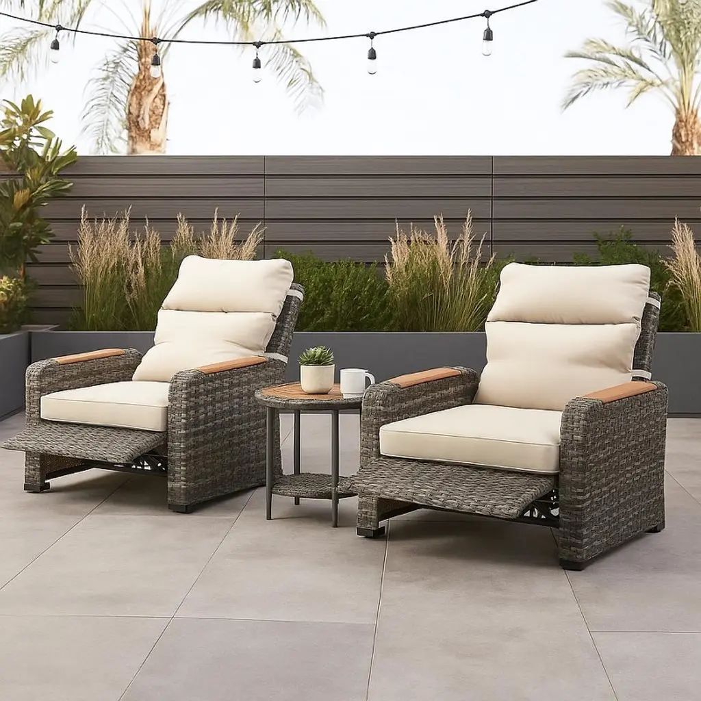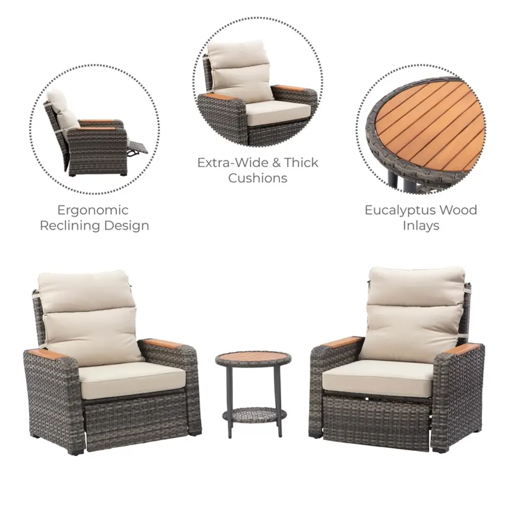 Some furniture just fits your lifestyle—this set does exactly that. With the wicker, reclining chairs that invite you to lean back and relax, and cushions that hold up to sun and weather, it's built for real-life comfort. The side table is perfect for a morning coffee or evening snack, and eucalyptus wood accents add that extra touch of warmth. Whether it's for slow mornings or after-dinner chats, this set is ready.