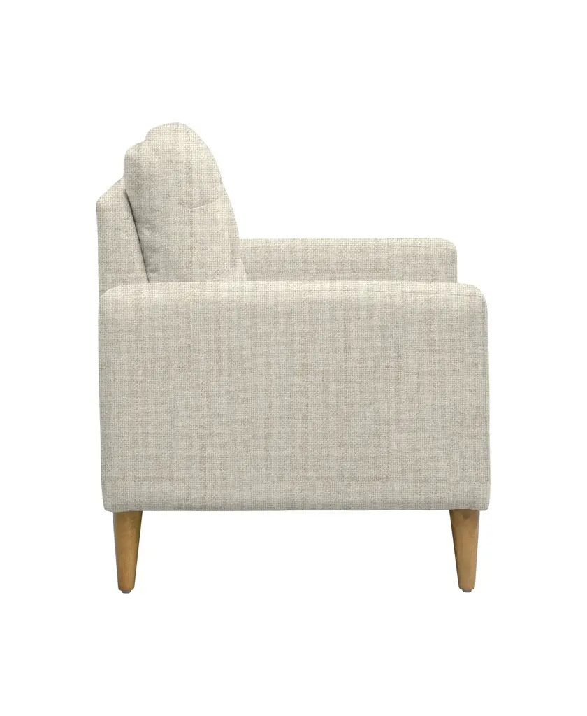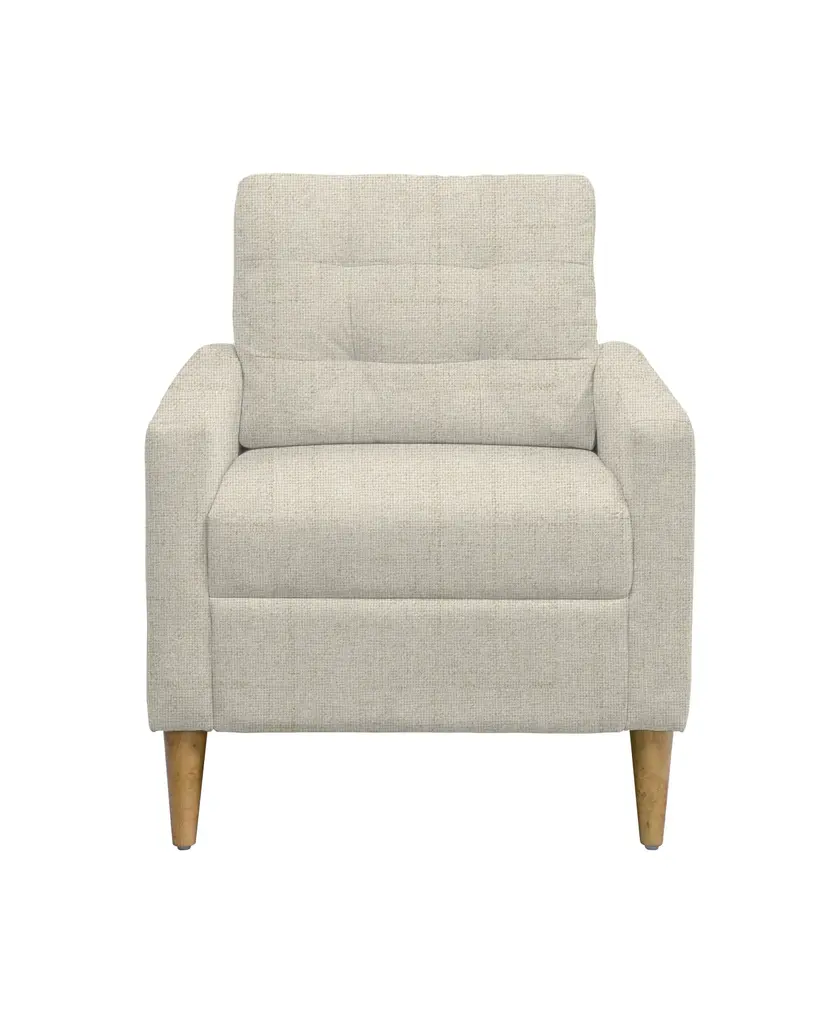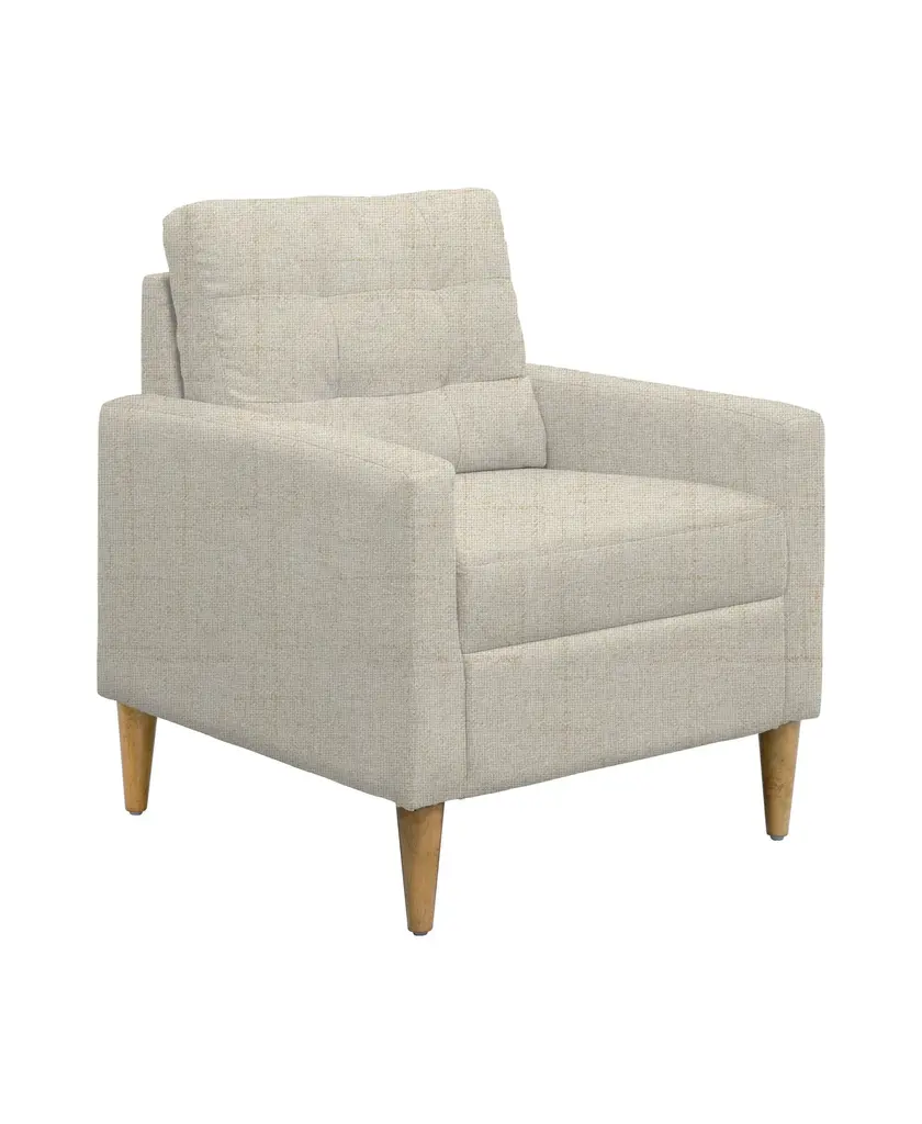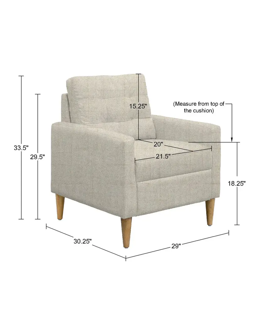 DESCRIPTIONUpgrade your living space with our modern accent chair. With clean lines and a sleek track arm silhouette, it offers a contemporary touch to any room. Built to last, it features a sturdy solid wood and plywood frame, sinuous springs, and web suspension seat support. The high-density foam provides superior support, and the adjustable levelers and tool-less assembly make it easy to set up.FEATURES? Modern, contemporary design with clean lines and track arm shilouette? Sturdy armchair made with sold wood and plywood frame? Solid wood legs in a natural tone finish? Attached cushions, not removable or reversible? Detachable back pillow, not reversible? High-density foam offers superior support and may feel initially firm. Over time, the foam will soften and provide optimal comfort? Adjustable levelers? Tool-less assemblyMATERIALSFrame: Solid wood and plywoodLeg: Solid woodArm: PlywoodFabric: 100% polyester, wovenSeat Cushion Fill: FoamWood Finish: NaturalSIZE DESCRIPTIONOverall:29"W x 30.25"D x 33.5"HSeat:21.5"W x 20"D x 18.25"HArm:21.5"W x 23.25"HLeg:6.25"HBack Rest:21.5"W x 15.25"HWeight Capacity:300 lbs