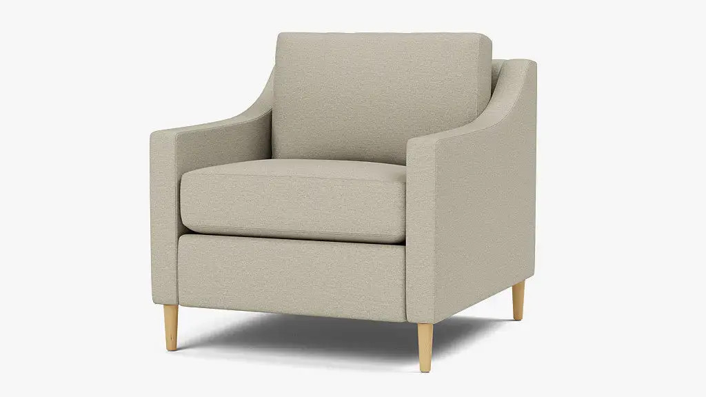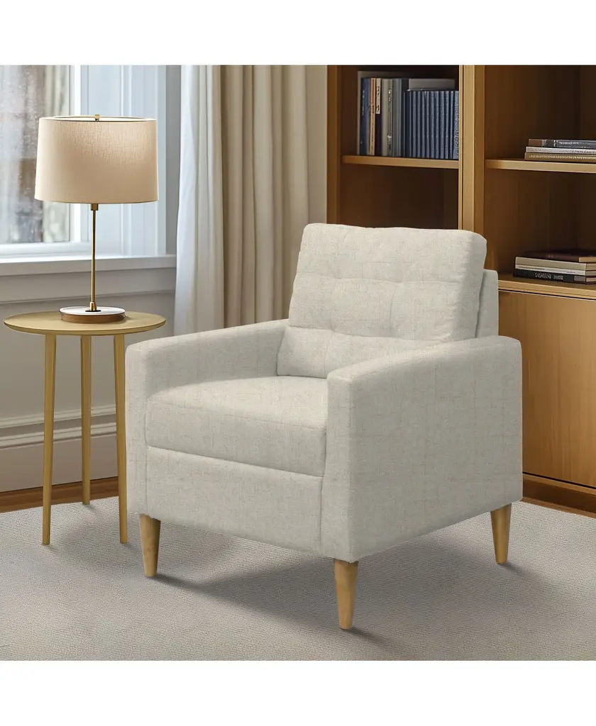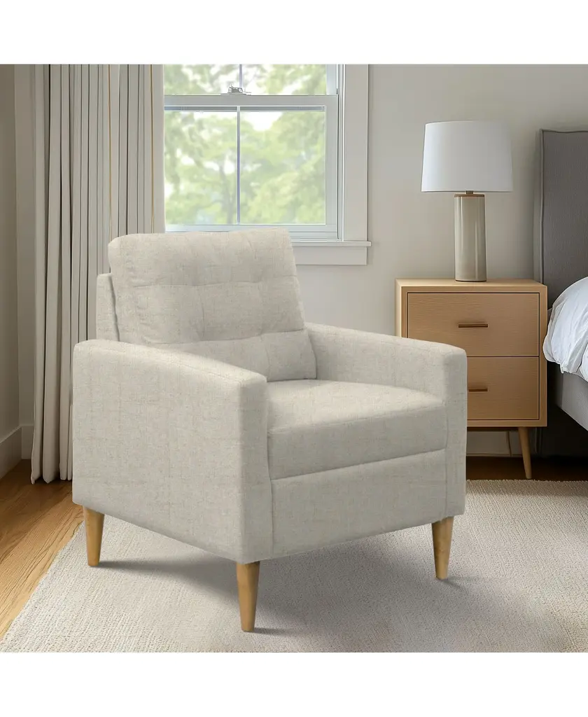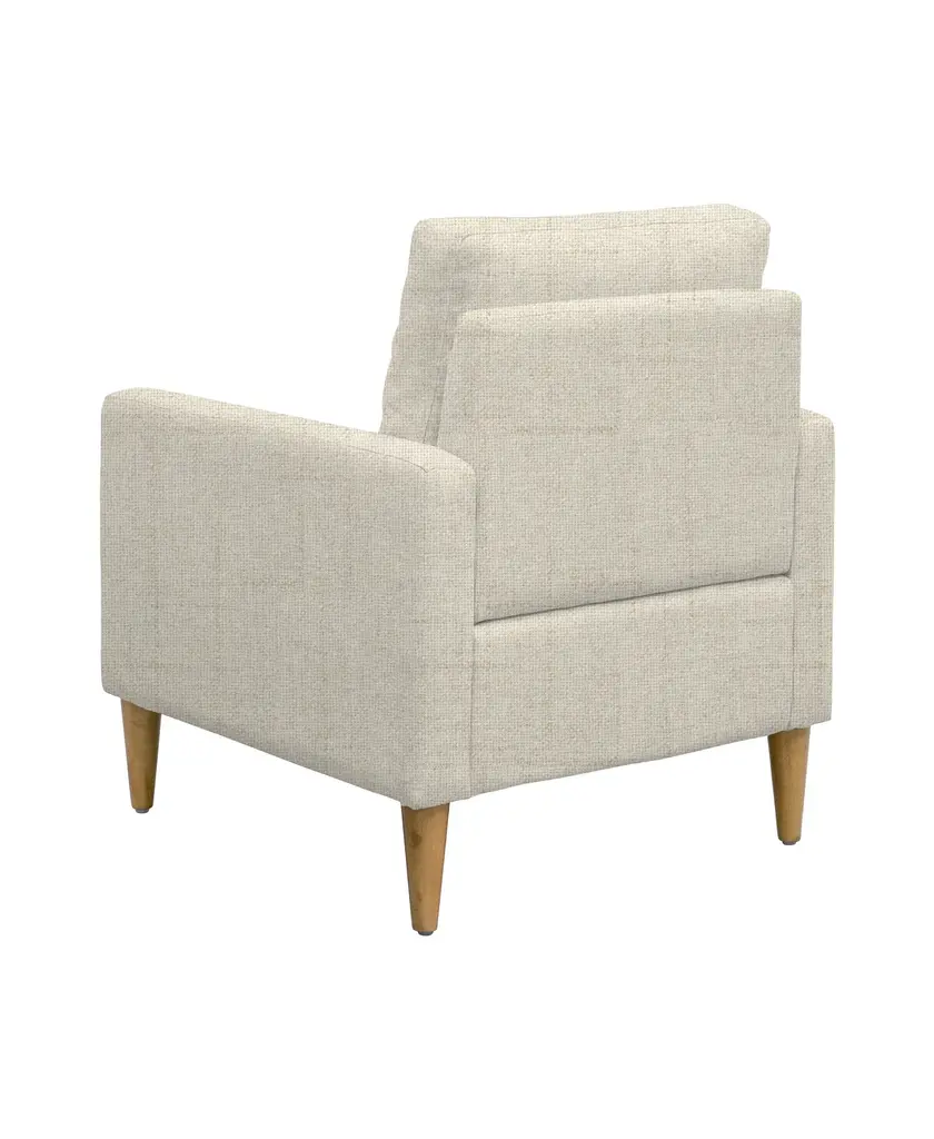 DESCRIPTIONUpgrade your living space with our modern accent chair. With clean lines and a sleek track arm silhouette, it offers a contemporary touch to any room. Built to last, it features a sturdy solid wood and plywood frame, sinuous springs, and web suspension seat support. The high-density foam provides superior support, and the adjustable levelers and tool-less assembly make it easy to set up.FEATURES? Modern, contemporary design with clean lines and track arm shilouette? Sturdy armchair made with sold wood and plywood frame? Solid wood legs in a natural tone finish? Attached cushions, not removable or reversible? Detachable back pillow, not reversible? High-density foam offers superior support and may feel initially firm. Over time, the foam will soften and provide optimal comfort? Adjustable levelers? Tool-less assemblyMATERIALSFrame: Solid wood and plywoodLeg: Solid woodArm: PlywoodFabric: 100% polyester, wovenSeat Cushion Fill: FoamWood Finish: NaturalSIZE DESCRIPTIONOverall:29"W x 30.25"D x 33.5"HSeat:21.5"W x 20"D x 18.25"HArm:21.5"W x 23.25"HLeg:6.25"HBack Rest:21.5"W x 15.25"HWeight Capacity:300 lbs