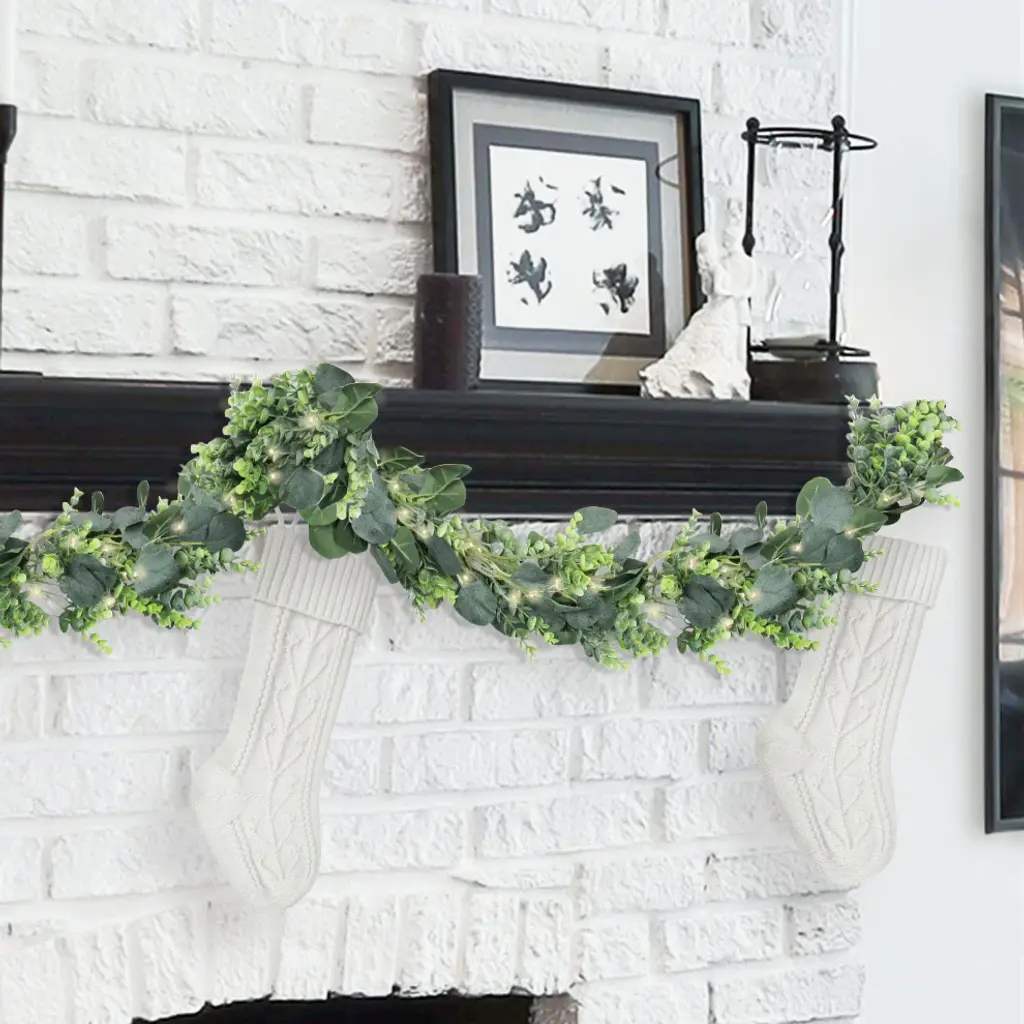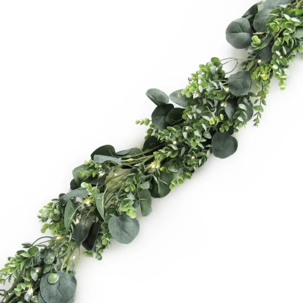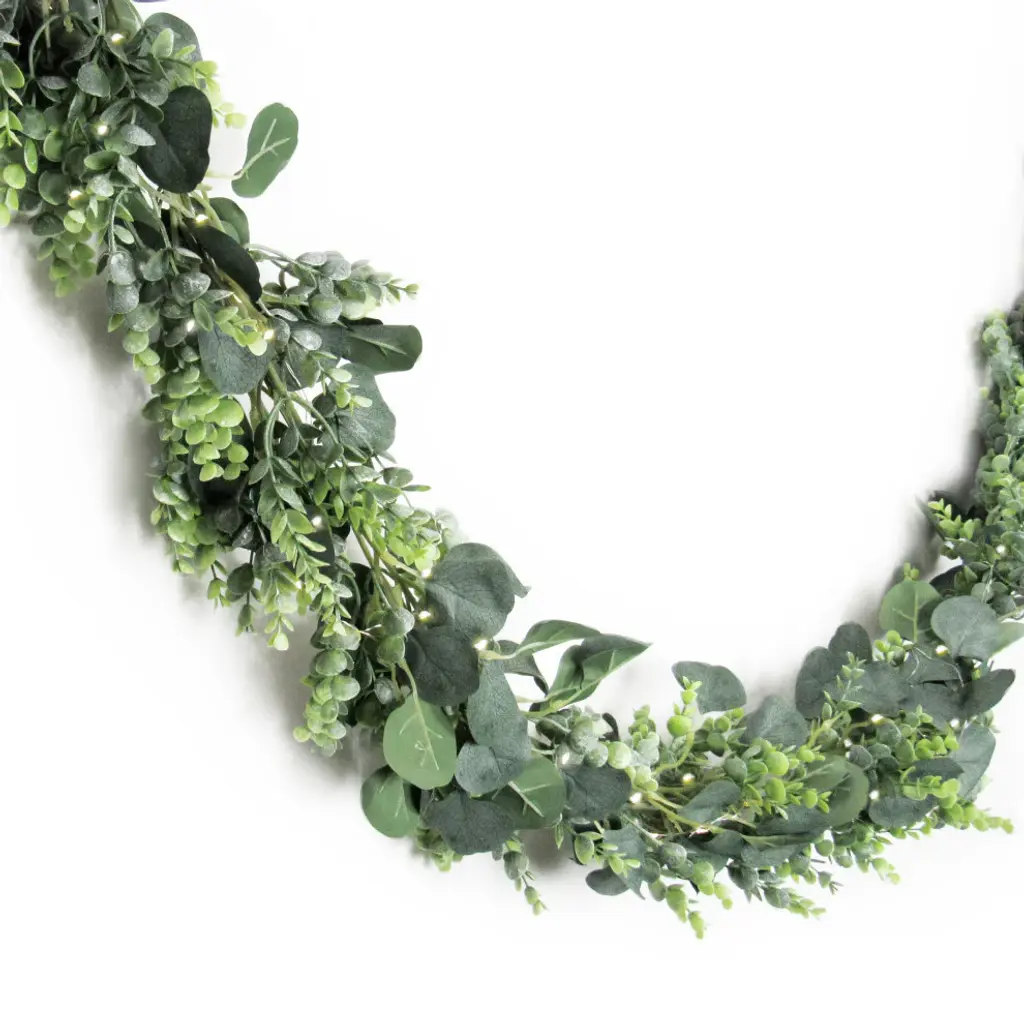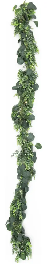 Charming and full, this gorgeous eucalyptus garland is versatile for any display setting - mantels, tabletops, chairs, walls and more. Hang from the ceiling, wrap around arches and columns, or arrange with other plants and floral displays. Perfect accent for home, weddings and special events! Its realistic and fresh look is eye-catching and hard to miss! Forever fresh, no maintenance or hassle.Features: • 72" L x 6" W x 6" DP• Realistic and detailed silver dollar eucalyptus leaves and color variegation• Bendable & flexible garland branch, perfect for hanging as home decor or event decor • Pre-strung with white LED lights, battery operated• Dangling, hanging, lightweight• Best for indoor or covered outdoor usage• Product may ship compressed. Primping of branches or leaves may be required to match the image shown.Images represent actual product, but please understand color may vary slightly due to differences in computer monitor color displays, photographic lighting, or image enhancement.