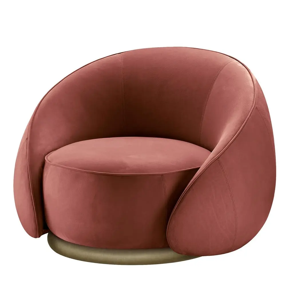 The comforting feeling of an hug inspired the enveloping silhouette of this plush armchair, marked by a curved shell with sloping sides that shares with the cylindrical seat the same plump padding. Luxuriously covered in red-hued leather for a pleasant tactile feel, it makes for a sophisticated solution to amplify the comfort in a modern living room or bedroom decor. A bold ring accents the base.