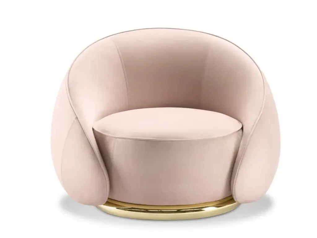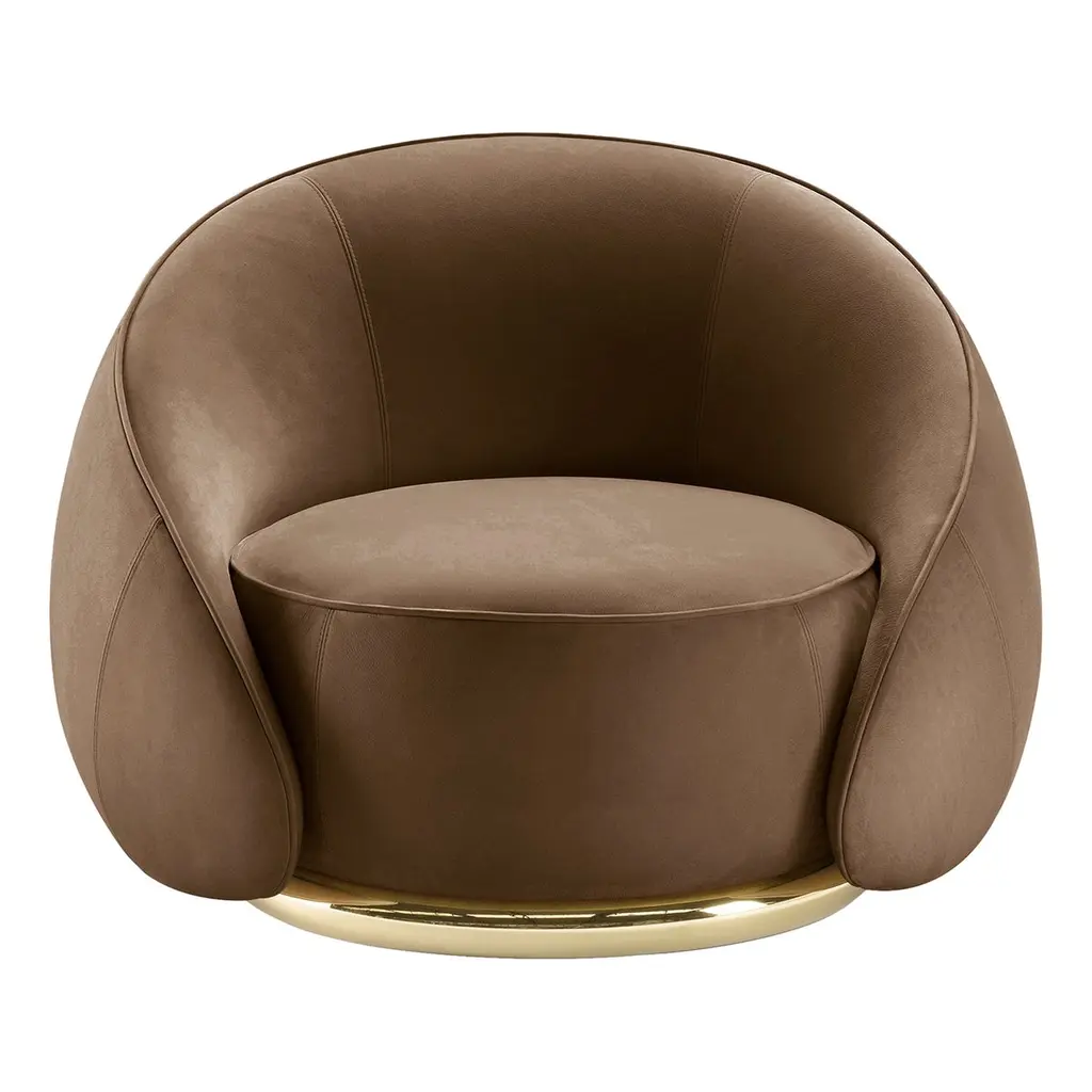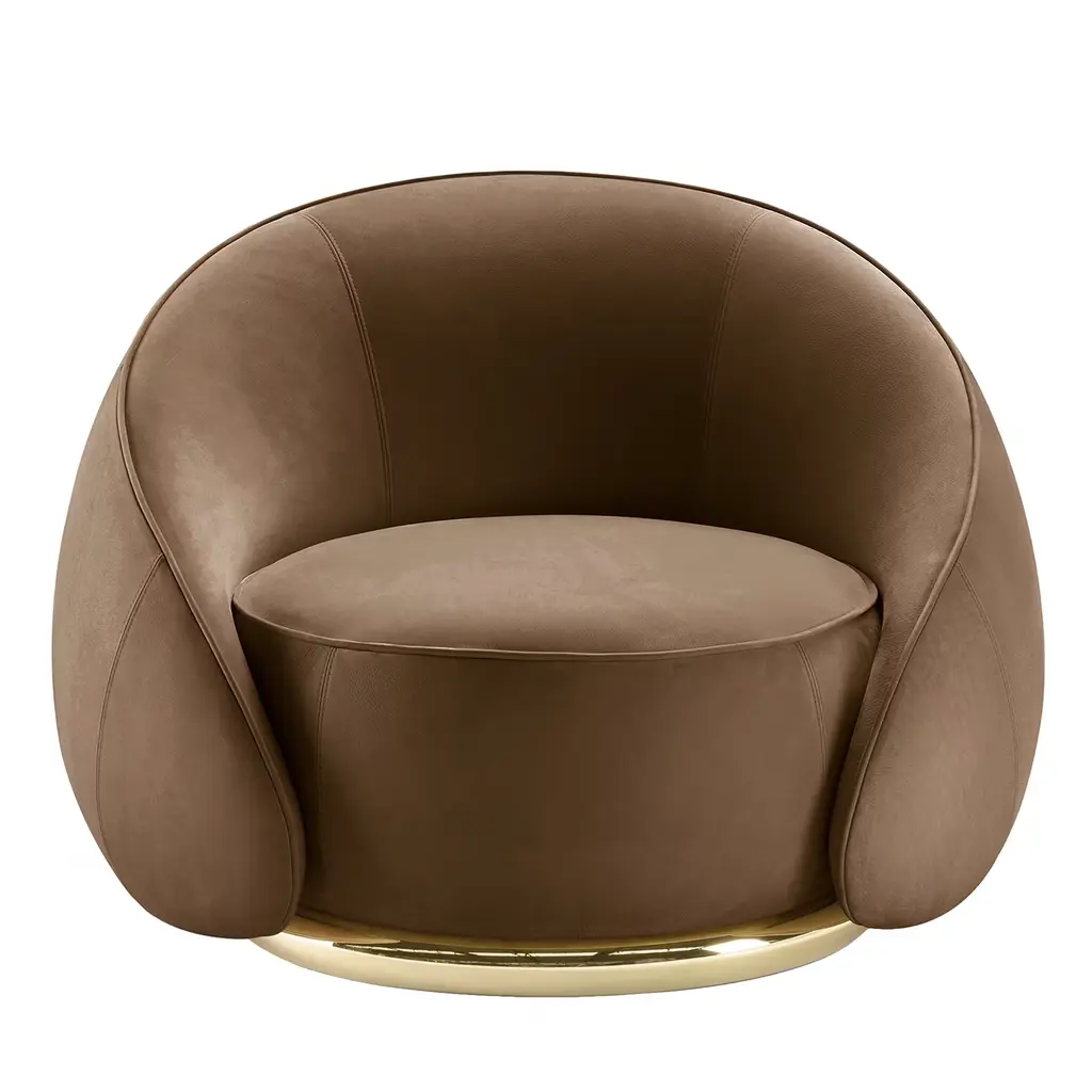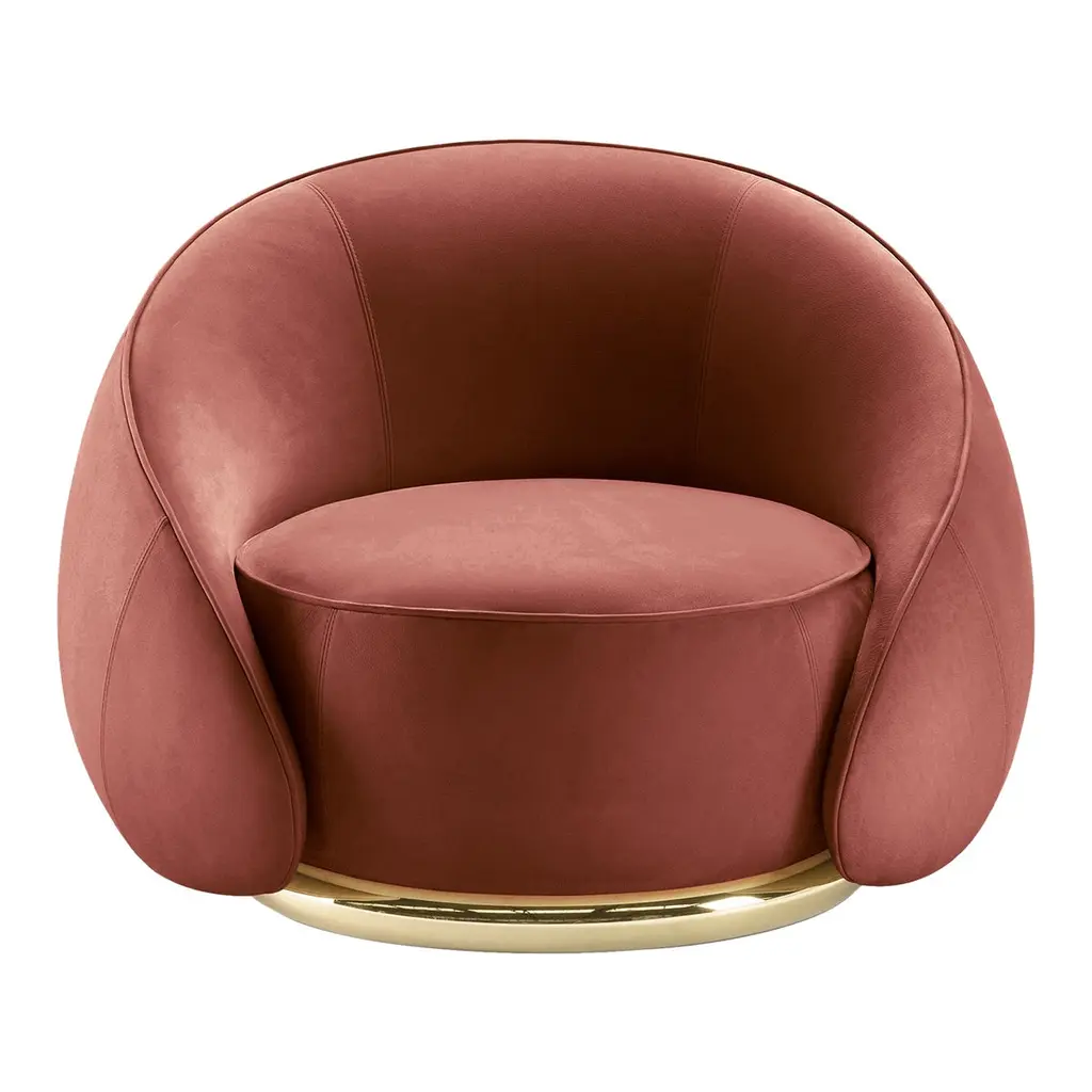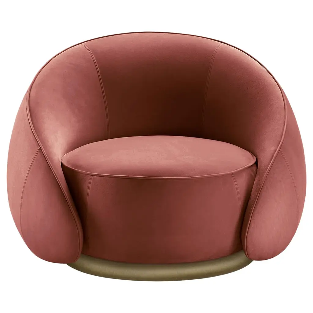 This glamorous armchair designed by Lorenza Bozzoli was inspired by hugs ("abbracci" in Italian). A glistening ring accents the base, surmounted by a cylindrical seat and fully enveloped by the backrest whose sides slope to shape the armrests. Richly padded and luxuriously upholstered with red-hued leather, it will create a cozy spot where to relax for a while. Please consult the Concierge for other available color options. For the US market, please contact the Concierge for CAL TB 117 certified fabrics.