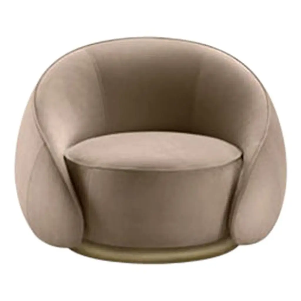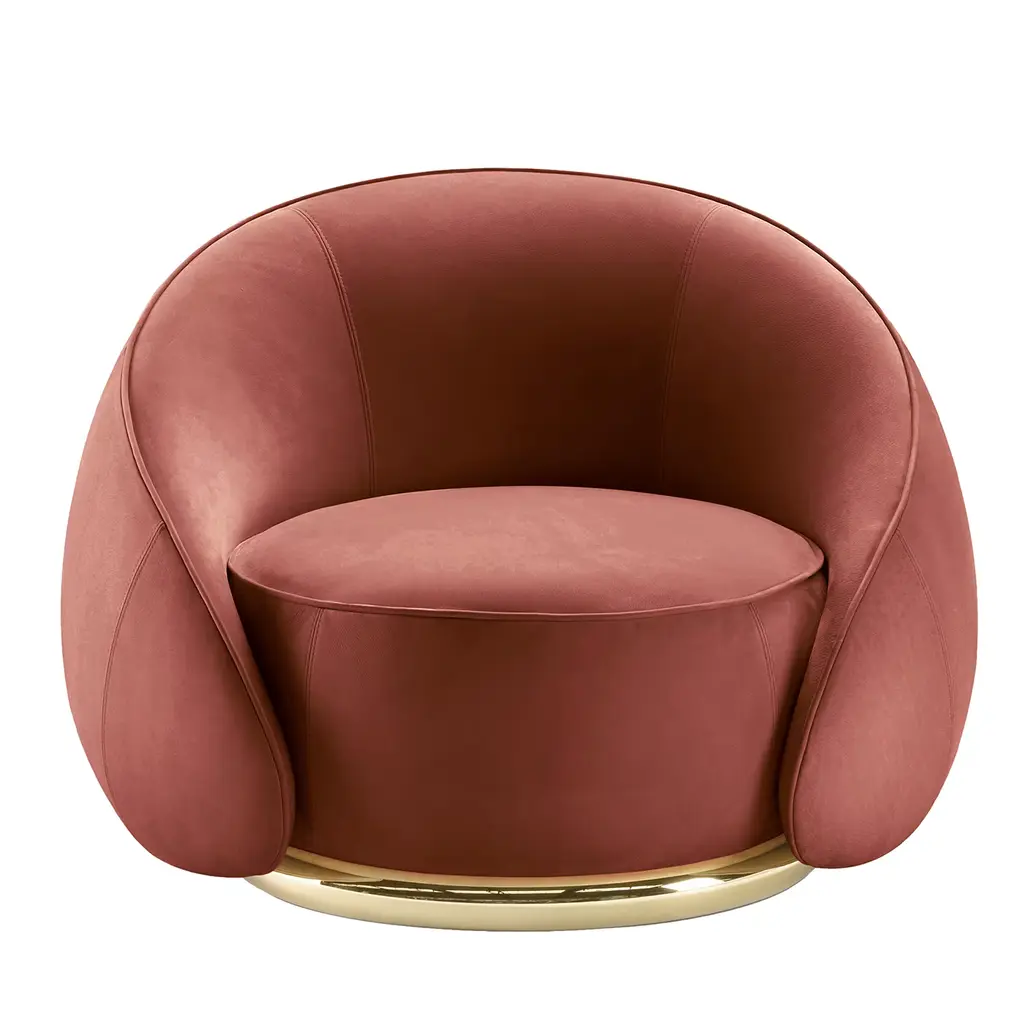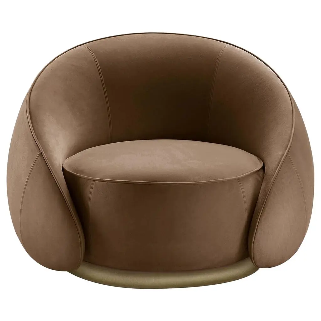 Designer Lorenza Bozzoli conceived this plush armchair as a clever actualization of hugs ("abbracci" in Italian), revealed by the embracing design of the backrest wrapped around the cylindrical seat. It features sloping sides shaping the armrests and descends down to the glaring ring accenting the base as a detail that adds to its glamorous character.