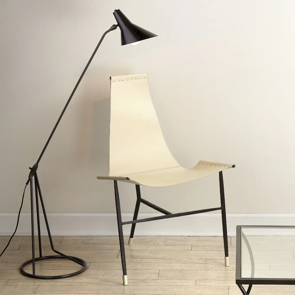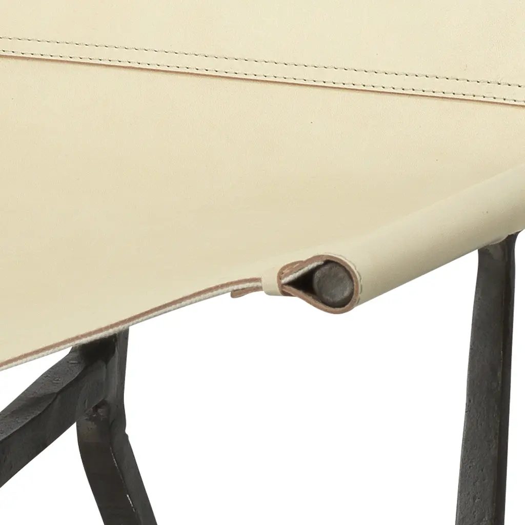 Mixing the warmth of leather with a sleek metal chair frame makes our chair both rustic and modern. Inspired by mid-century modern designs, this chair in hand-forged of iron and features a sling-style seat that is reiforced with chunky leather stitching for sturdiness and durability.