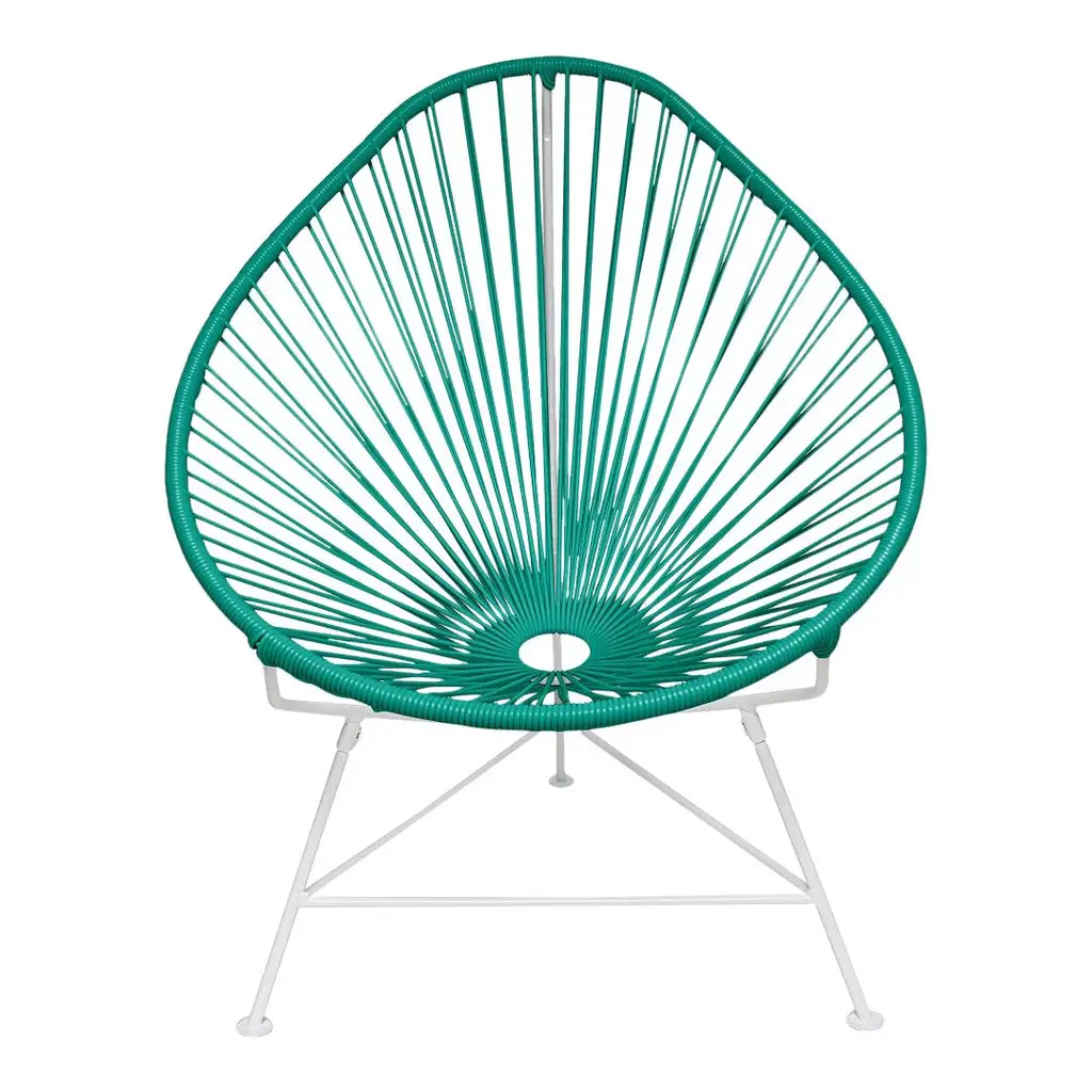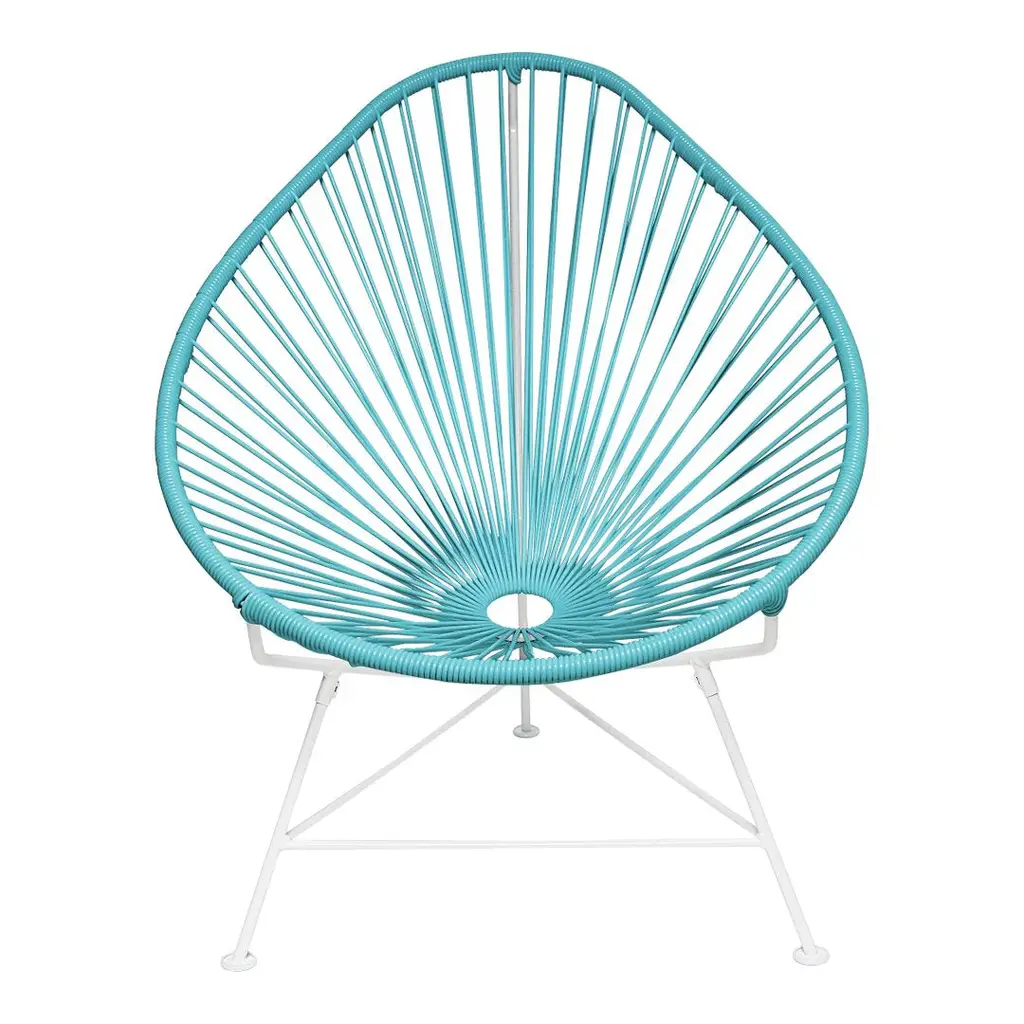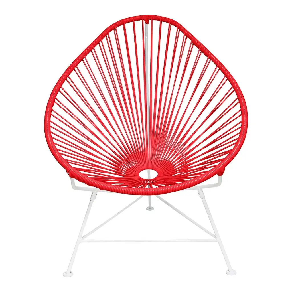 The Acapulco Chair - contemporary lounge or occasional chair suitable for indoors and out. Composed of a tripod metal base and seat woven with vinyl cord. The Acapulco chair is similar in construction and form to our Innit chair though slightly more reclined with a pear shaped frame. The galvanized steel is rust resistant and the very durable yet flexible, UV protected vinyl will stay colorfast for years. This chair is incredibly comfortable without a cushion. It's weatherproof, breathable, stackable, easy to clean, and available in everybody's favorite color. A great, modern design for commercial and residential applications. Pretty good innit