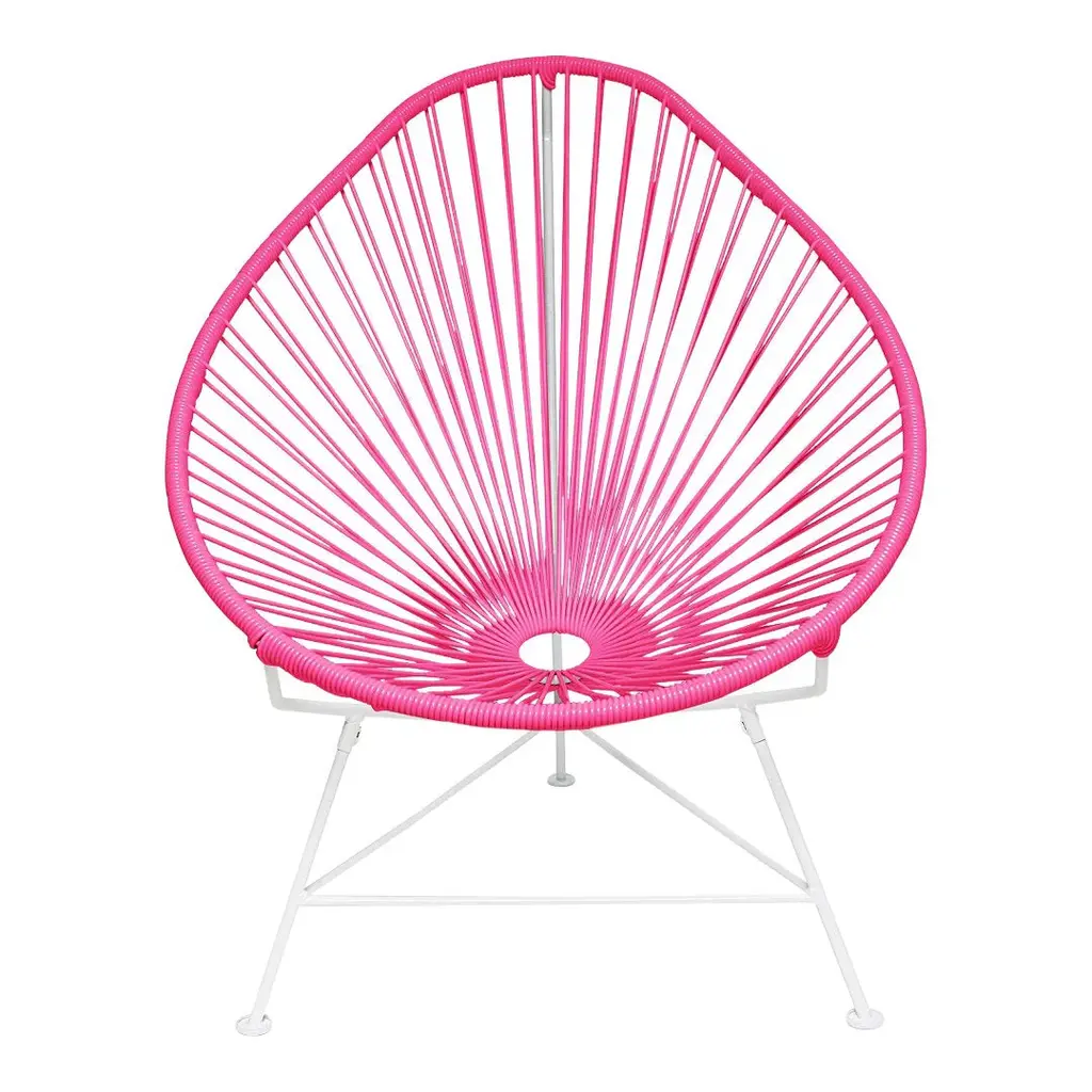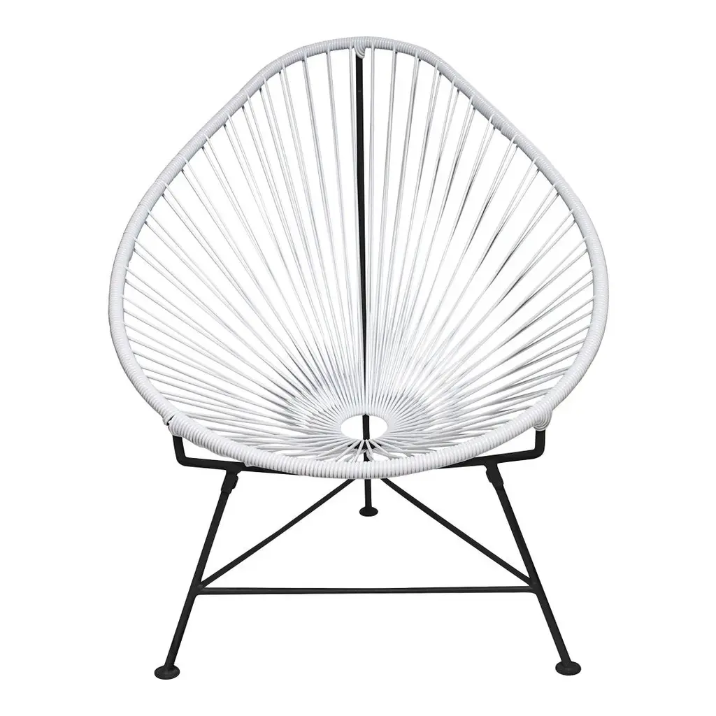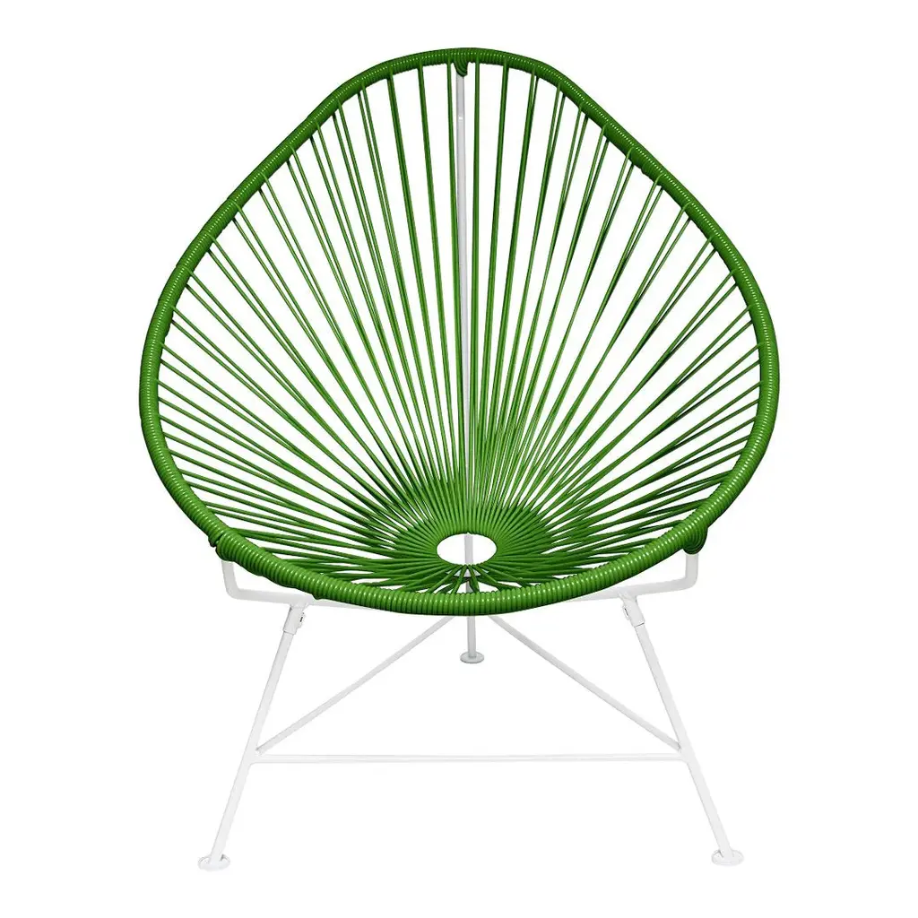 The Acapulco Chair - contemporary lounge or occasional chair suitable for indoors and out. Composed of a tripod metal base and seat woven with vinyl cord. The Acapulco chair is similar in construction and form to our Innit chair though slightly more reclined with a pear shaped frame. The galvanized steel is rust resistant and the very durable yet flexible, UV protected vinyl will stay colorfast for years. This chair is incredibly comfortable without a cushion. It's weatherproof, breathable, stackable, easy to clean, and available in everybody's favorite color. A great, modern design for commercial and residential applications. Pretty good innit