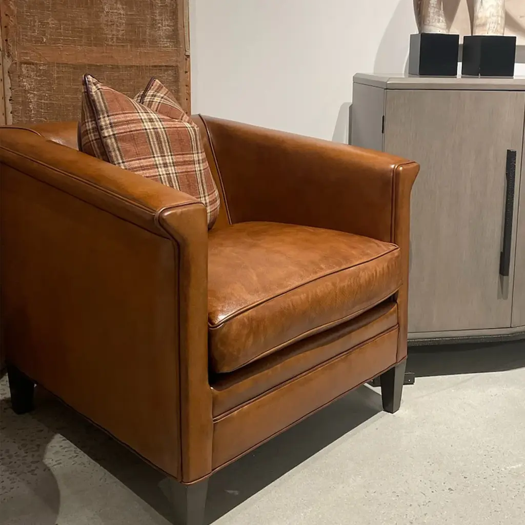 A welcome addition to our line, the Ace Leather Chair features strong edges and warm leather to create a statement piece for any living space, office, or den. Soften it with a pillow, or play up the rich leather and leave it to stand alone. Ships In 8-10 Weeks One loose seat cushion As Shown Fabric: Sauvage Bark, Sauvage Saddle (lifestyle) As Shown Finish: Antique Walnut This product can be special ordered in additional leathers, finishes, and cushion fillings. Click here to email us for for additional information about special ordering.This image is for illustrative purposes only. The colors shown are accurate within the constraints of lighting, photography, and the color accuracy of your screen.Leather is an imperfect product with shade variations a very real possibility. Lillian August will not be held responsible for matching any colors to your existing decor, or any shade variances inherent with all leather products.