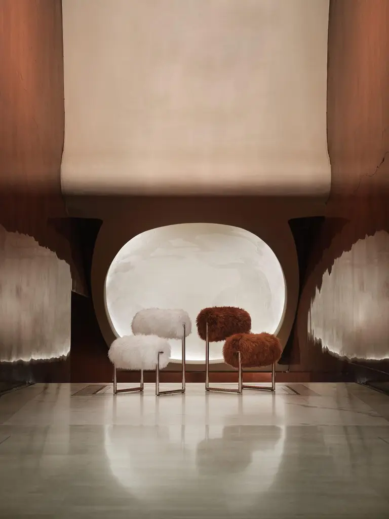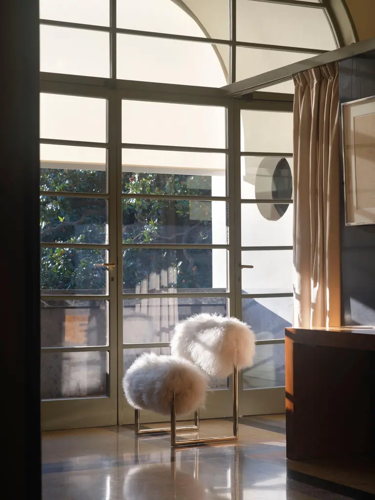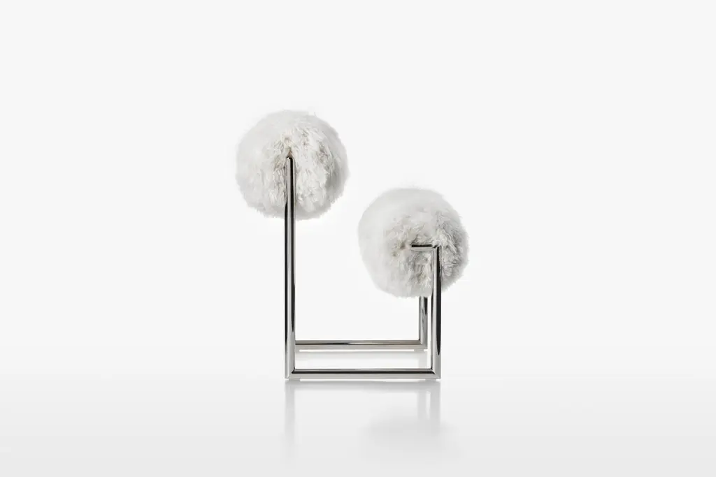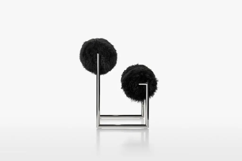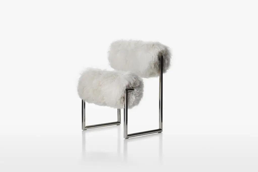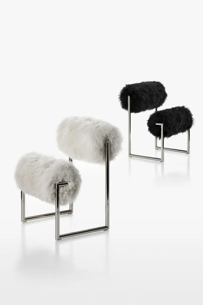 Featuring aesthetics that speak a language of the Future,the Due Più armchair can be considered one of Nanda Vigo’smanifesto-projects, the synthesis of her two souls: her esprit degéométrie evident in the light-reflecting minimal metal structureand her eccentric and pioneering spirit. A surprising andenigmatic object with a unique physiognomy conferred by theuse of the two rollers that seem to float. Although its appearancesuggests otherwise, all three modes of use are surprisinglyergonomic and comfortable: regular sitting, side sitting with onearm resting on the upper roller, and reverse sitting, in which theroller-back becomes the perfect support for the forearms. It isreinterpreted today with a steel frame and fur recovered fromfood industry waste, in a logic of circular economy that makes itcompatible with the contemporary ethos.Back and seatThe seat and back are padded with single-density polyurethanefoam in a Ø19 cm cylindrical shape upholstered in Mongolia goatfur in white, black and rust. This upholstery gives the rollers avoluminous elegant effect.StructureSled frame in Ø3 cm tubular metal with chrome finish. Plasticfeet.DimensionsL51 D54.5 H72, seat H47 cm.
