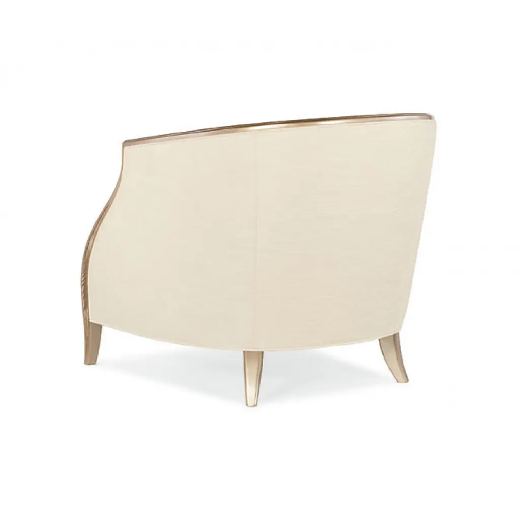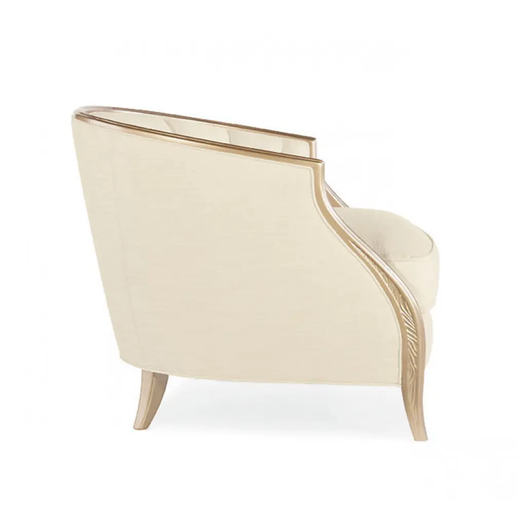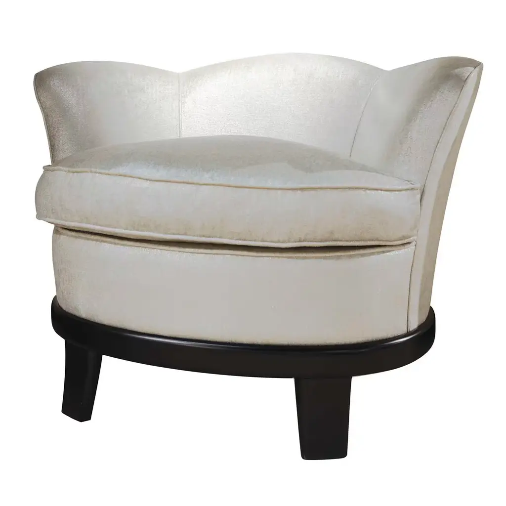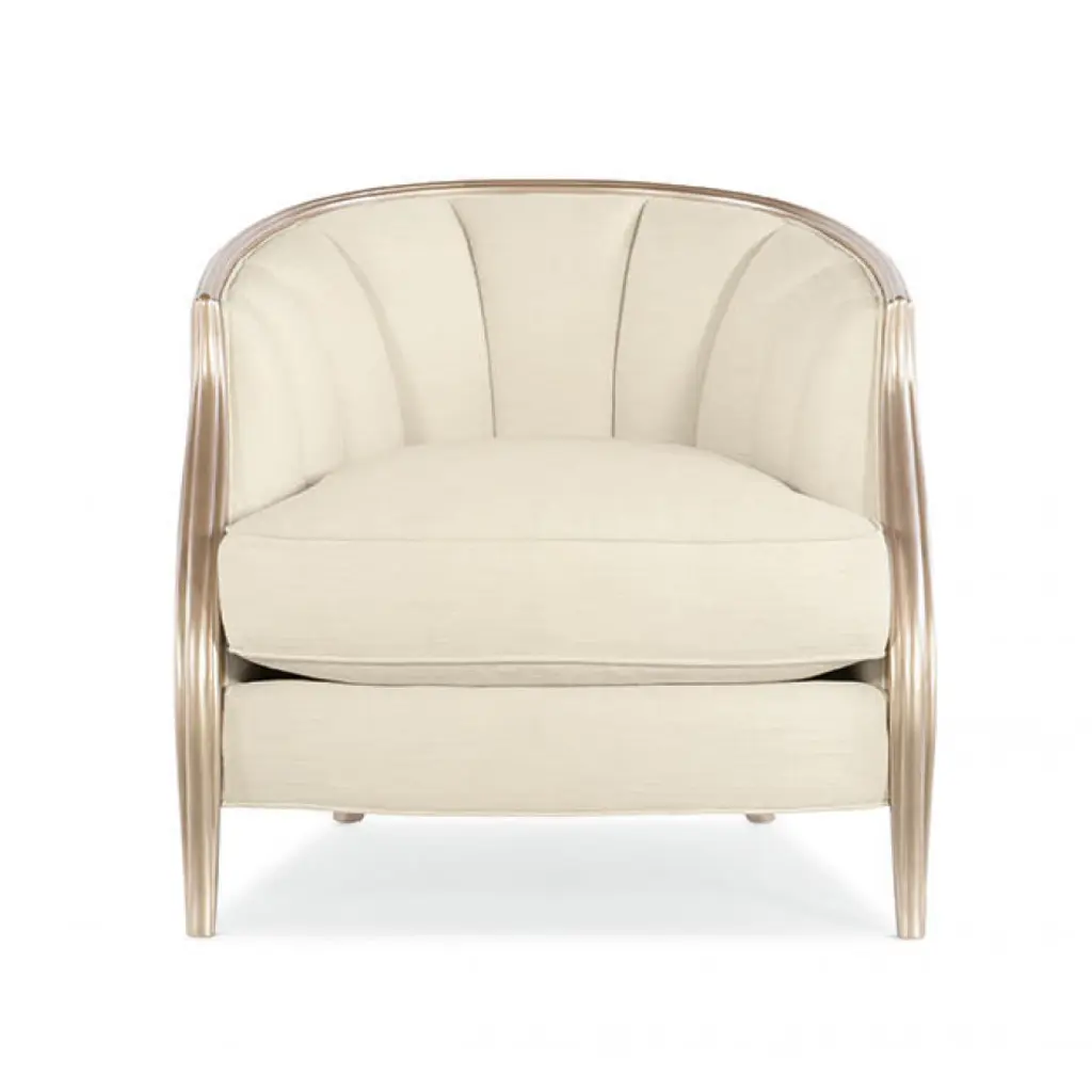 The feminine tailoring of this collection comes to life in this perfectly proportioned lounge chair. Its soft curves and subtle movement offer a pleasing sense of calm because nothing is busy or overly designed. Wrapped in a chic, creamy boucle fabric that has a soft shimmer, the exposed frame and contemporary conical feet are finished in a soft metallic Blush Taupe. This barrel chair has an elegant outward beauty and exudes a sense of opulence with its welcoming proportions, scallop-tufted back and generous seat cushion.