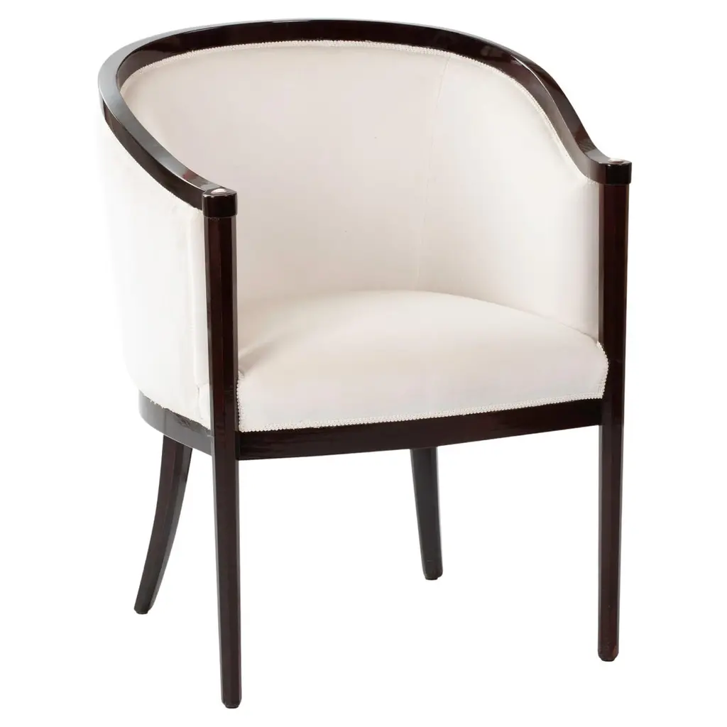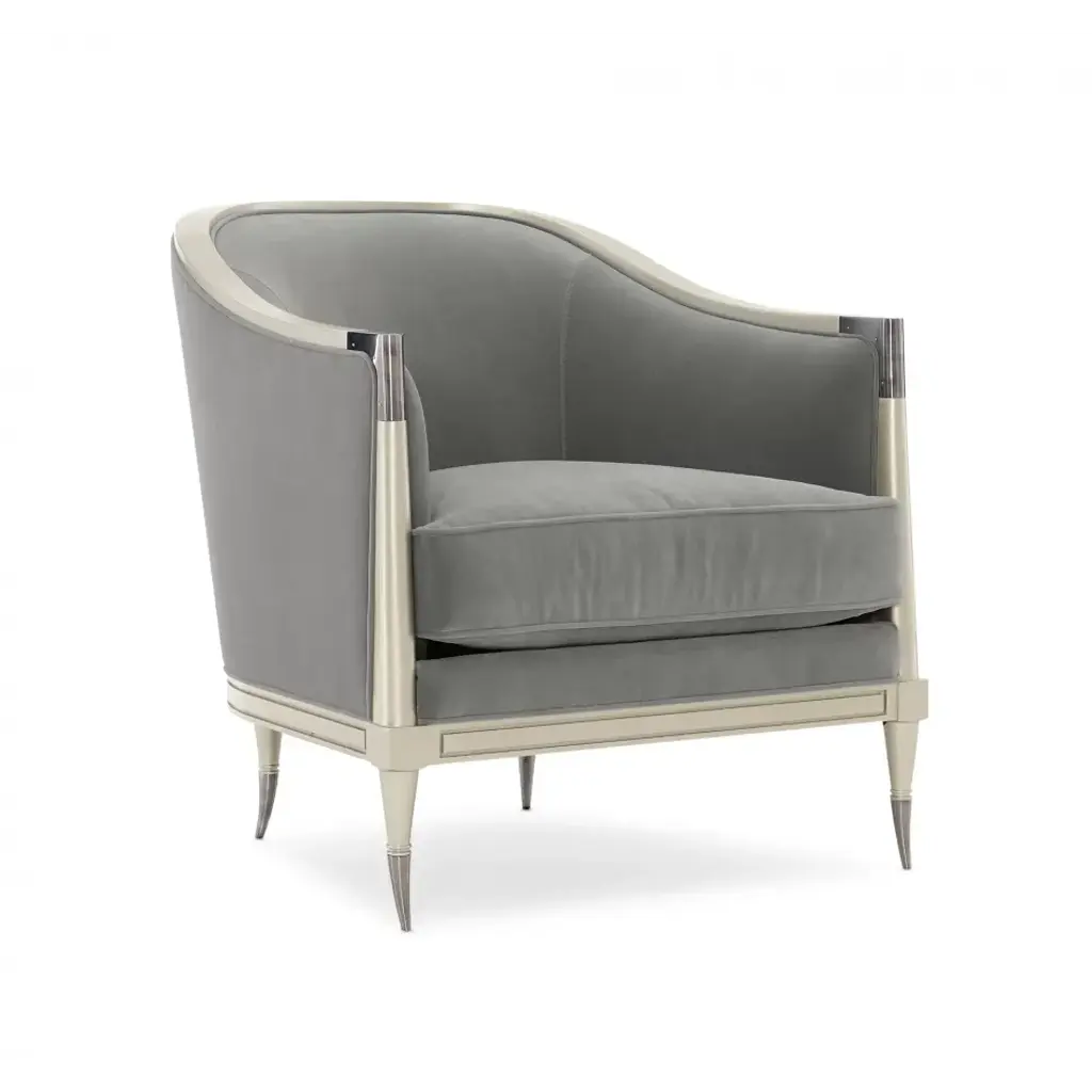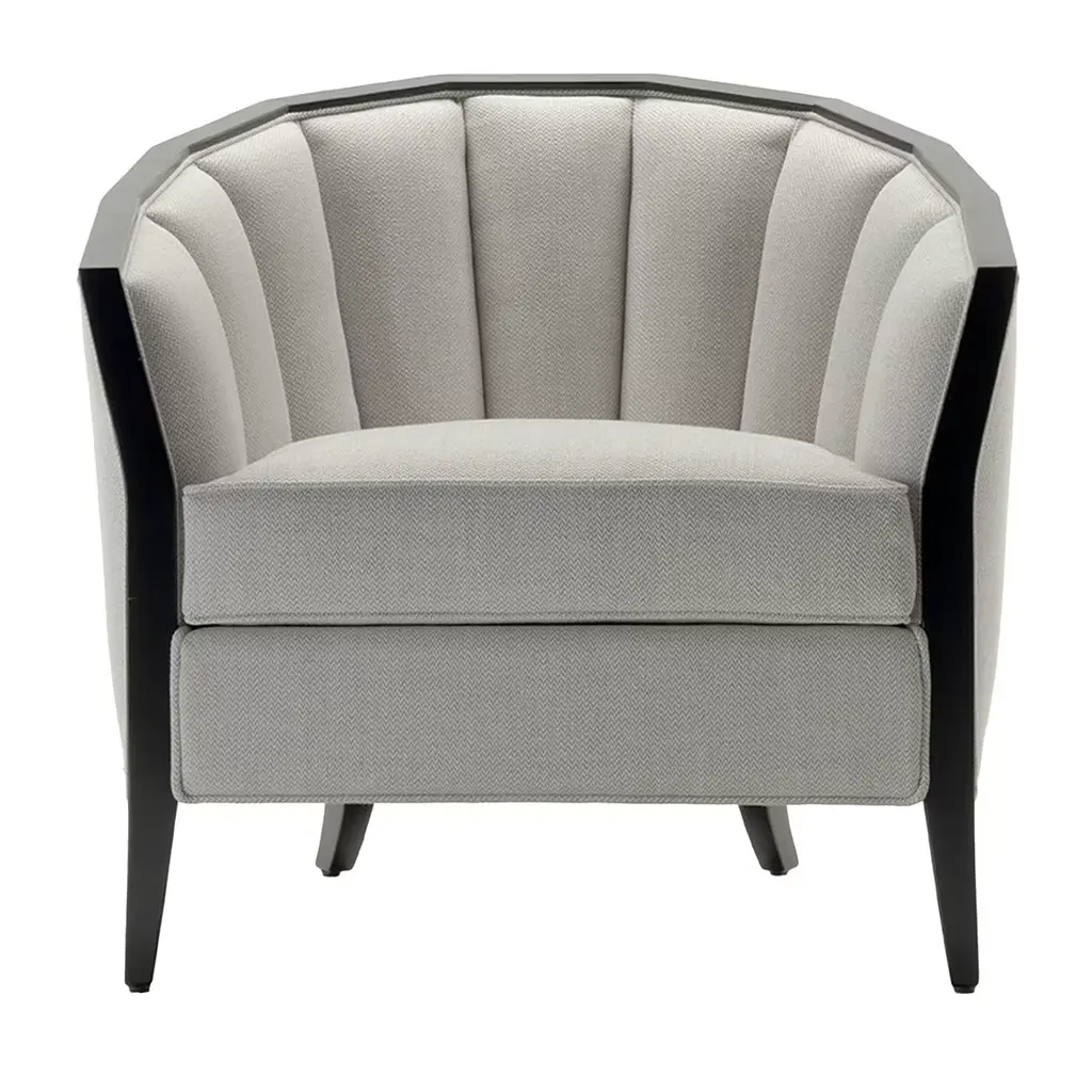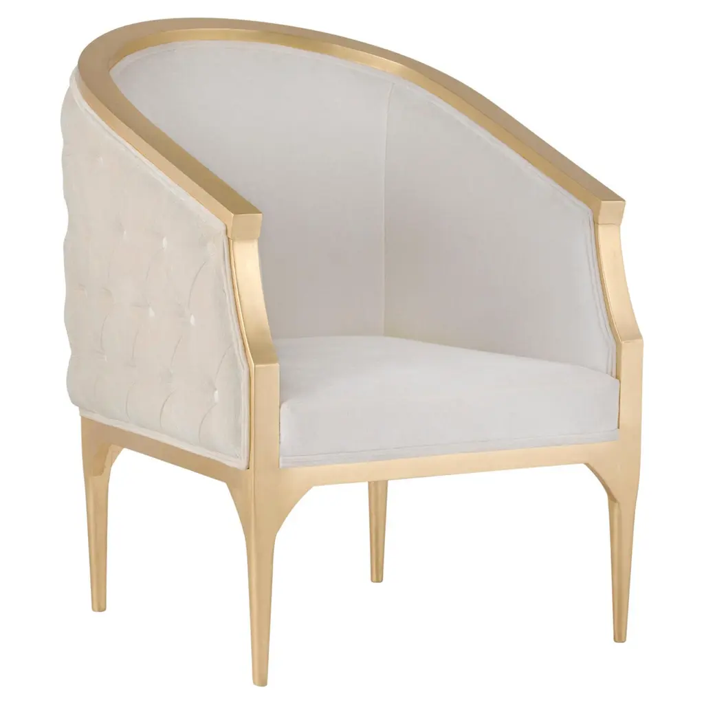 The feminine tailoring of this collection comes to life in this perfectly proportioned lounge chair. Its soft curves and subtle movement offer a pleasing sense of calm because nothing is busy or overly designed. Wrapped in a chic, creamy boucle fabric that has a soft shimmer, the exposed frame and contemporary conical feet are finished in a soft metallic Blush Taupe. This barrel chair has an elegant outward beauty and exudes a sense of opulence with its welcoming proportions, scallop-tufted back and generous seat cushion.