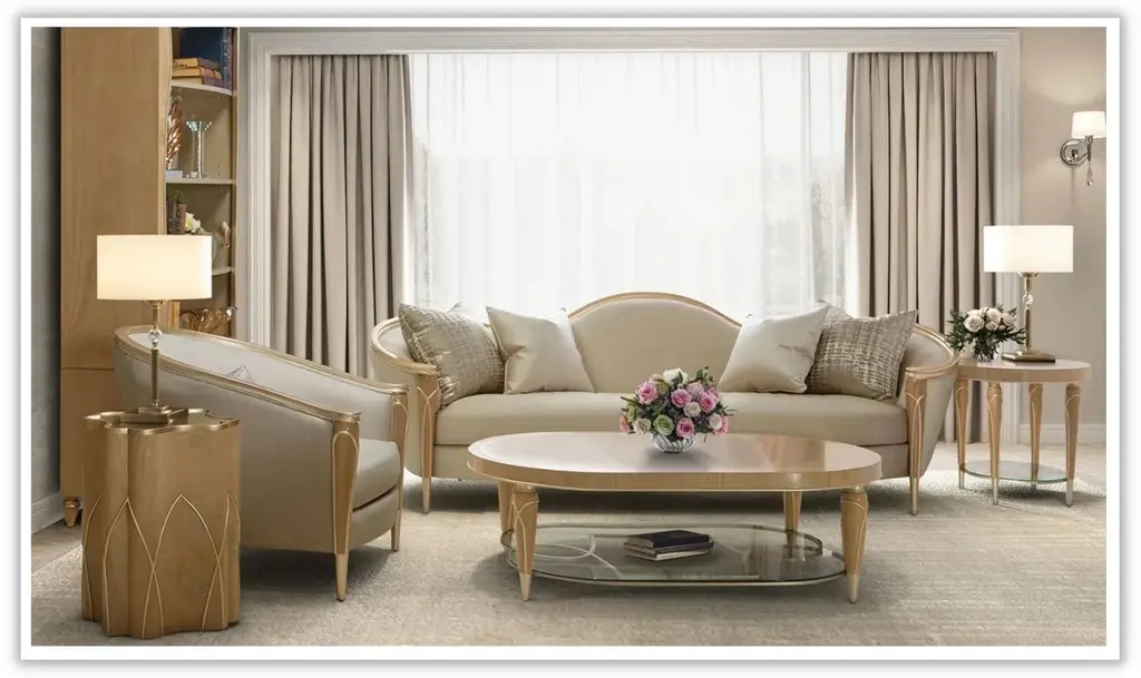 Introducing the Villa Cherie Caramel Matching Curved Chair with Wooden Arm—a timeless blend of traditional elegance and modern sophistication for your living space. Crafted with meticulous attention to detail, this collection redefines luxury with its graceful curves, rich hazelnut tones, and swirling mahogany surfaces. The chair, adorned with curving armrests in frosted linen, invites you to sink into comfort and style. The tapered front legs, finished in warm caramel, feature exquisite crossed rope motifs in chardonnay, adding a touch of rustic charm. The Chardonnay finish extends to the rail, armrests, and feet, creating a seamless and harmonious look. The Villa Cherie Chair is not just furniture; it's an expression of everyday romance. The wave-shaped back rail adds a dynamic elegance reminiscent of Hollywood glamour, making every moment special. Whether you're hosting guests or enjoying a quiet evening, this chair elevates your living room with its timeless design. Experience the perfect shape for your space, where every detail is thoughtfully curated. The combination of tapered legs, Chardonnay trim, and frosted linen upholstery instantly brightens any room, creating an inviting atmosphere for relaxation and conversation. Indulge in the sophistication of the Villa Cherie collection, where traditional style meets modern design. Elevate your home with this luxurious chair that seamlessly blends into any décor, promising not just comfort but a statement of refined taste.