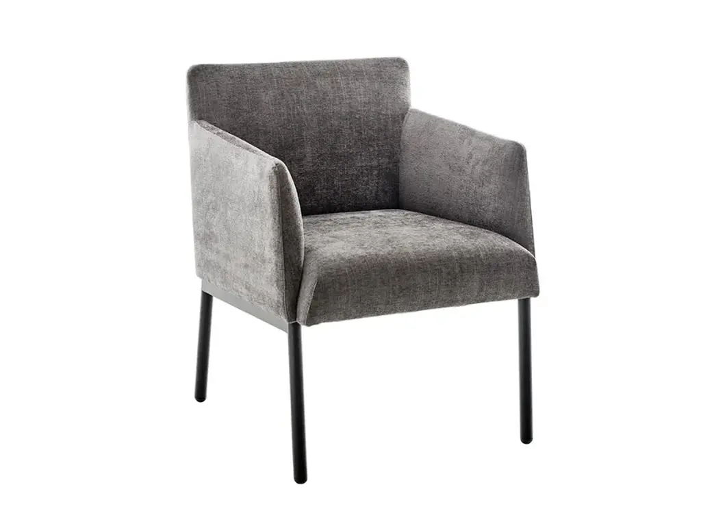 Upholstered armchair in fabric or eco-leather with plywood structure, painted metal legs from the AIR collection.Geometrically rigorous AIR gets softened in a welcoming and comfortable seating. The tailored attention to the detail enhances the design of seat and back. Lounge armchair and double-seating sofa are also available to furnish a hotel, office or wating-room.