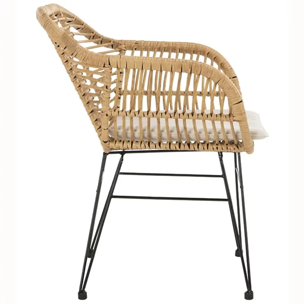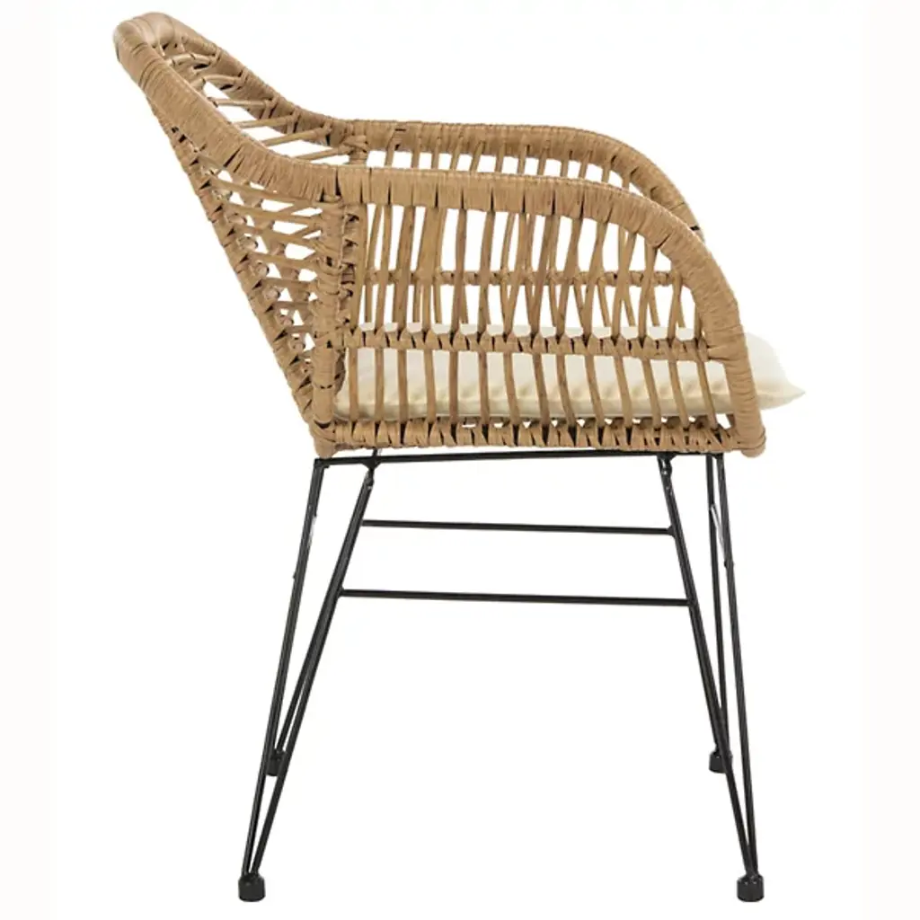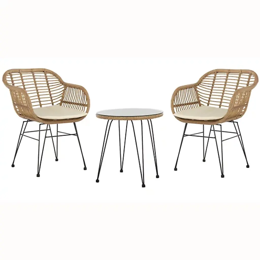 The Alemany Outdoor 3 Pcs Lounge Chair Set from Alder & Ore features a unique open-weave PE wicker pattern that provides optimal ventilation and comfort. Its steel hairpin legs add mid-century flair while ensuring stability on various outdoor surfaces. The accompanying side table echoes the chairs' design elements while providing a practical surface for snacks and drinks. Weather-resistant foam cushions wrapped in polyester fabric provide lasting comfort. This set combines retro inspiration with modern materials for enduring outdoor enjoyment.