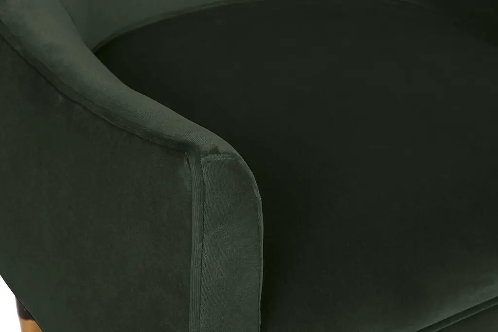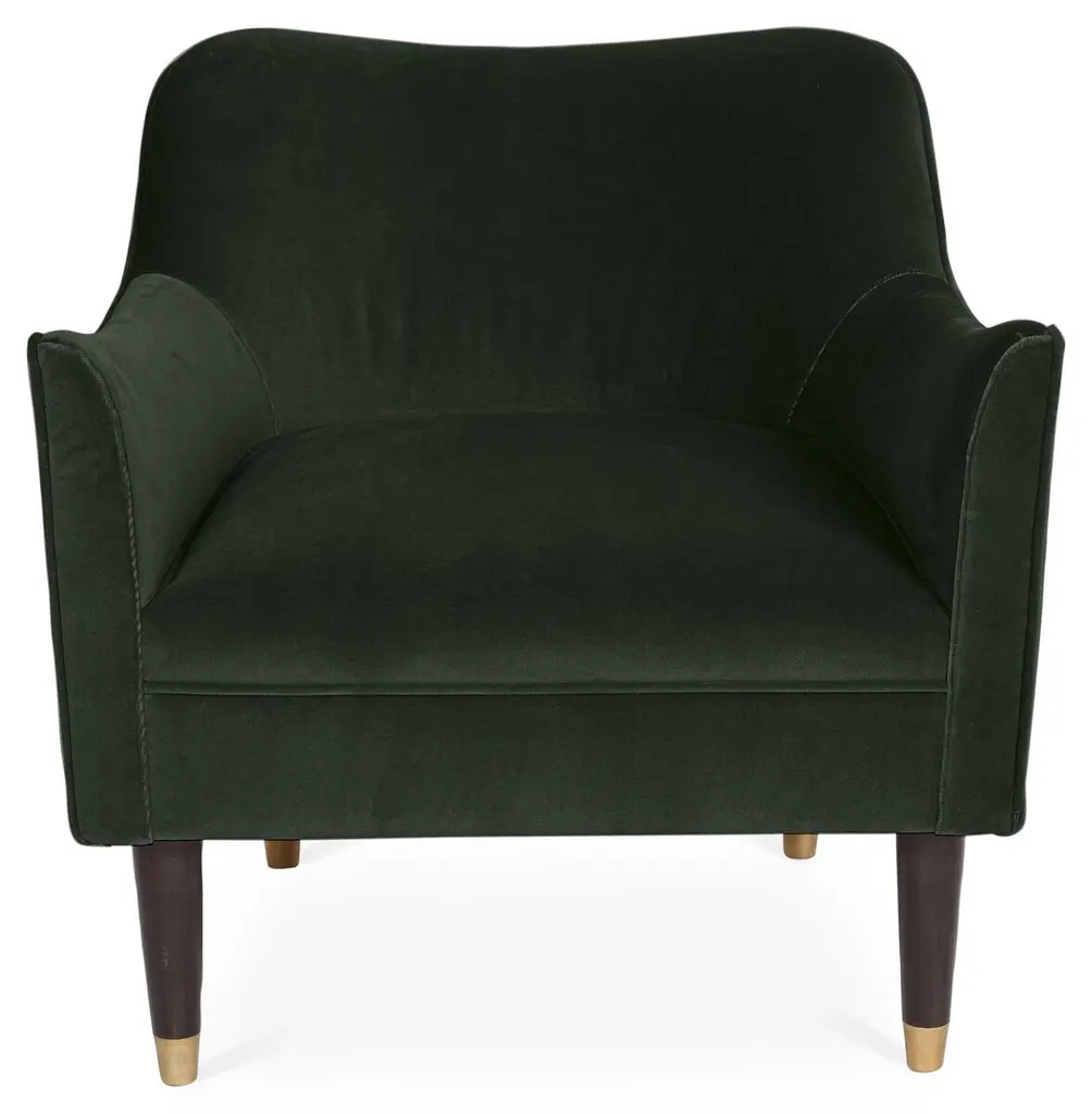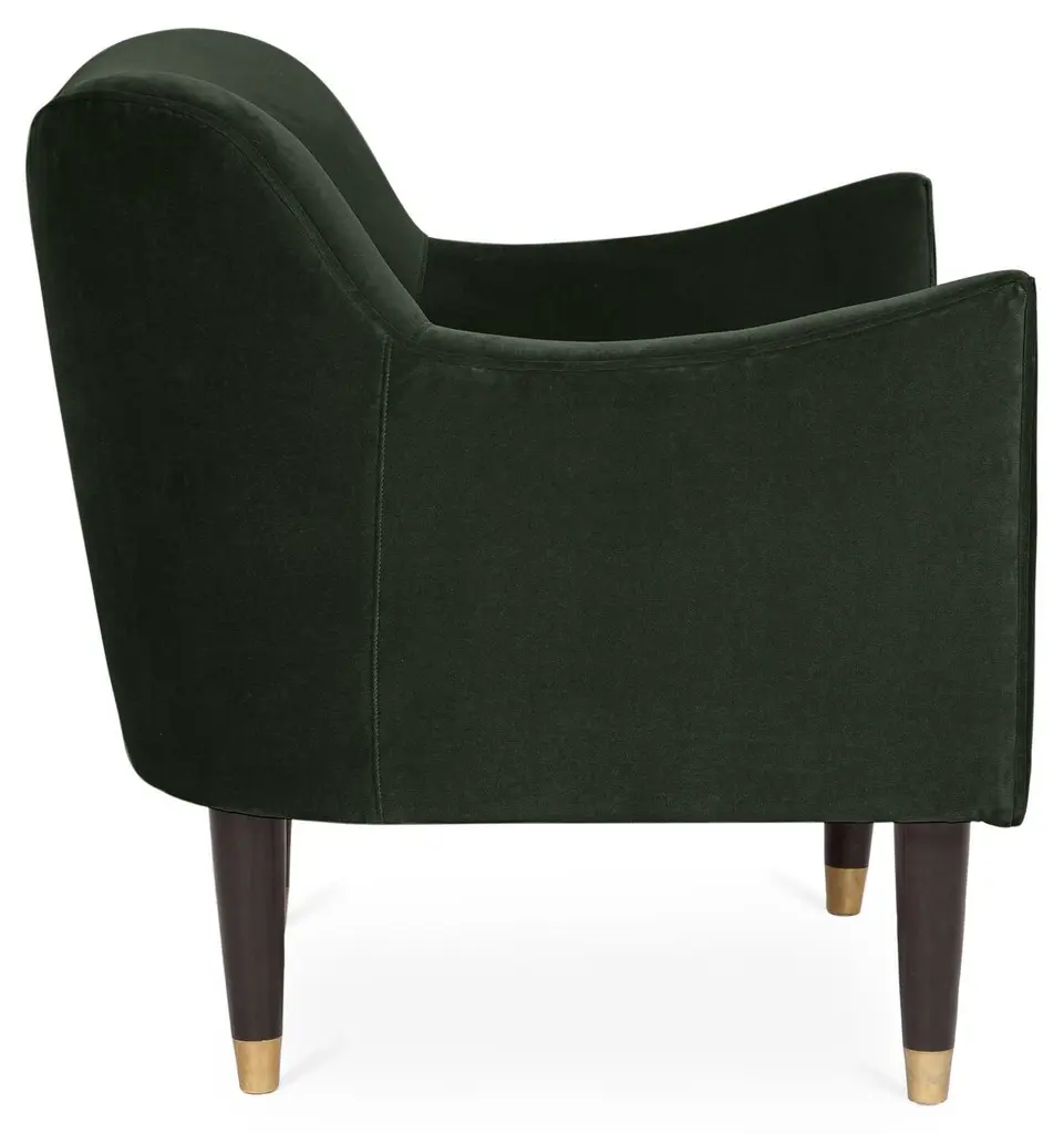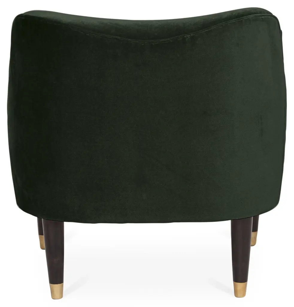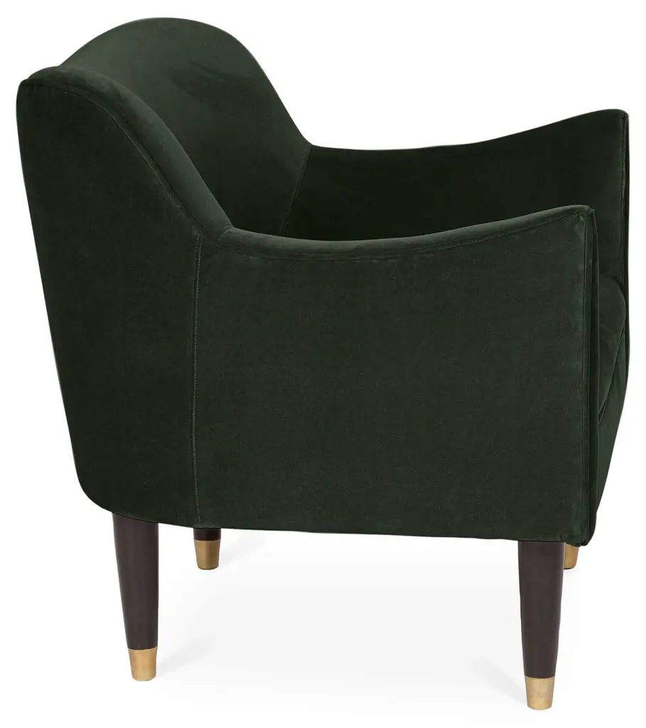 Available online exclusively at One Kings Lane: A sloping back and arms give this chair immediate visual appeal. It's masterfully crafted of alder wood with exposed, tapered legs that are capped with golden ferules. The dusty rose hue of the cotton velvet upholstery feels fresh and feminine and beautifully contrasts with the dark finish of the legs. A plush foam fill ensures long-lasting comfort. Handcrafted in Southern California.
