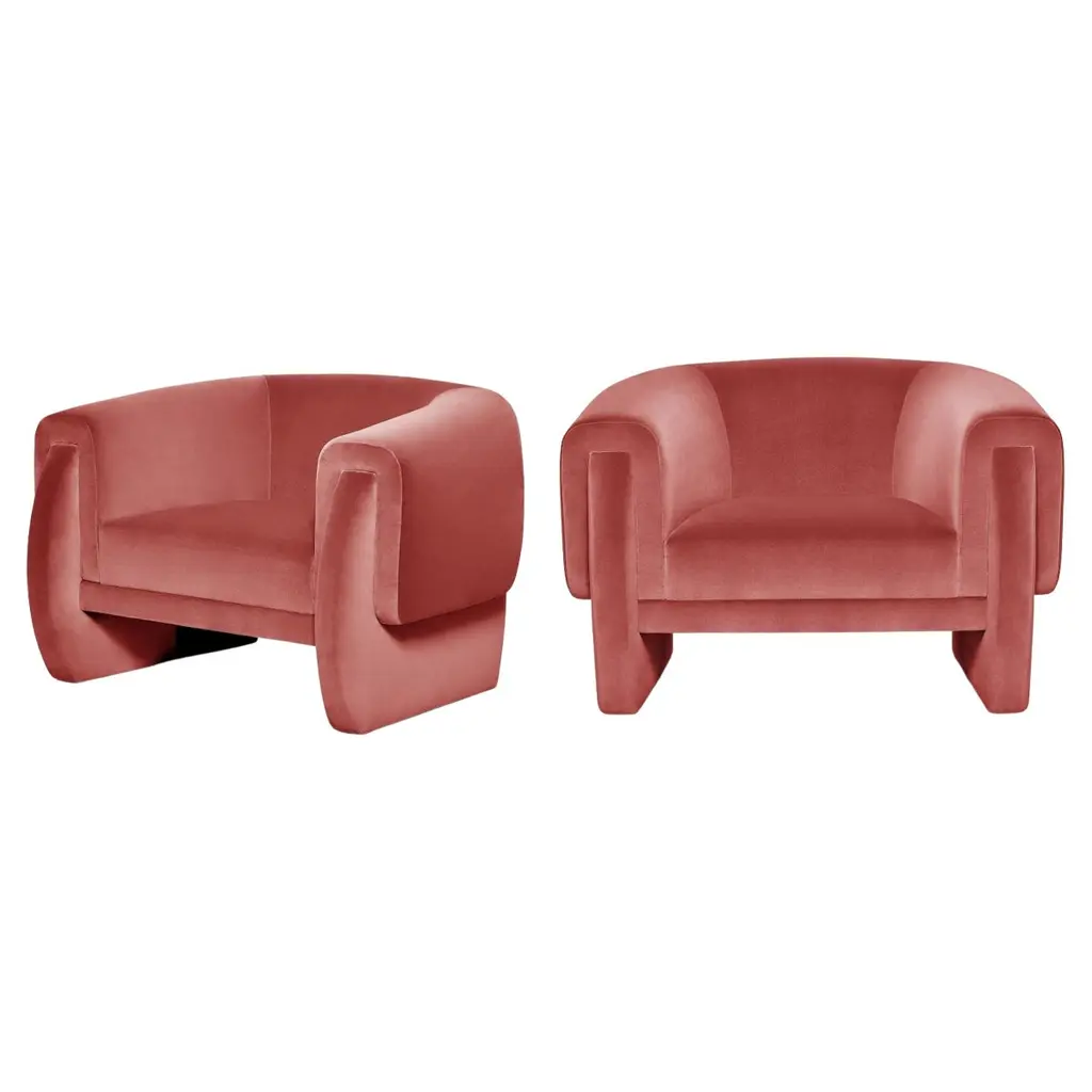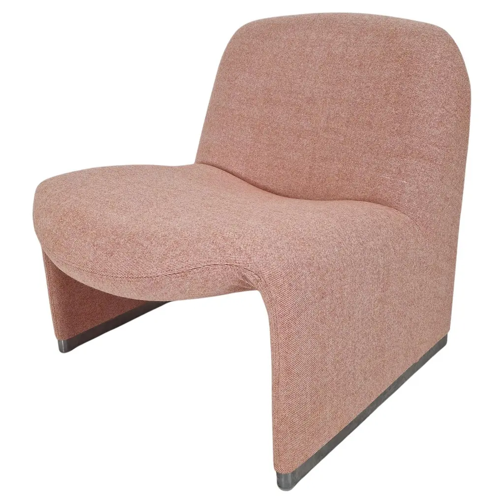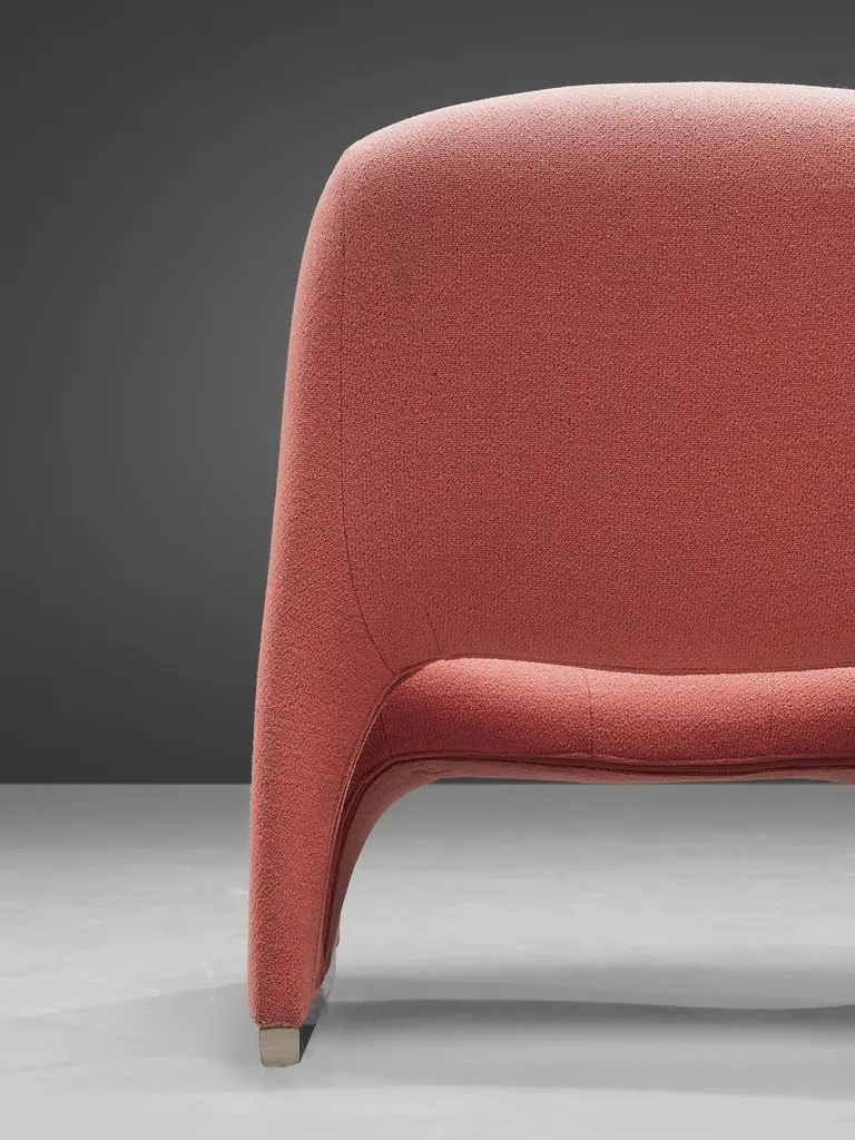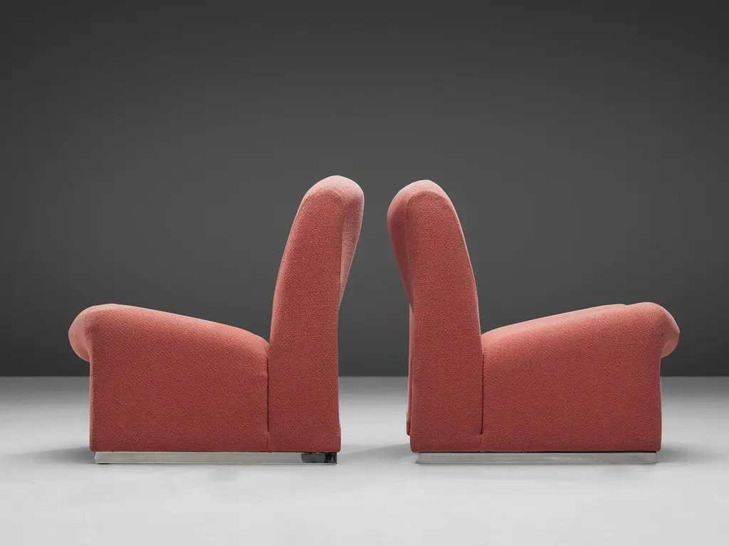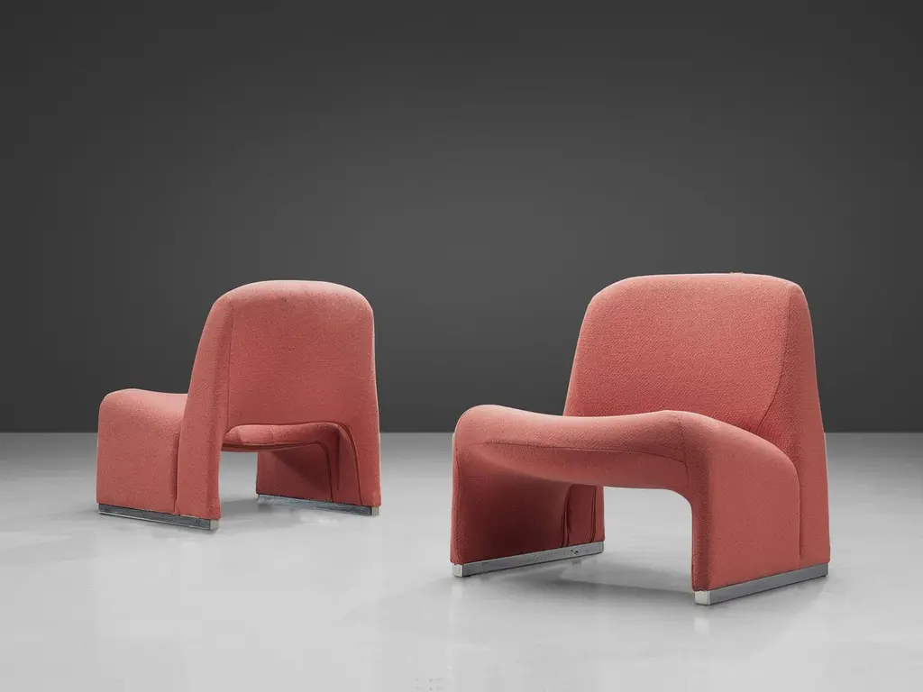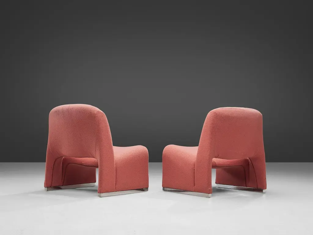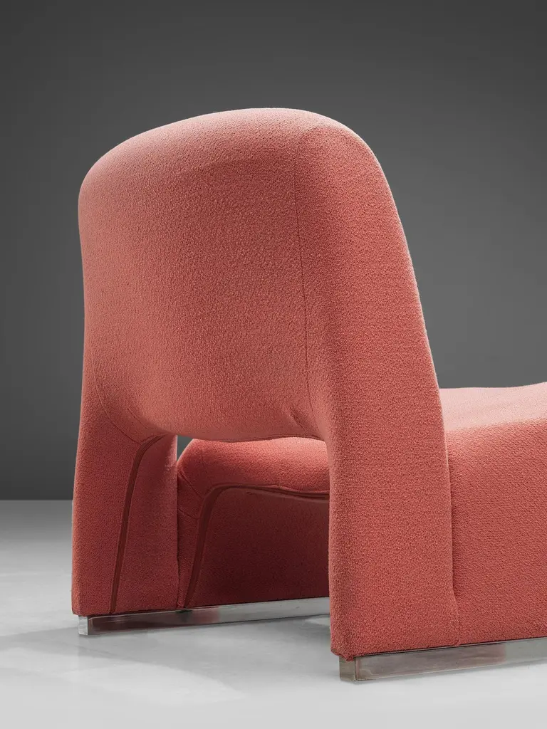 Lounge chairs, pink fabric, metal, Italy, 1970sThese lounge chairs strongly remind of Giancarlo Piretti’s ‘Alky’ lounge chair (1969), yet they feature characteristic differences. Whereas the ‘Alky’ lounge chair consists of one shell, these chairs have a beautiful gap between seat and backrest. Therefore a more light and airy expression is evoked. Like Piretti, also the designer of this version finished the legs with an aluminum frame to provide a strong line and strengthen the vivid look.Please note that the depicted photographs show an example of the way this item can be tailored to specific wishes of our clients. We kindly ask you to contact our design experts to discuss your wishes regarding upholstery and finishing. Your special requests can be realized by the experienced craftsmen and -women in our own in-house restoration and upholstery atelier. With high attention to the original, they make sure every piece retains its value and is ready for the many years to come. Please note that a custom-made reupholstered item has a lead-time of twelve to fourteen weeks. All to meet our high-quality standards. The price listed is per item.
