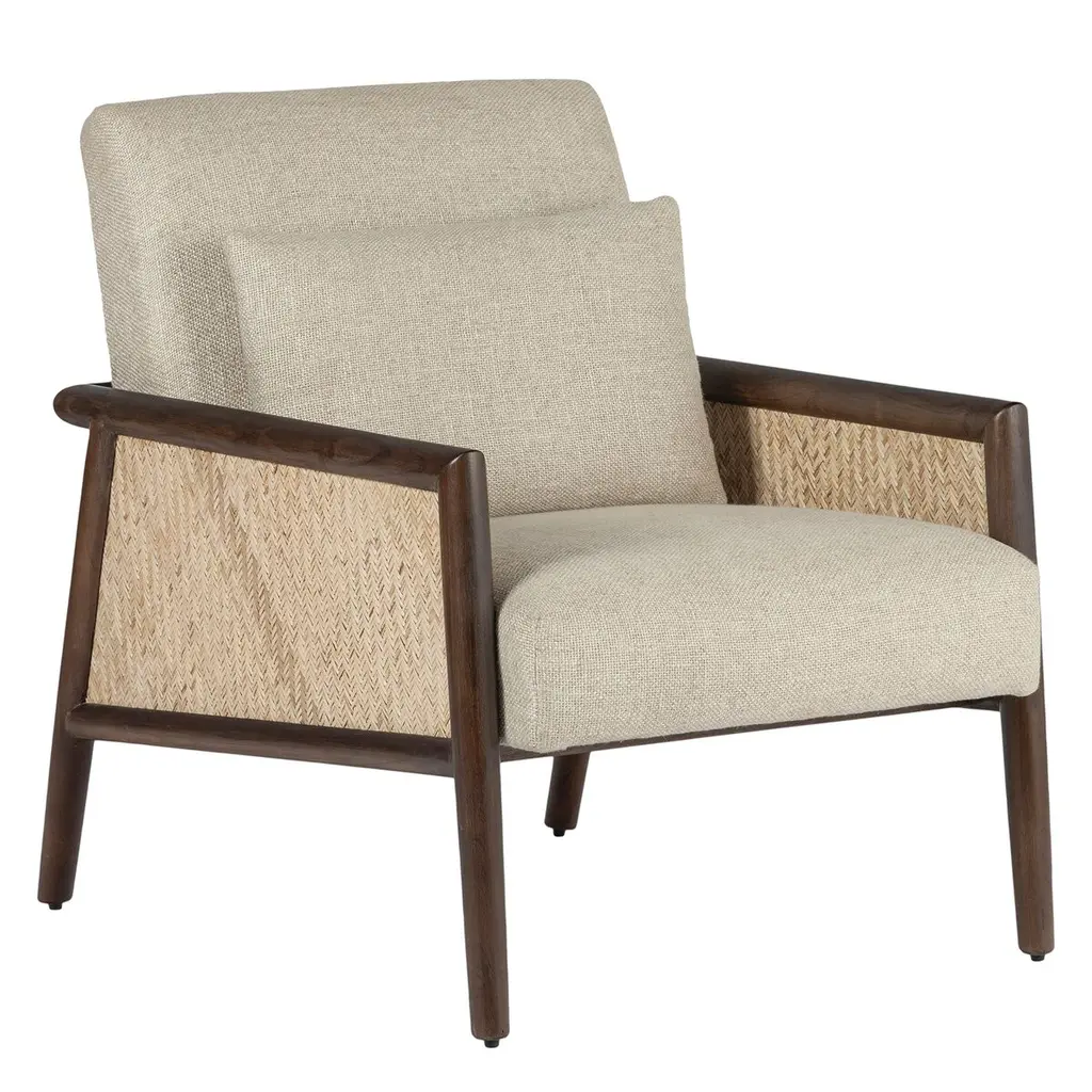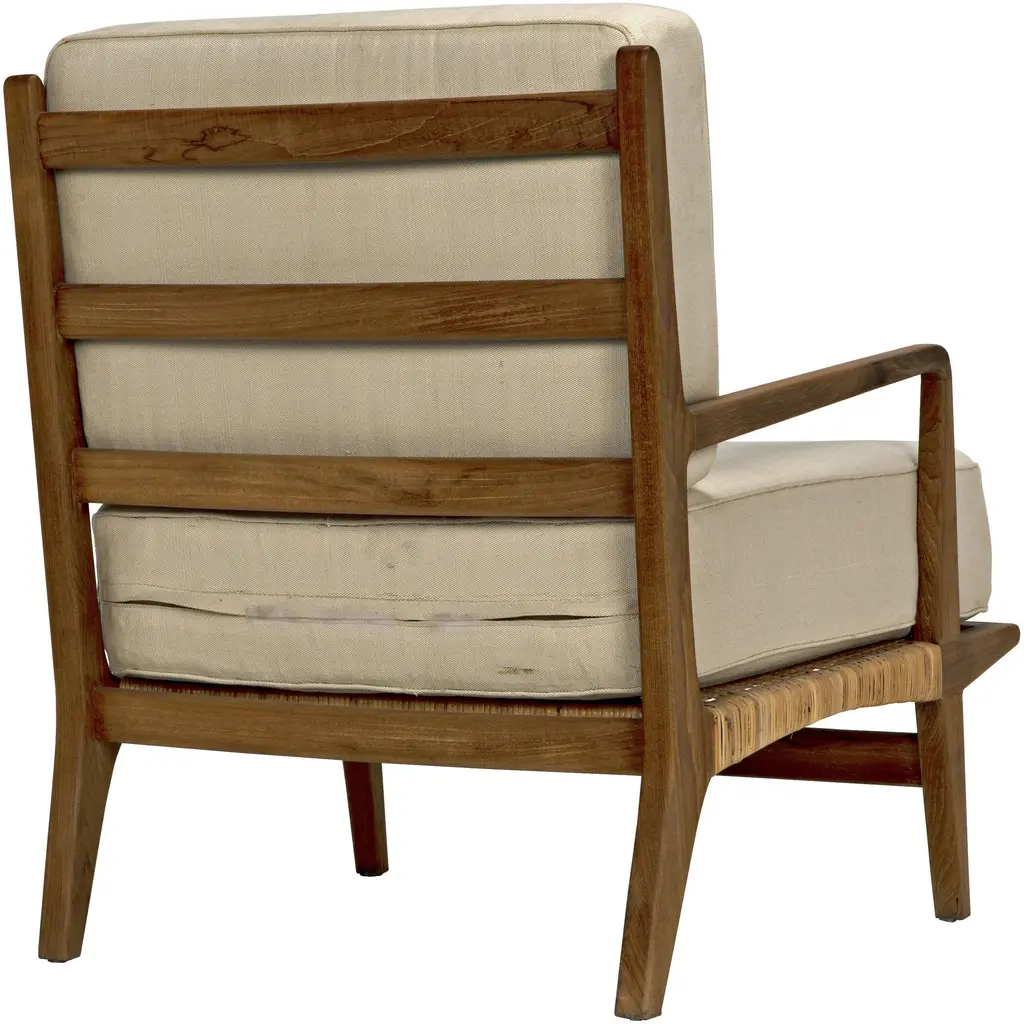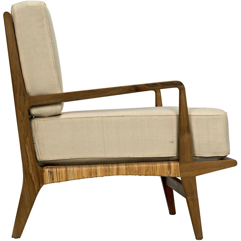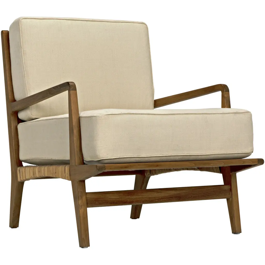 Comfort and style are synonymous in this striking armchair. 100% handcrafted, the frame is natural teak with mid-century modern inspired lines. The seat is enhanced with peeled rattan, the tapered legs and arms are minimalistic chic, and the cushions are soft white cotton.
