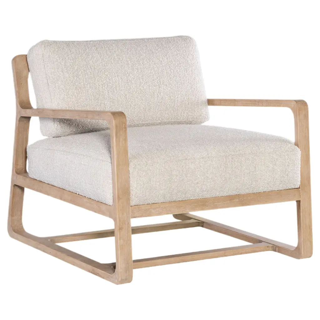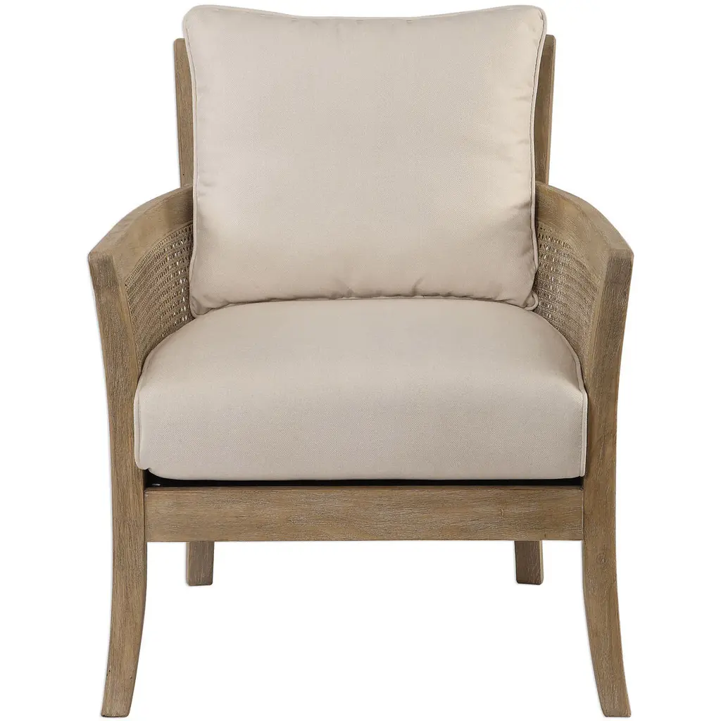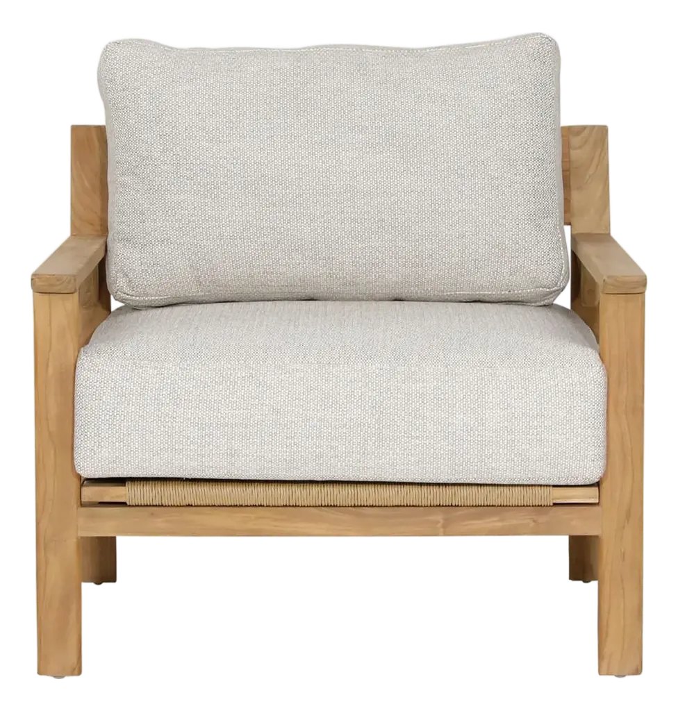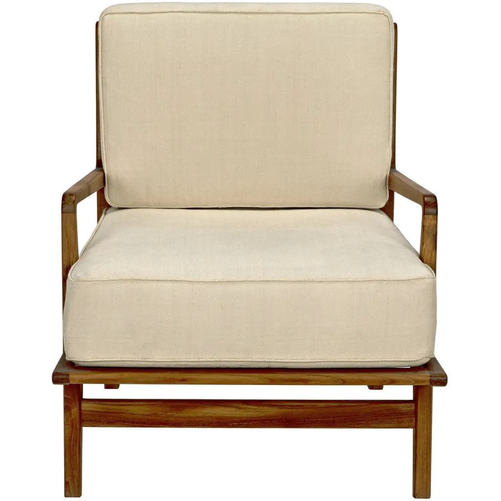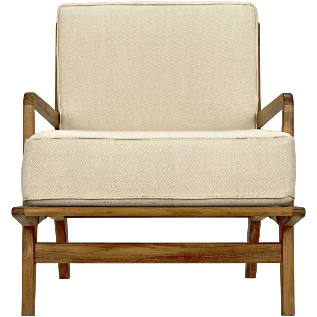 Comfort and style are synonymous in this striking armchair. 100% handcrafted, the frame is natural teak with mid-century modern inspired lines. The seat is enhanced with peeled rattan, the tapered legs and arms are minimalistic chic, and the cushions are soft white cotton.