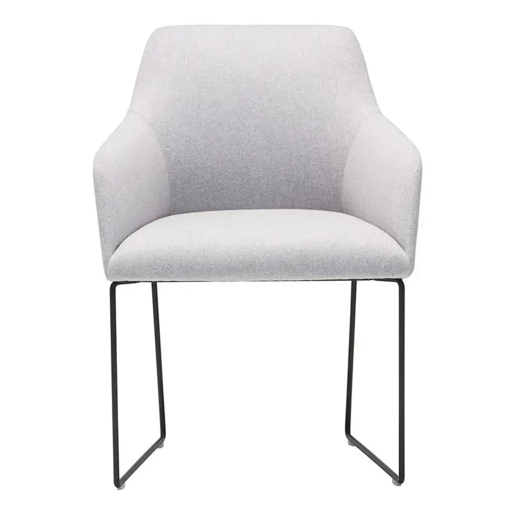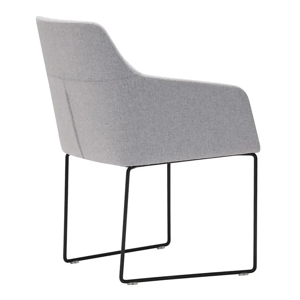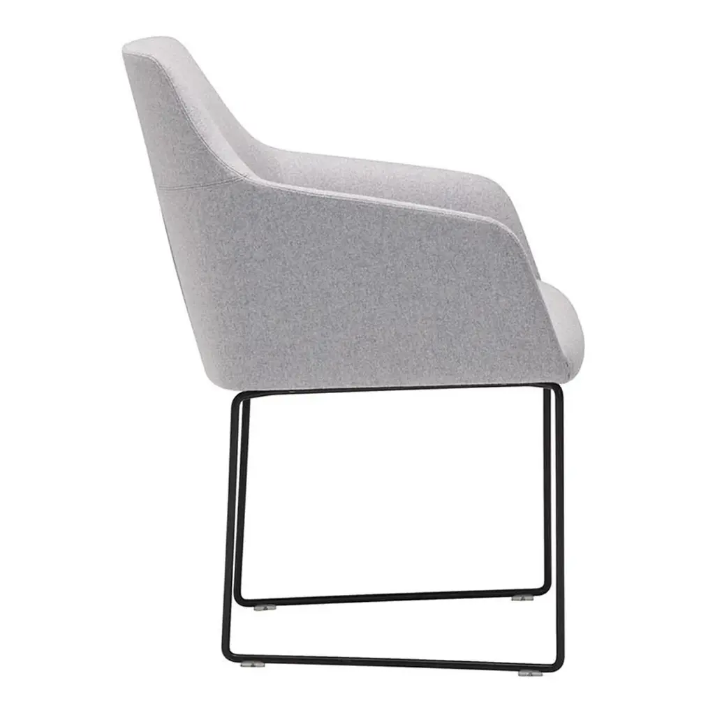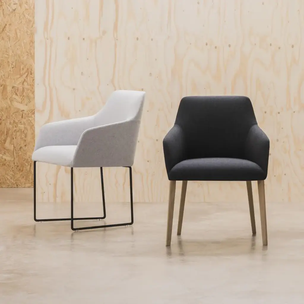 Armchair with upholstered seat and backrest, steel sled base finished in polished chrome, white or black. Alya is a collection of fully upholstered lounge chairs with solid wood or metal bases. Its serene silhouette embraces the body, inviting you to relax into its form. The Alya is born from the lounge chair archetype, but from a completely modern perspective. The design was developed from an ergonomic perspective and is suitable for contract spaces and residential areas alike thanks to its high versatility and two backrest options.