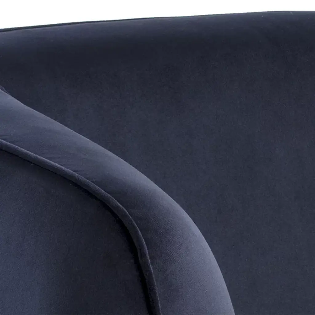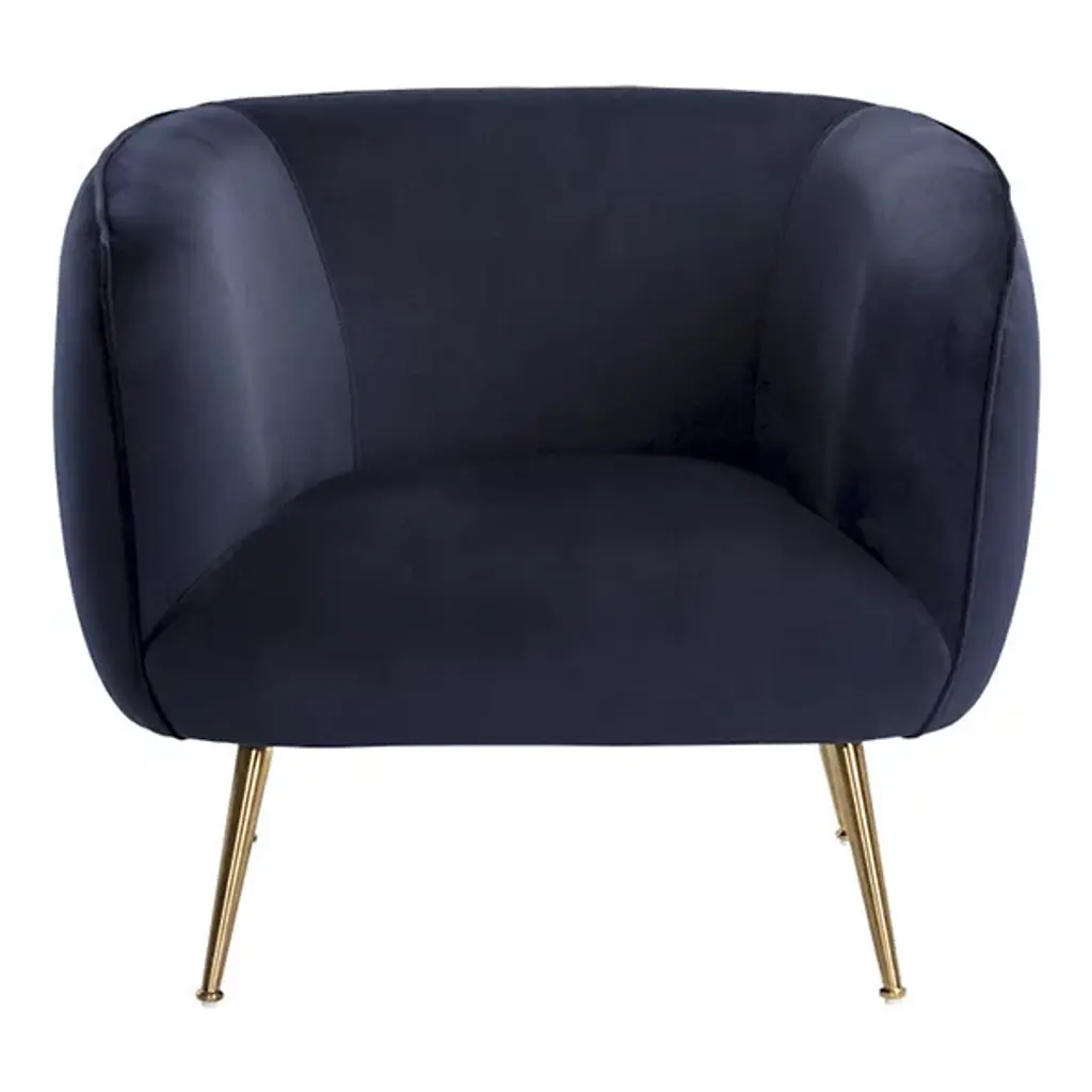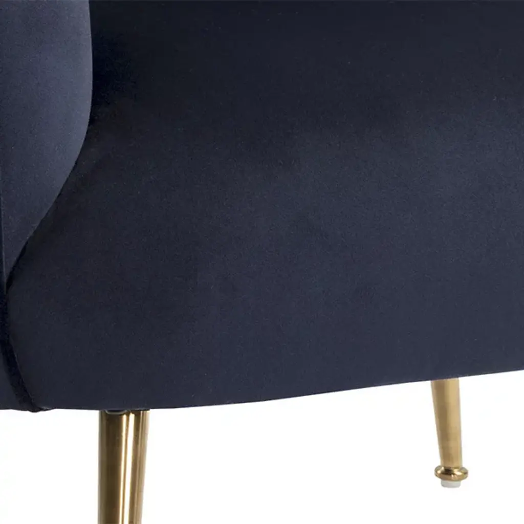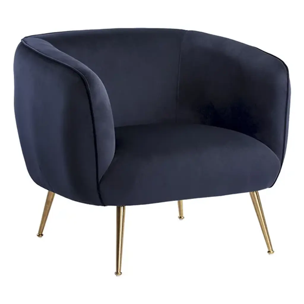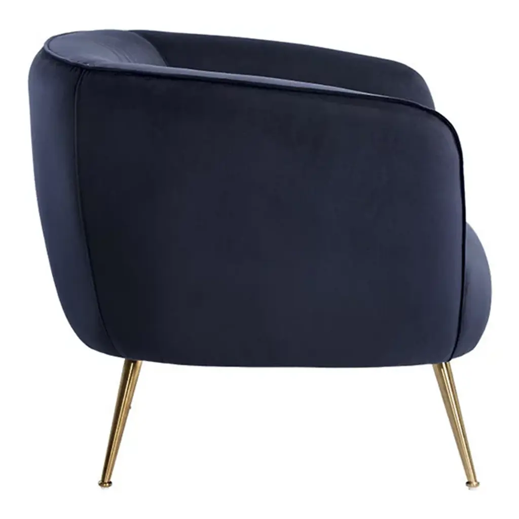 Charming curves wrap the tailored navy fabric around The elevated midcentury modern Amara Lounge Chair from Sunpan A sweeping armchair silhouette, plushly upholstered beneath the fabric, relaxes on tapered stainless steel legs plated in gold, elevating its design in a light, luxurious appeal. The seat is sleekly sophisticated, its curving contours and sleek legs contrasting well with each other and paring magnificently with other retro-modern seating with its artfully shaped profile.