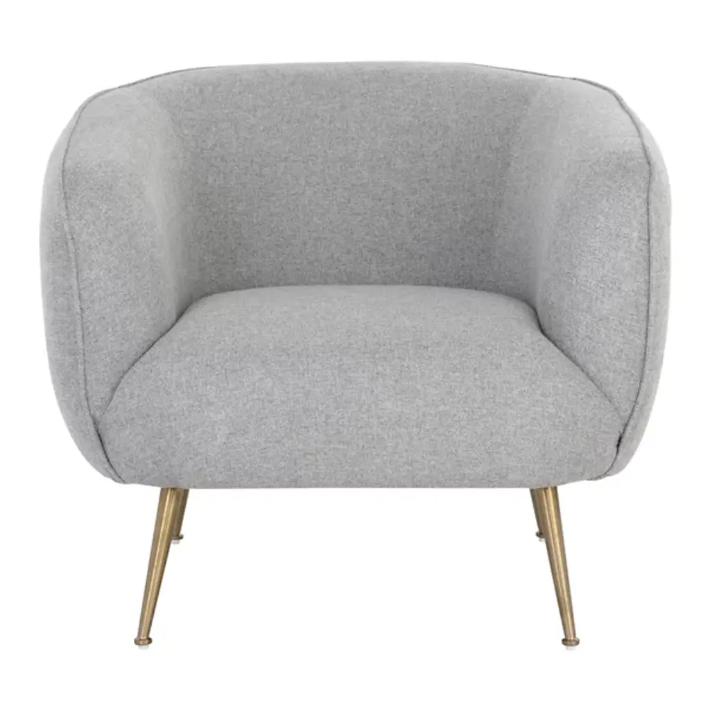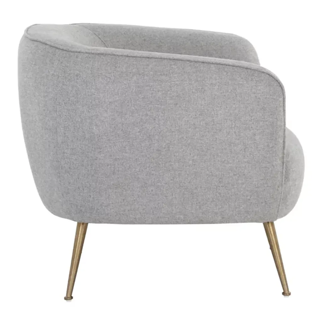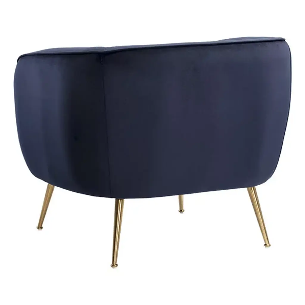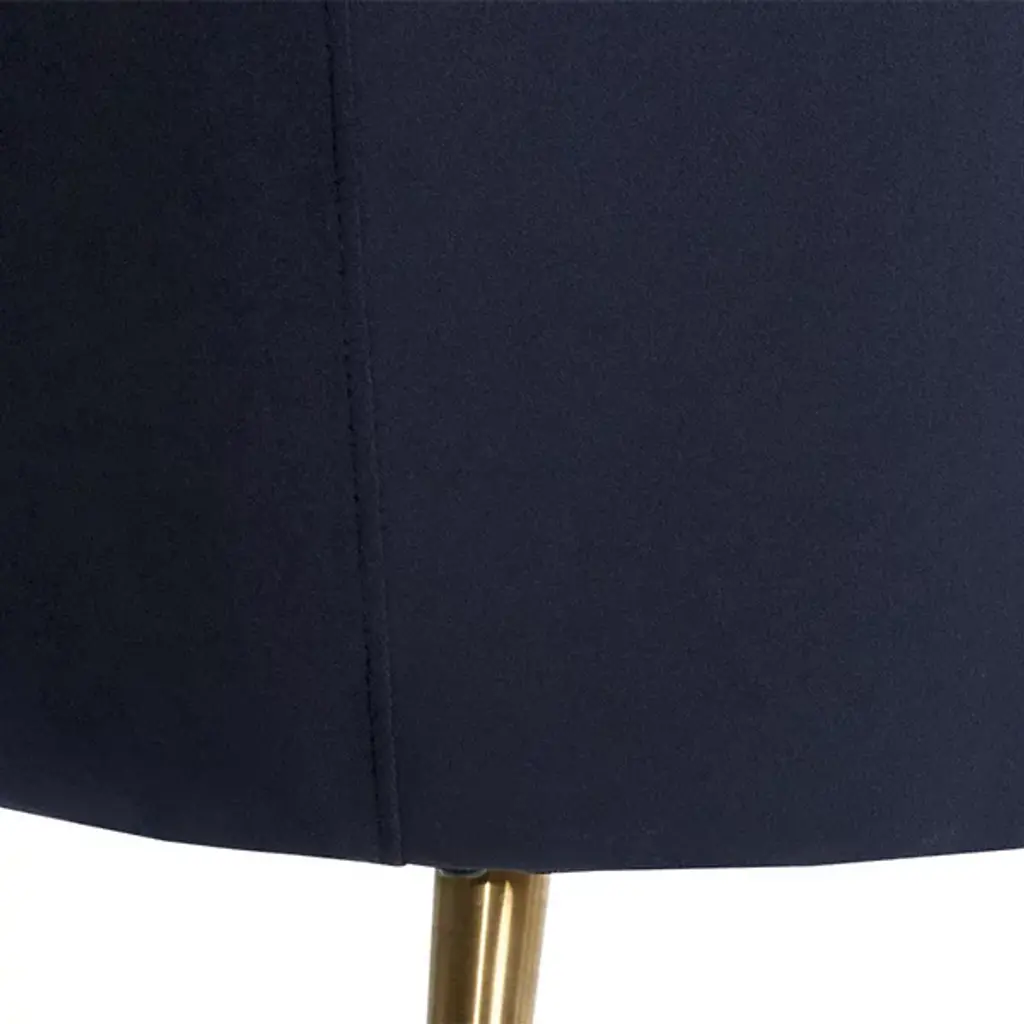 Charming curves wrap the tailored navy fabric around The elevated midcentury modern Amara Lounge Chair from Sunpan A sweeping armchair silhouette, plushly upholstered beneath the fabric, relaxes on tapered stainless steel legs plated in gold, elevating its design in a light, luxurious appeal. The seat is sleekly sophisticated, its curving contours and sleek legs contrasting well with each other and paring magnificently with other retro-modern seating with its artfully shaped profile.