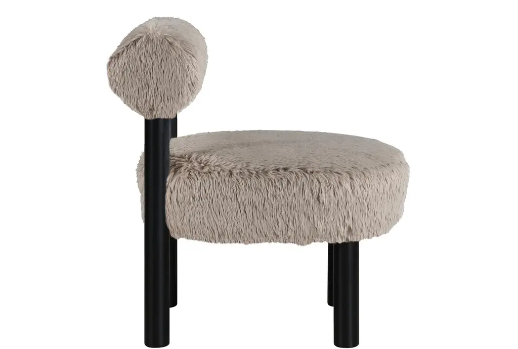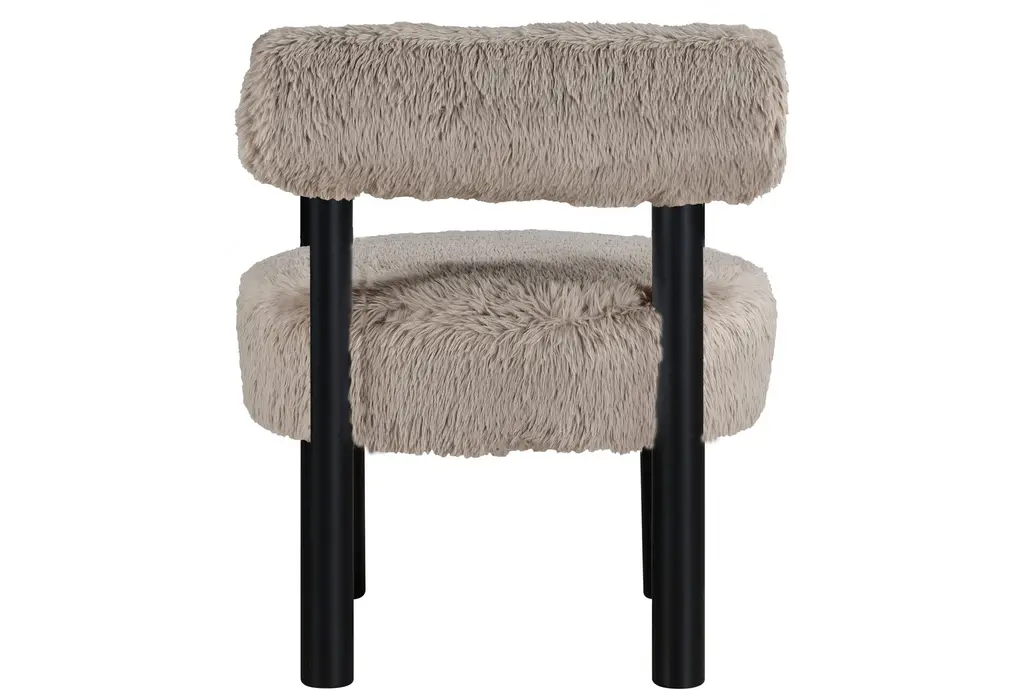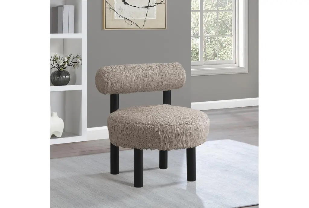 The Ambre Beige Vegan Shearling Fabric Upholstered Accent Chair brings plush, comfort-forward seating to your living room with a rounded seat and a supportive backrest. Upholstered in vegan shearling fabric over resilient foam, it pairs tactile warmth with easy care. Black rubberwood legs provide a stable base while keeping a compact footprint that fits apartments or reading nooks. The sculptural silhouette offers tactile interest and versatile function for lounging or layering into your seating area.