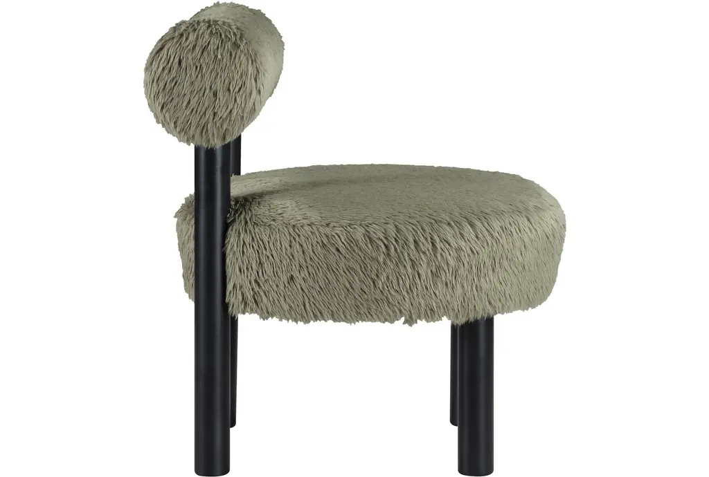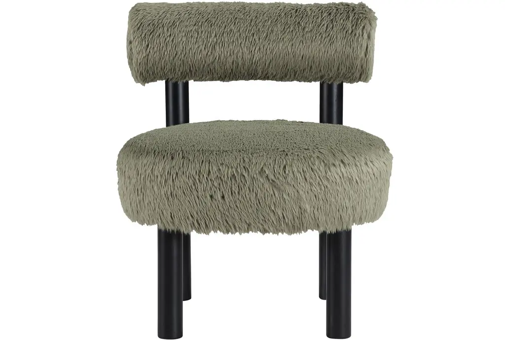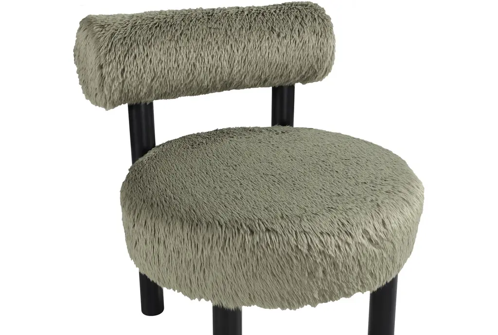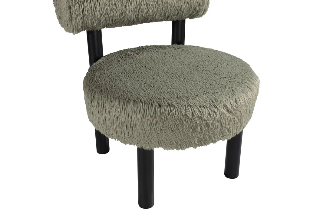 Ambre Green Vegan Shearling Fabric Upholstered Accent Chair brings a modern, comfort-forward presence with a plush rounded seat and a low cylindrical back that supports relaxed sitting. Upholstered in green vegan shearling fabric with foam fill, it delivers cloud-like seating and everyday resilience. rubberwood legs in black provide stable support and a crisp contrast, while the chair's compact, sculptural form adapts easily to living room seating or a bedside accent.