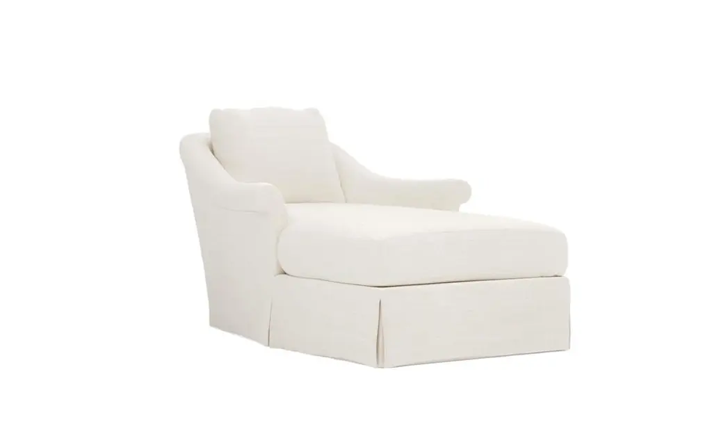 A Kathy Kuo Home exclusive, our Amelie chaise is the ultimate luxury in a gracious primary bedroom or living room. The seat cushion offers EXTRAORDINARY COMFORT, with a foam core surrounded by a blend of feathers and duck down. You won’t want to get up from its cozy seat. With flared roll arms, a skirted base, and a gently curved, subtly tapered back, the French silhouette is beautiful from every angle. Choose from a variety of upholstery options, including linen and performance fabrics.