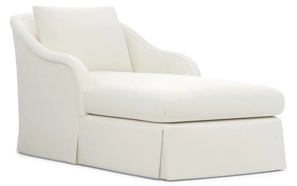 A Kathy Kuo Home exclusive, our Amelie chaise is the ultimate luxury in a gracious primary bedroom or living room. The seat cushion offers EXTRAORDINARY COMFORT, with a foam core surrounded by a blend of feathers and duck down. You won’t want to get up from its cozy seat. With flared roll arms, a skirted base, and a gently curved, subtly tapered back, the French silhouette is beautiful from every angle. Choose from a variety of upholstery options, including linen and performance fabrics.