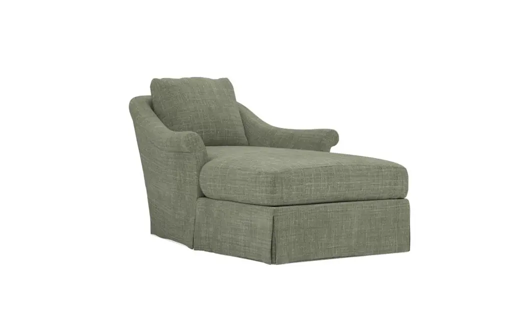 A Kathy Kuo Home exclusive, our Amelie chaise is the ultimate luxury in a gracious primary bedroom or living room. The seat cushion offers EXTRAORDINARY COMFORT, with a foam core surrounded by a blend of feathers and duck down. You won’t want to get up from its cozy seat. With flared roll arms, a skirted base, and a gently curved, subtly tapered back, the French silhouette is beautiful from every angle. Choose from a variety of upholstery options, including linen and performance fabrics.
