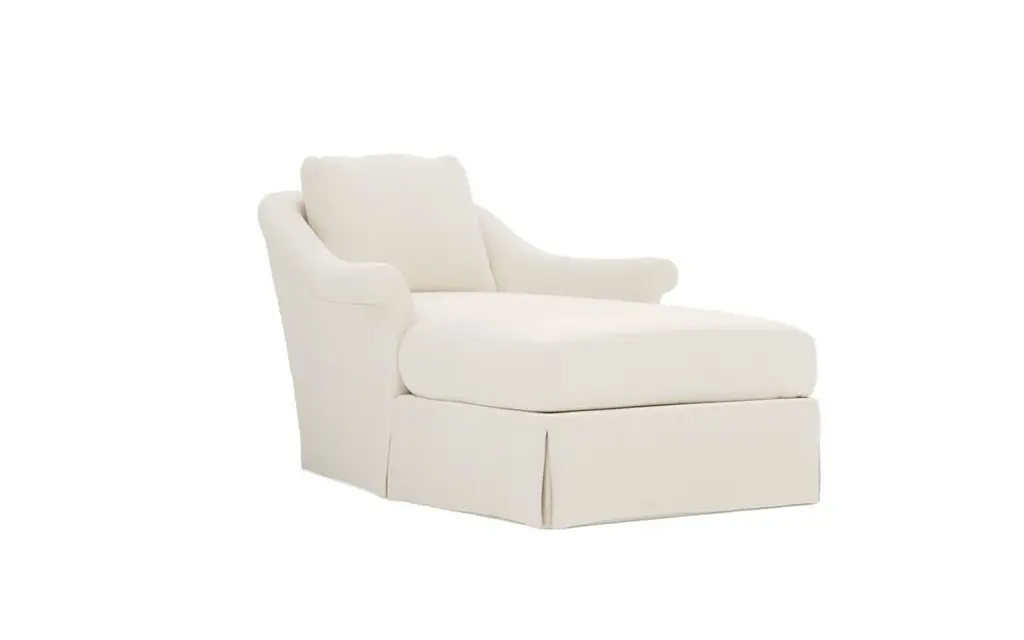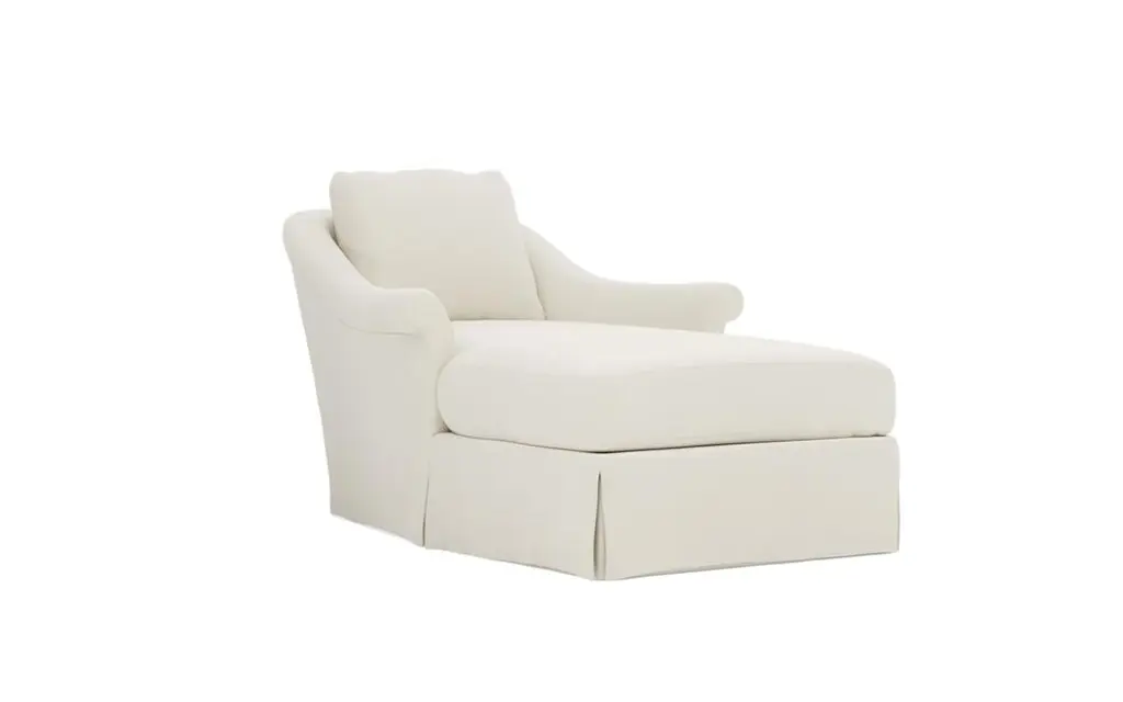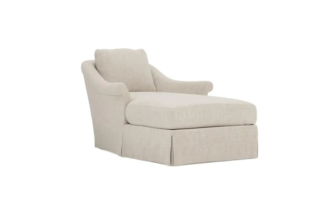 A Kathy Kuo Home exclusive, our Amelie chaise is the ultimate luxury in a gracious primary bedroom or living room. The seat cushion offers EXTRAORDINARY COMFORT, with a foam core surrounded by a blend of feathers and duck down. You won’t want to get up from its cozy seat. With flared roll arms, a skirted base, and a gently curved, subtly tapered back, the French silhouette is beautiful from every angle. Choose from a variety of upholstery options, including linen and performance fabrics.