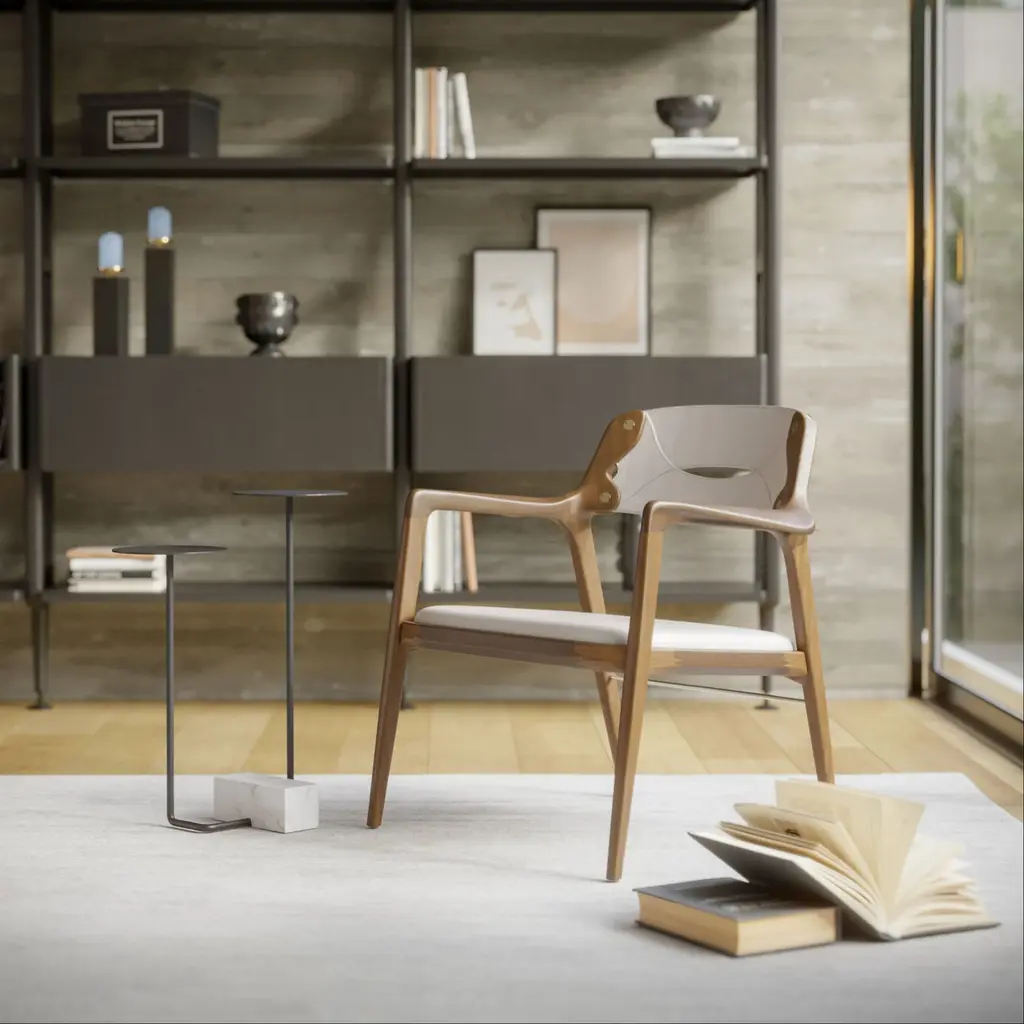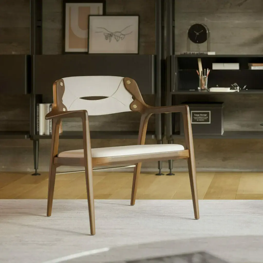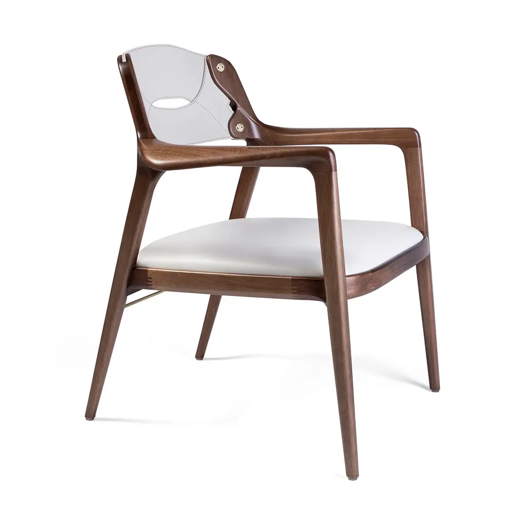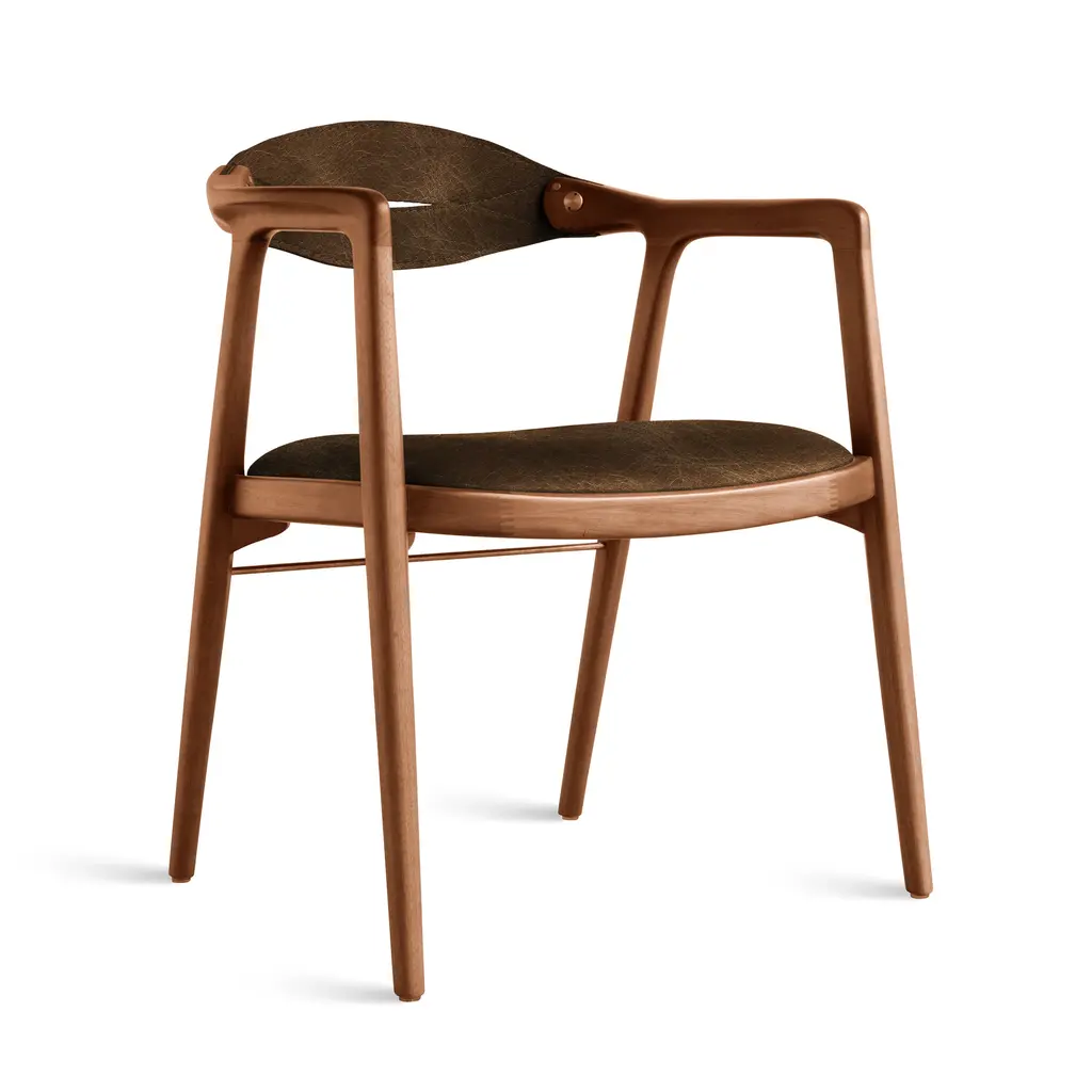 Indulge in ultimate comfort and style with the Angela Lounge Chair from Sossego. Handcrafted from sustainably harvested Brazilian hardwood, this modern piece features a generous and luxurious design. Its mixed-media elements of rich wood, thick leather back, and metallic accents exude sophistication, making it a best-seller. Plus, with each purchase, a tree is planted in Brazil to preserve our planet's resources. Highlights