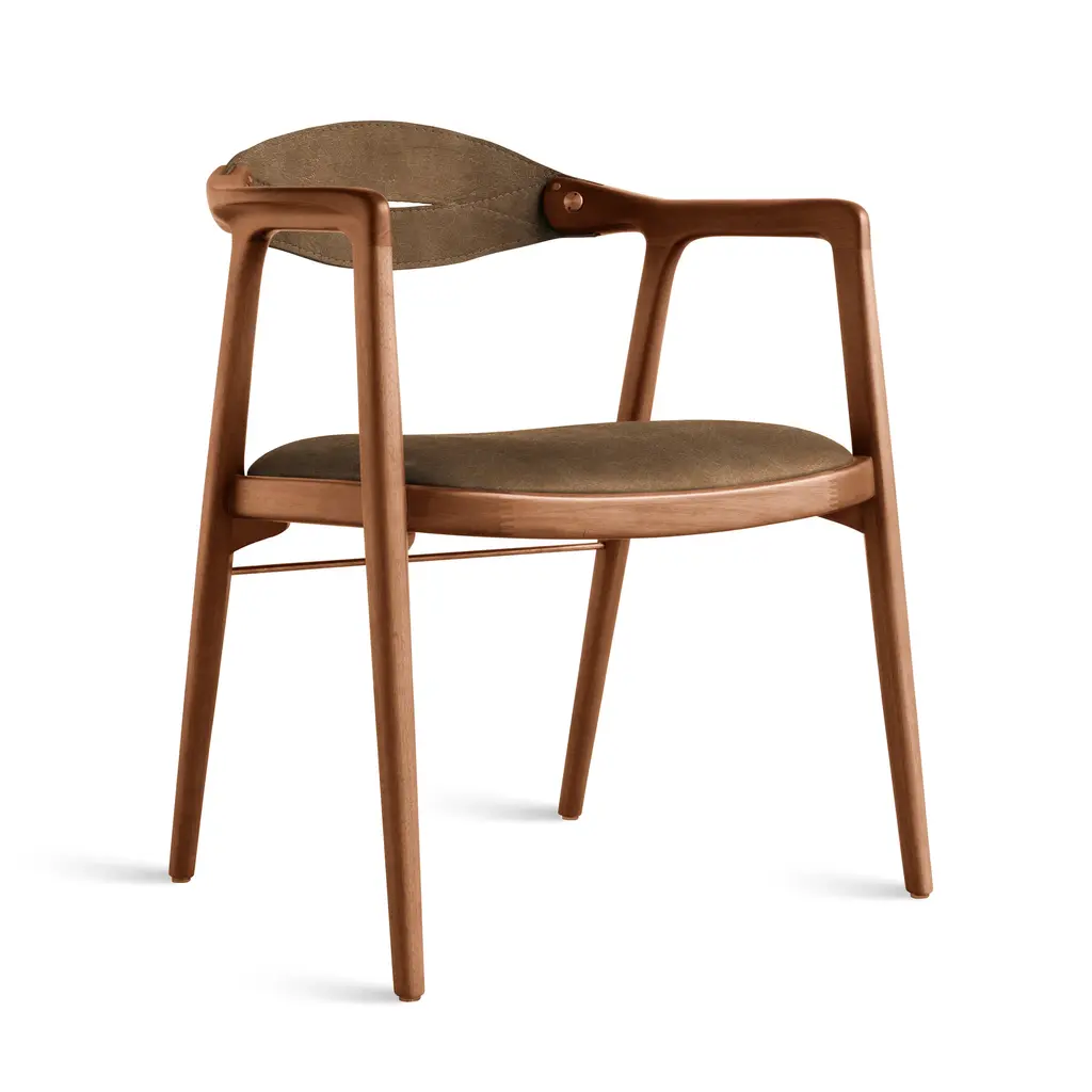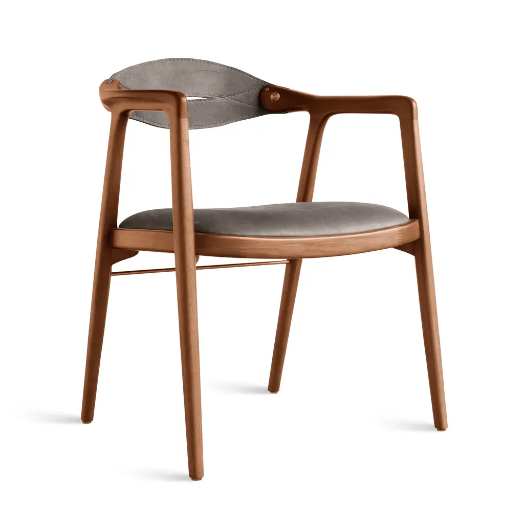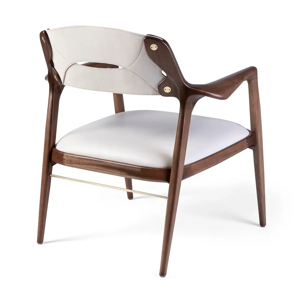 Indulge in ultimate comfort and style with the Angela Lounge Chair from Sossego. Handcrafted from sustainably harvested Brazilian hardwood, this modern piece features a generous and luxurious design. Its mixed-media elements of rich wood, thick leather back, and metallic accents exude sophistication, making it a best-seller. Plus, with each purchase, a tree is planted in Brazil to preserve our planet's resources. Highlights